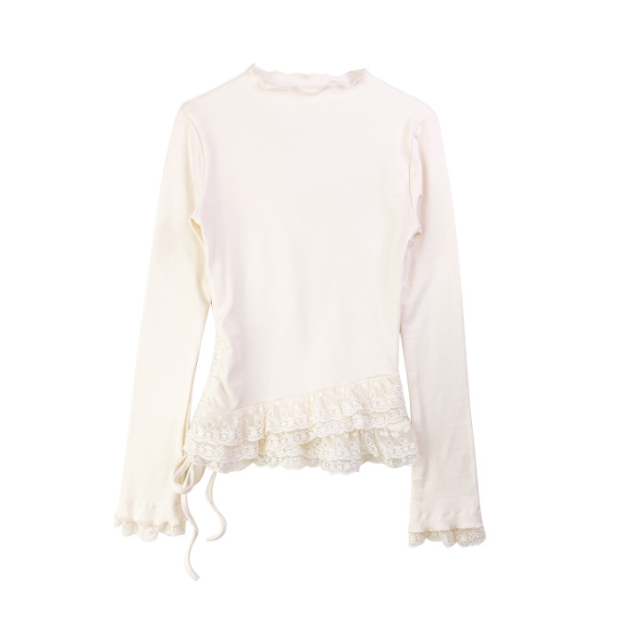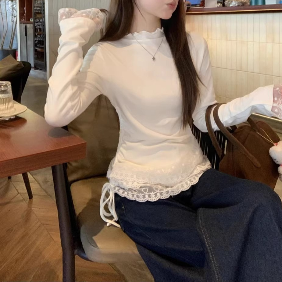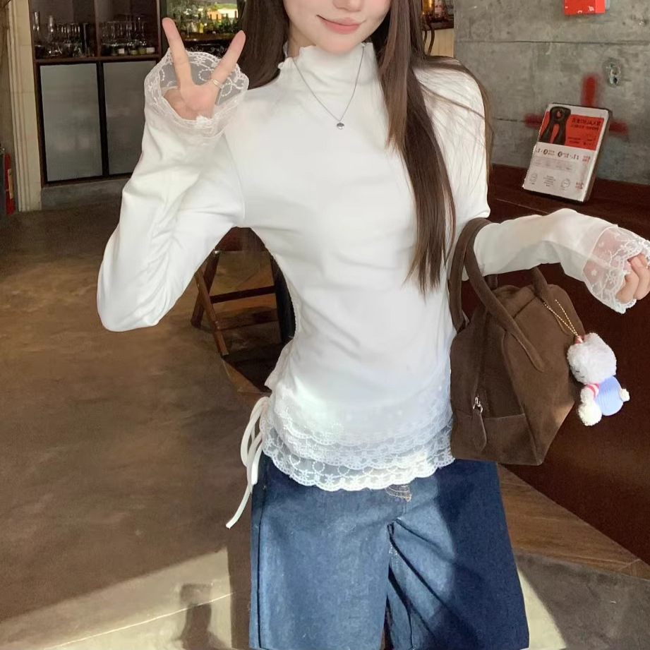 원피스 가을 겨울 따뜻한 이너웨어 280g 독일 벨벳 레이스 하프 터틀넥 긴팔 티셔츠 여성 틈새 레이스 업 탑