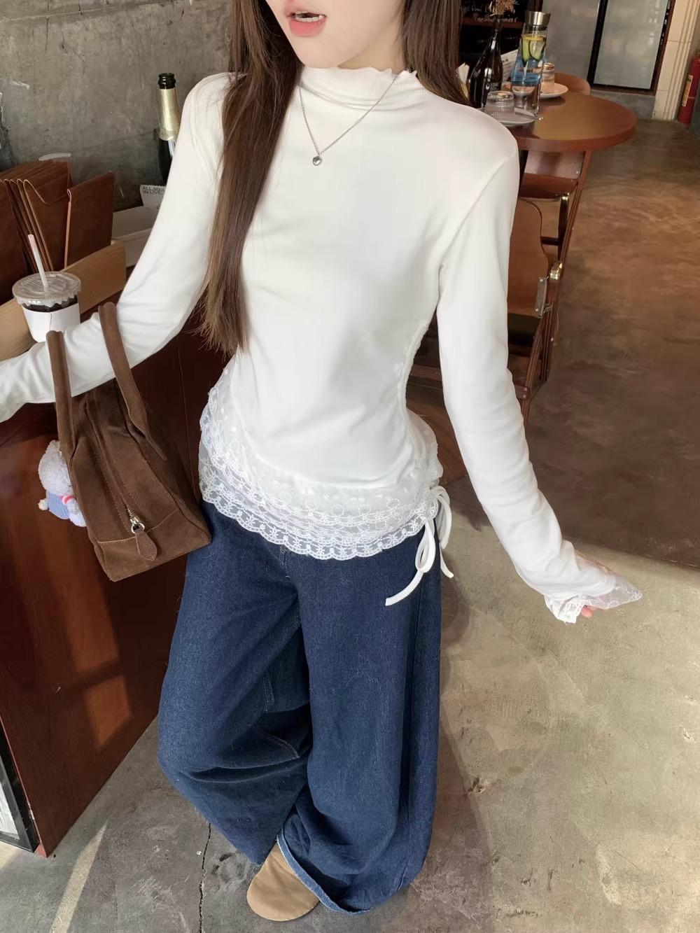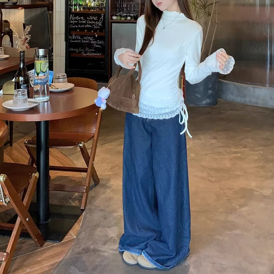 원피스 가을 겨울 따뜻한 이너웨어 280g 독일 벨벳 레이스 하프 터틀넥 긴팔 티셔츠 여성 틈새 레이스 업 탑스토어 가기