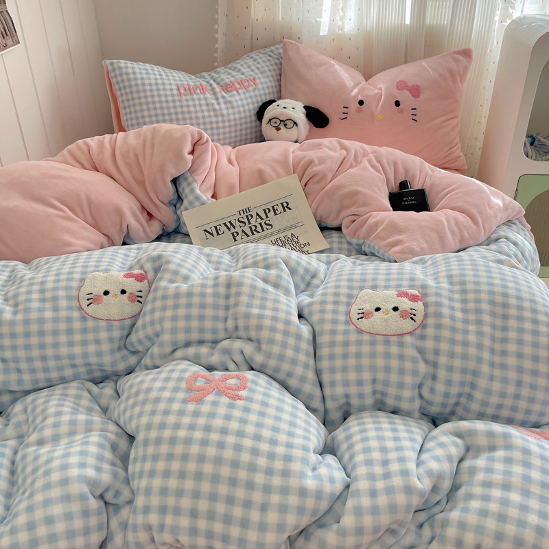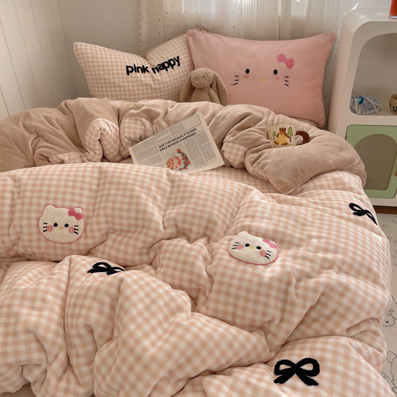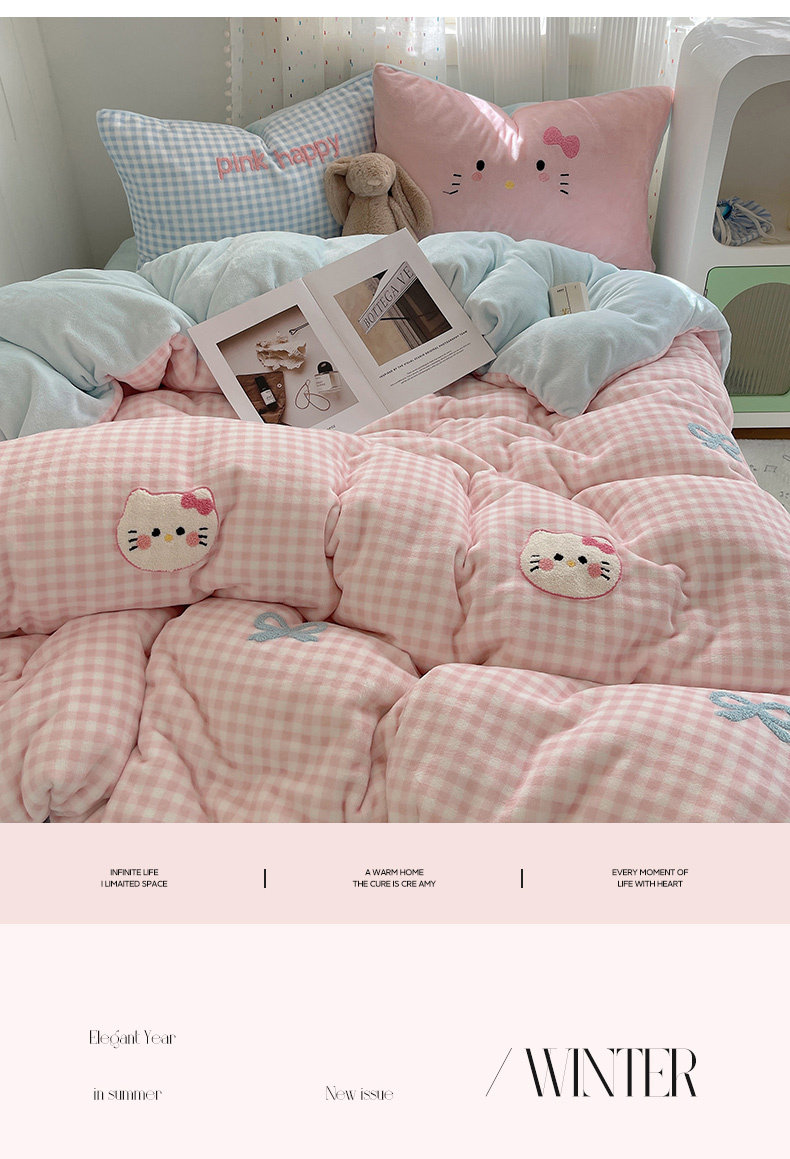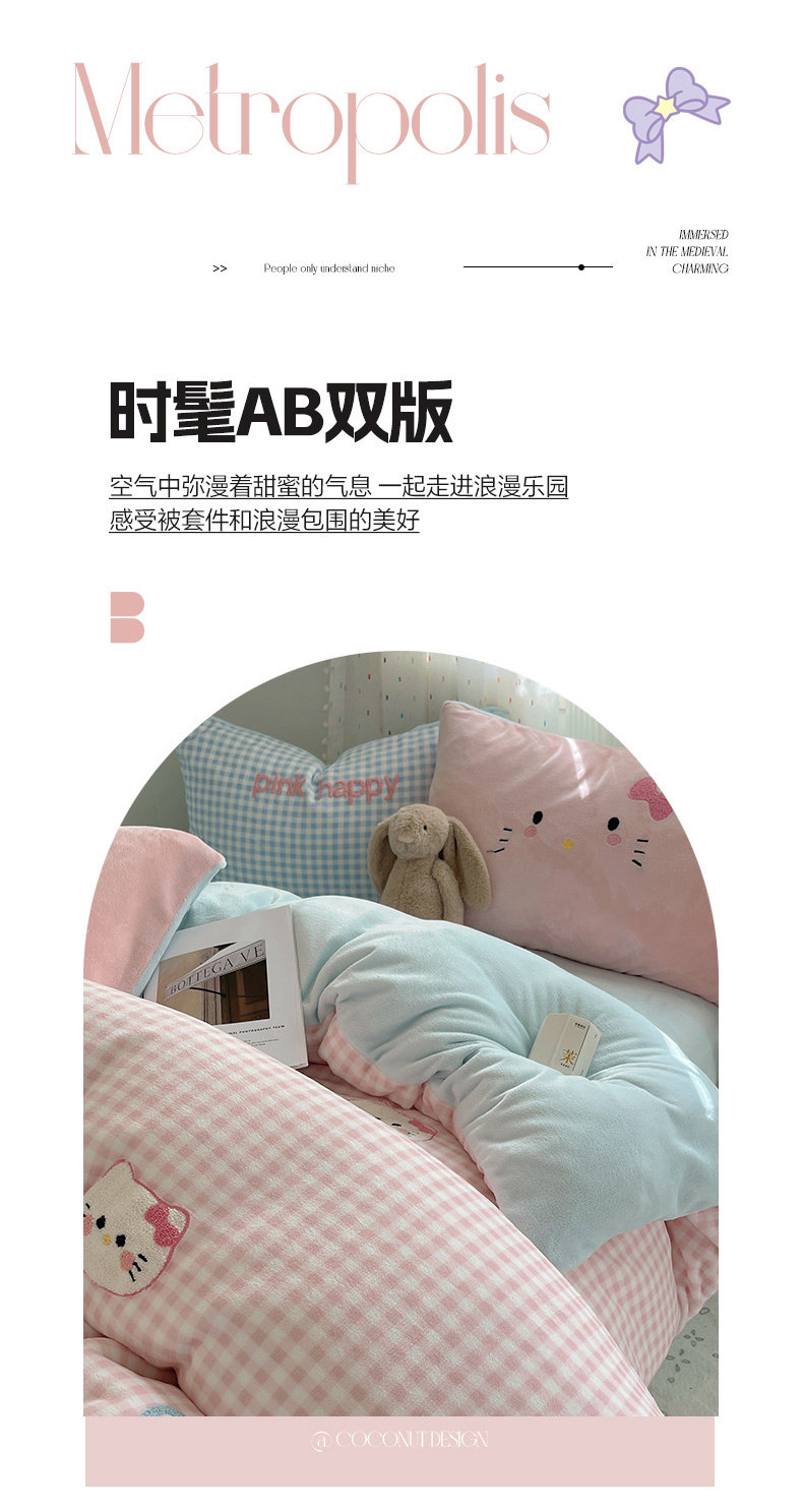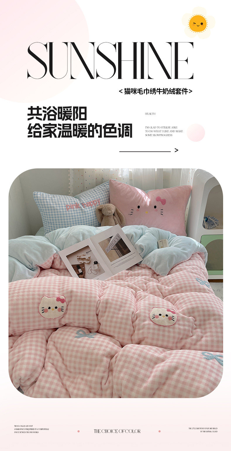 만화 Kt 고양이 수건 자수 4 피스 세트 2024 새로운 겨울 퀼트 커버 두꺼운 우유 산호 양털 침대 시트 기숙사 3
