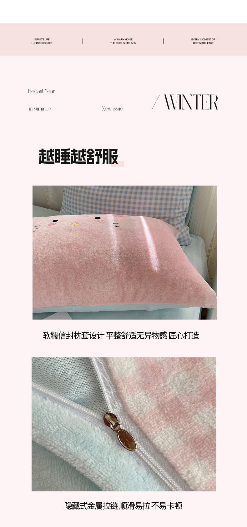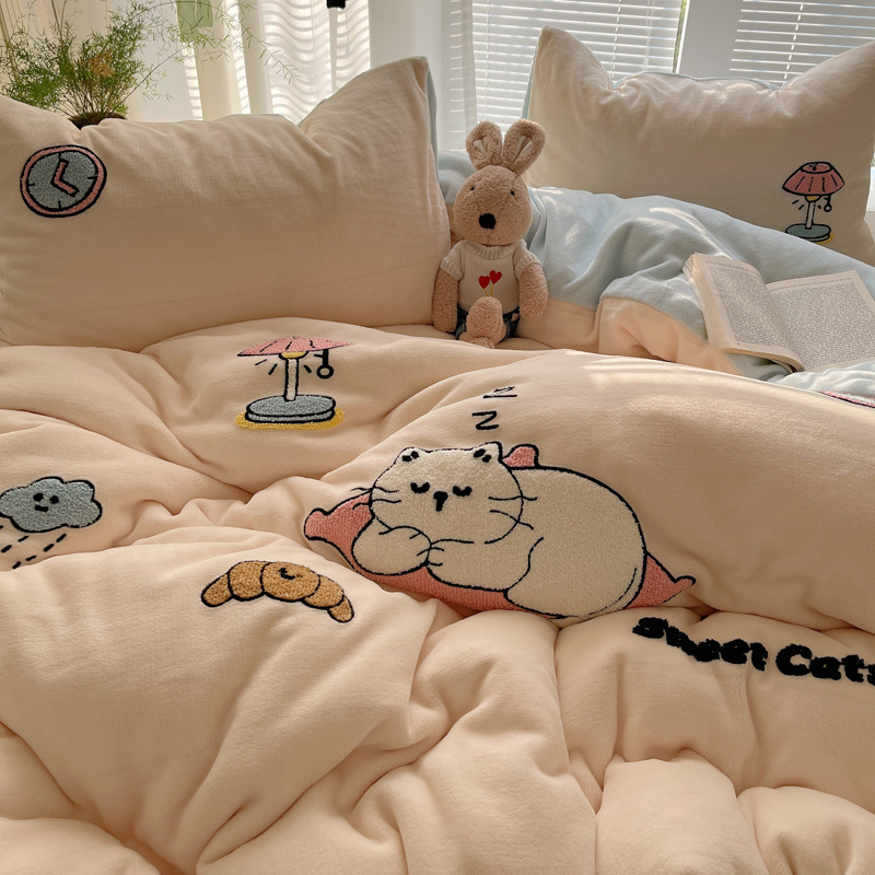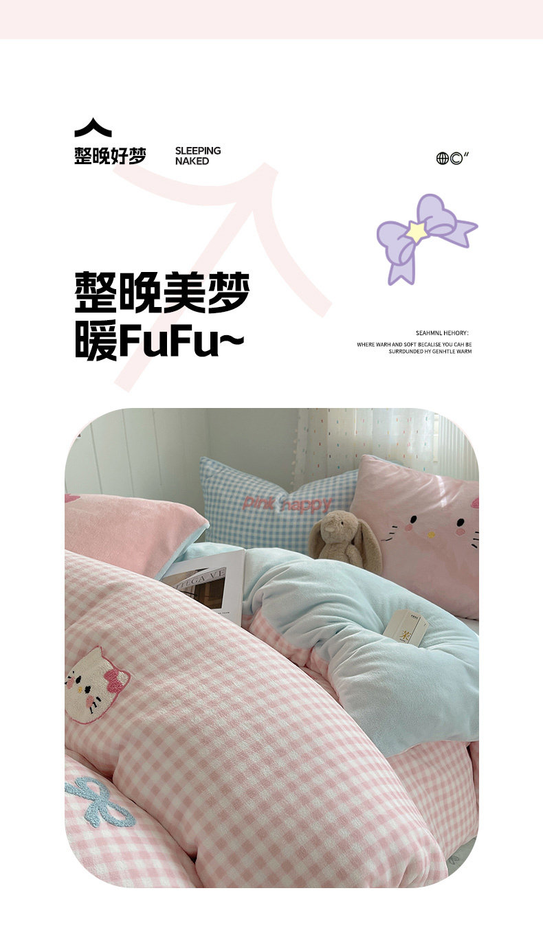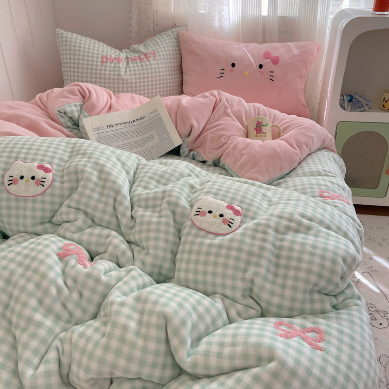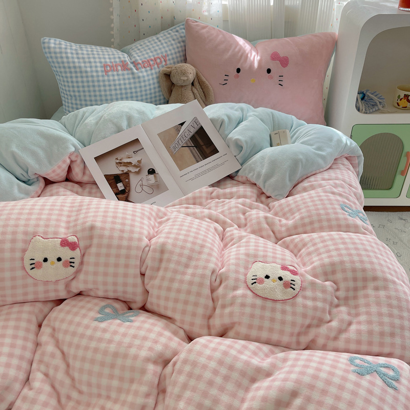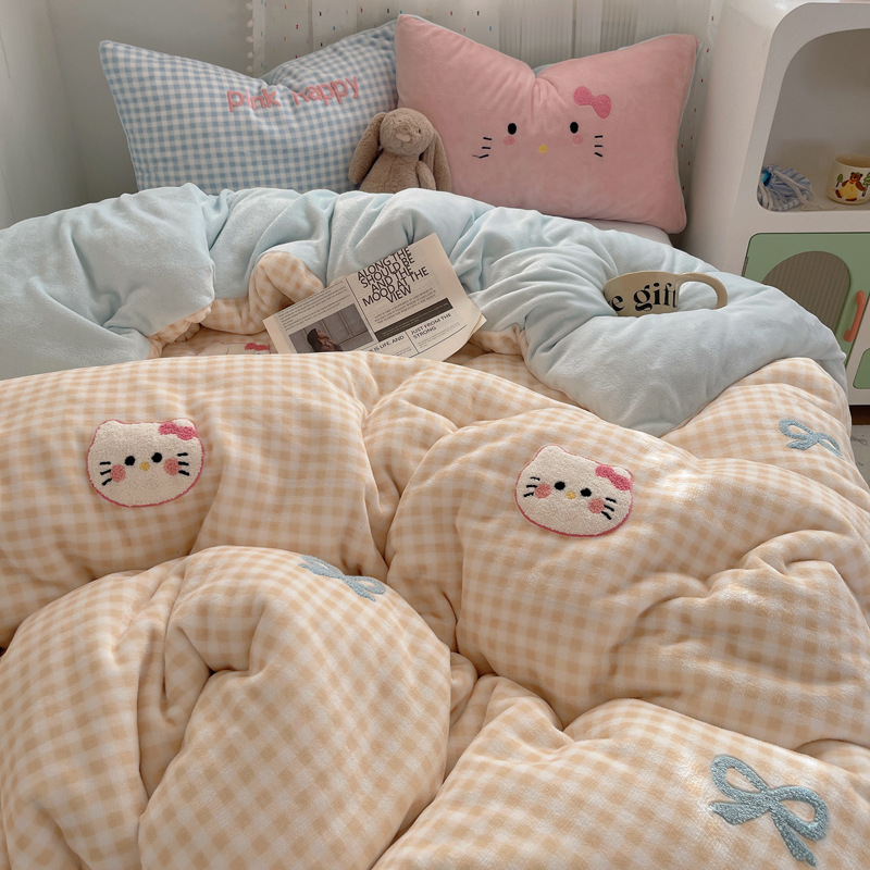 만화 Kt 고양이 수건 자수 4 피스 세트 2024 새로운 겨울 퀼트 커버 두꺼운 우유 산호 양털 침대 시트 기숙사 3