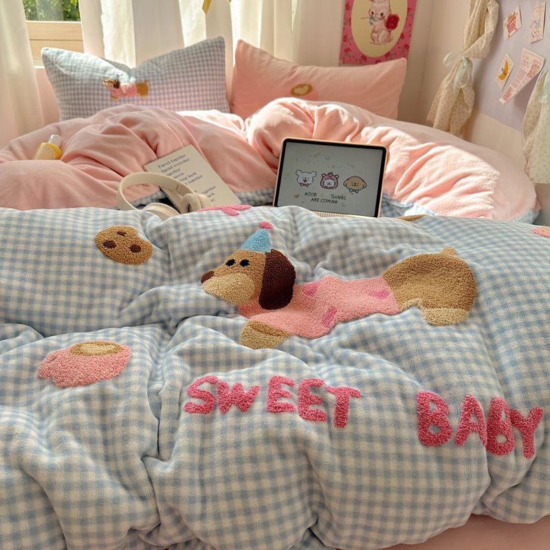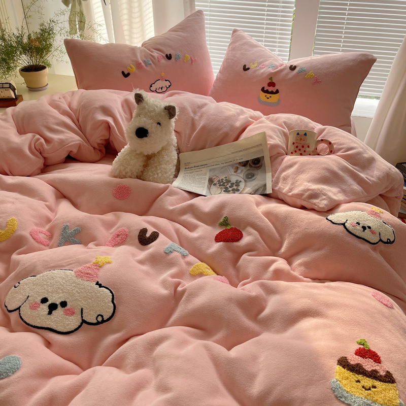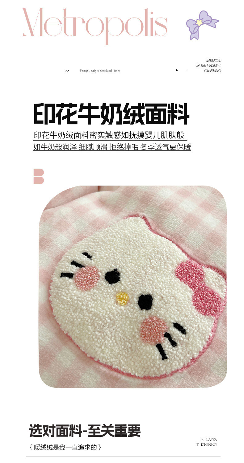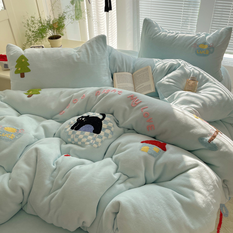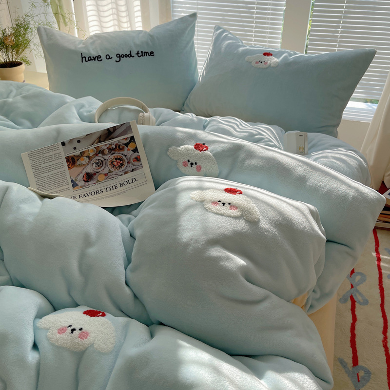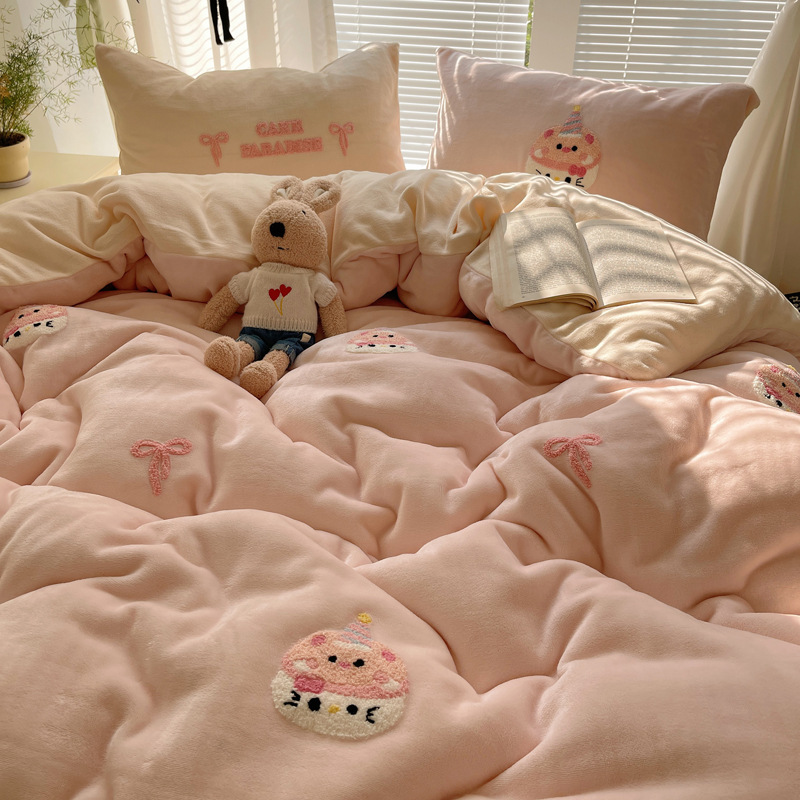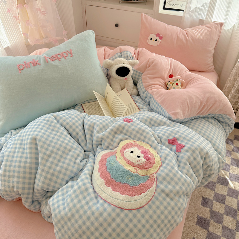 만화 Kt 고양이 수건 자수 4 피스 세트 2024 새로운 겨울 퀼트 커버 두꺼운 우유 산호 양털 침대 시트 기숙사 3