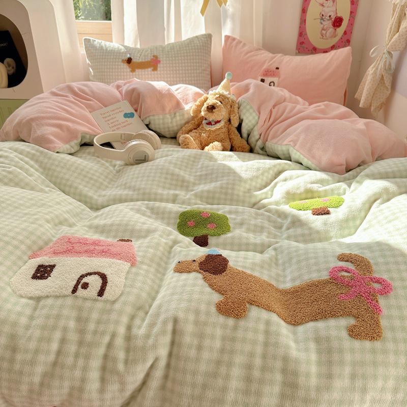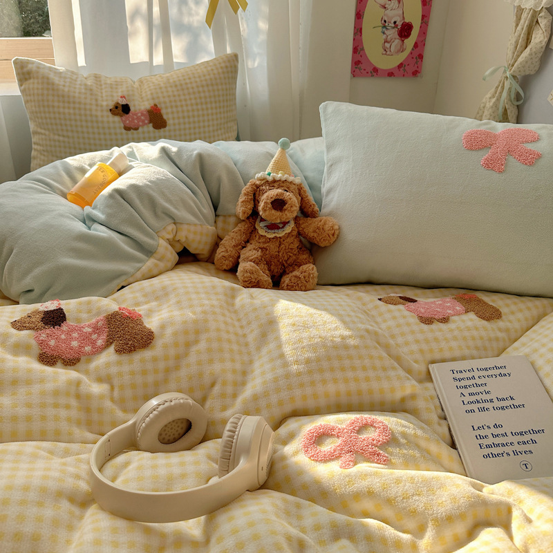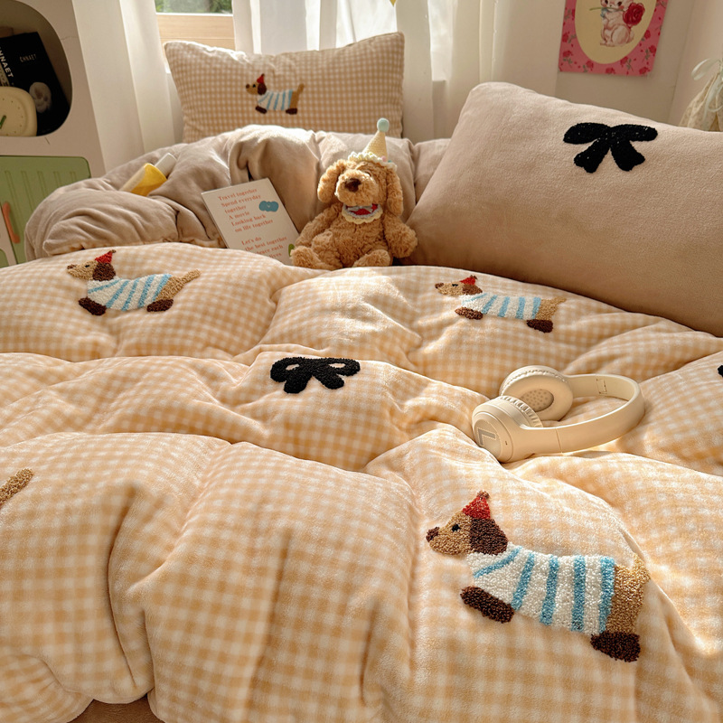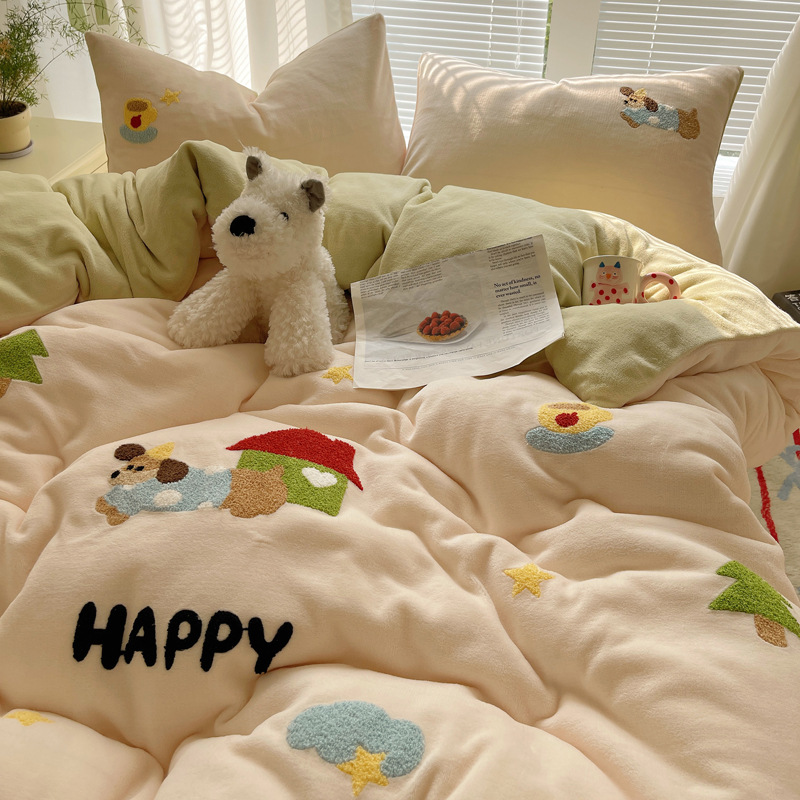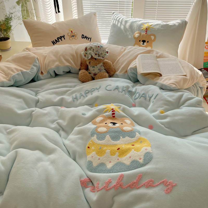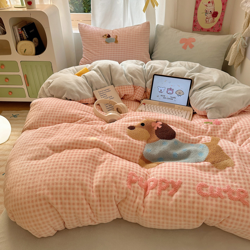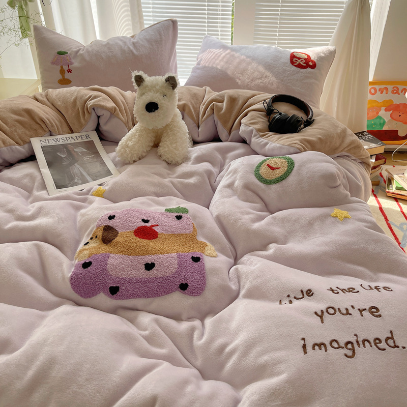 만화 Kt 고양이 수건 자수 4 피스 세트 2024 새로운 겨울 퀼트 커버 두꺼운 우유 산호 양털 침대 시트 기숙사 3
