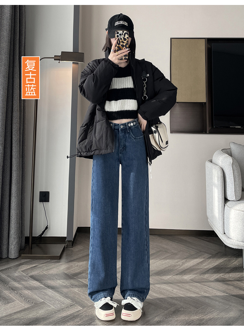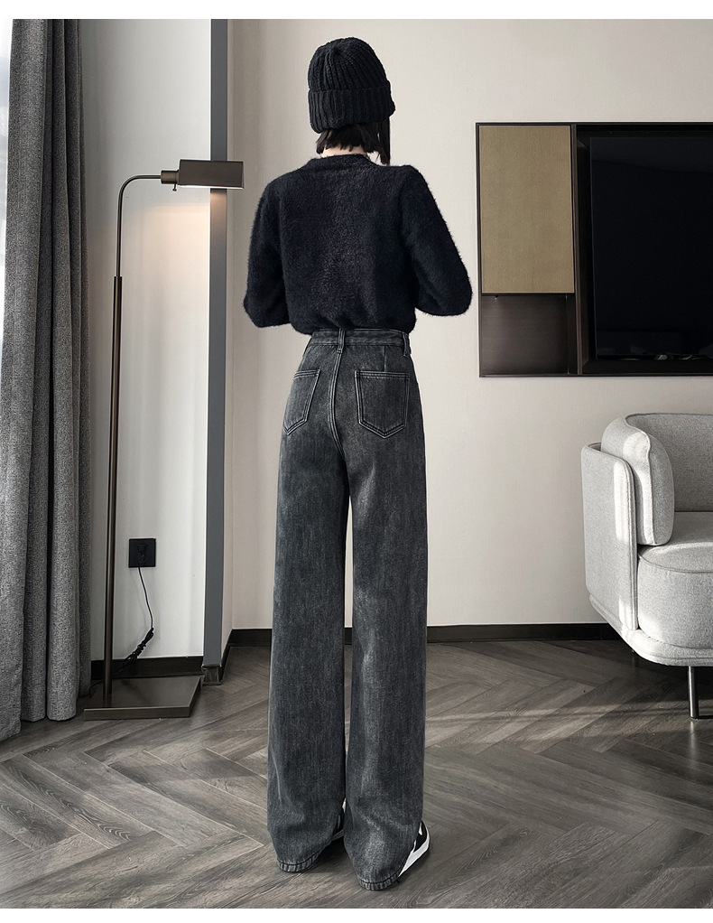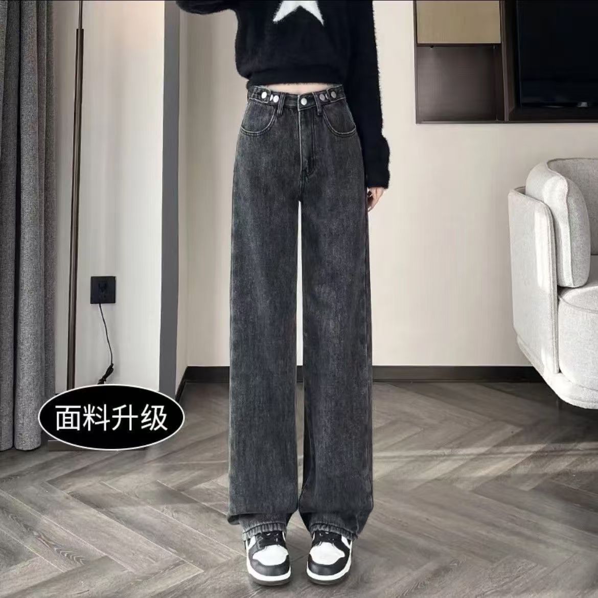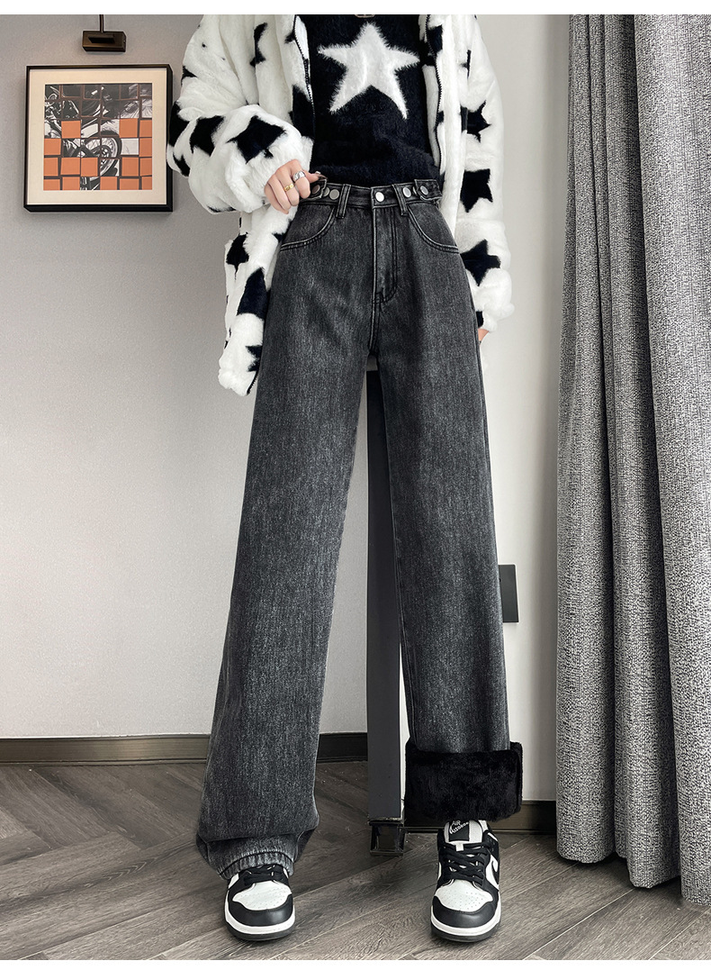 두꺼운 와이드 레그 청바지 여성용 2025 겨울 하이웨이스트 루즈핏 슬림핏 드레이프감 따뜻한 스트레이트 롱 팬츠 기모 바지
