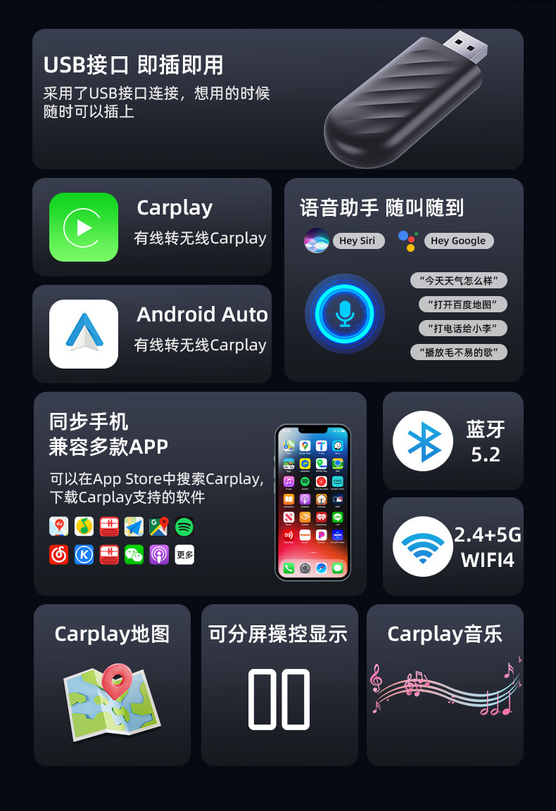 국경 간 자동차 기계 전용 무선 카플레이 박스 애플 안드로이드 2 대 1 박스 휴대 전화 자동차 기계 어댑터스토어 가기