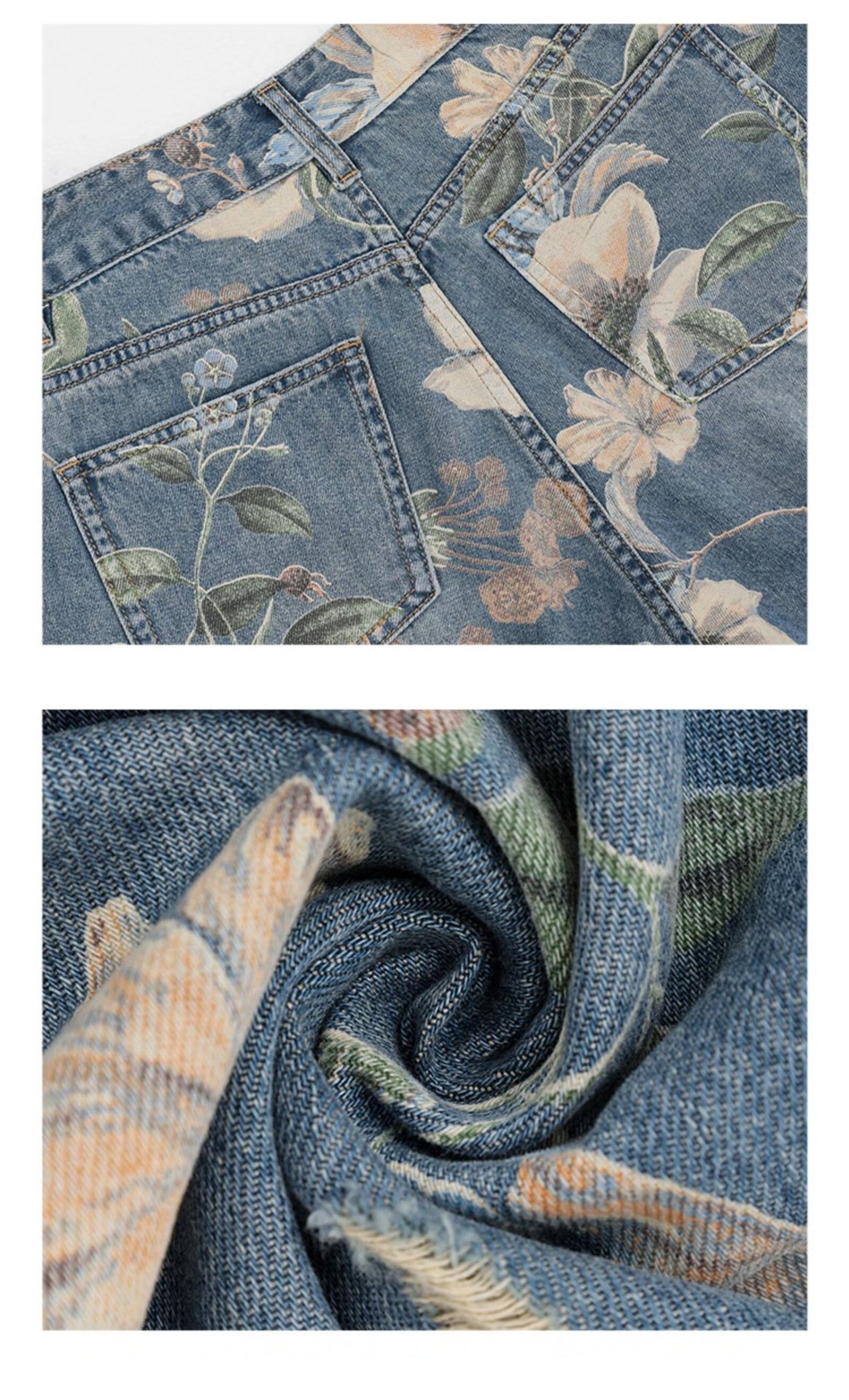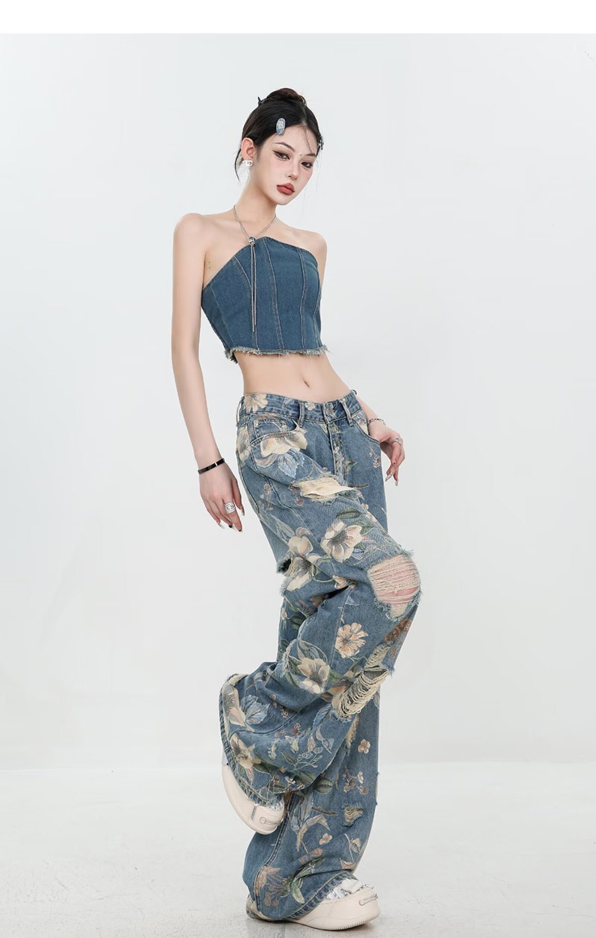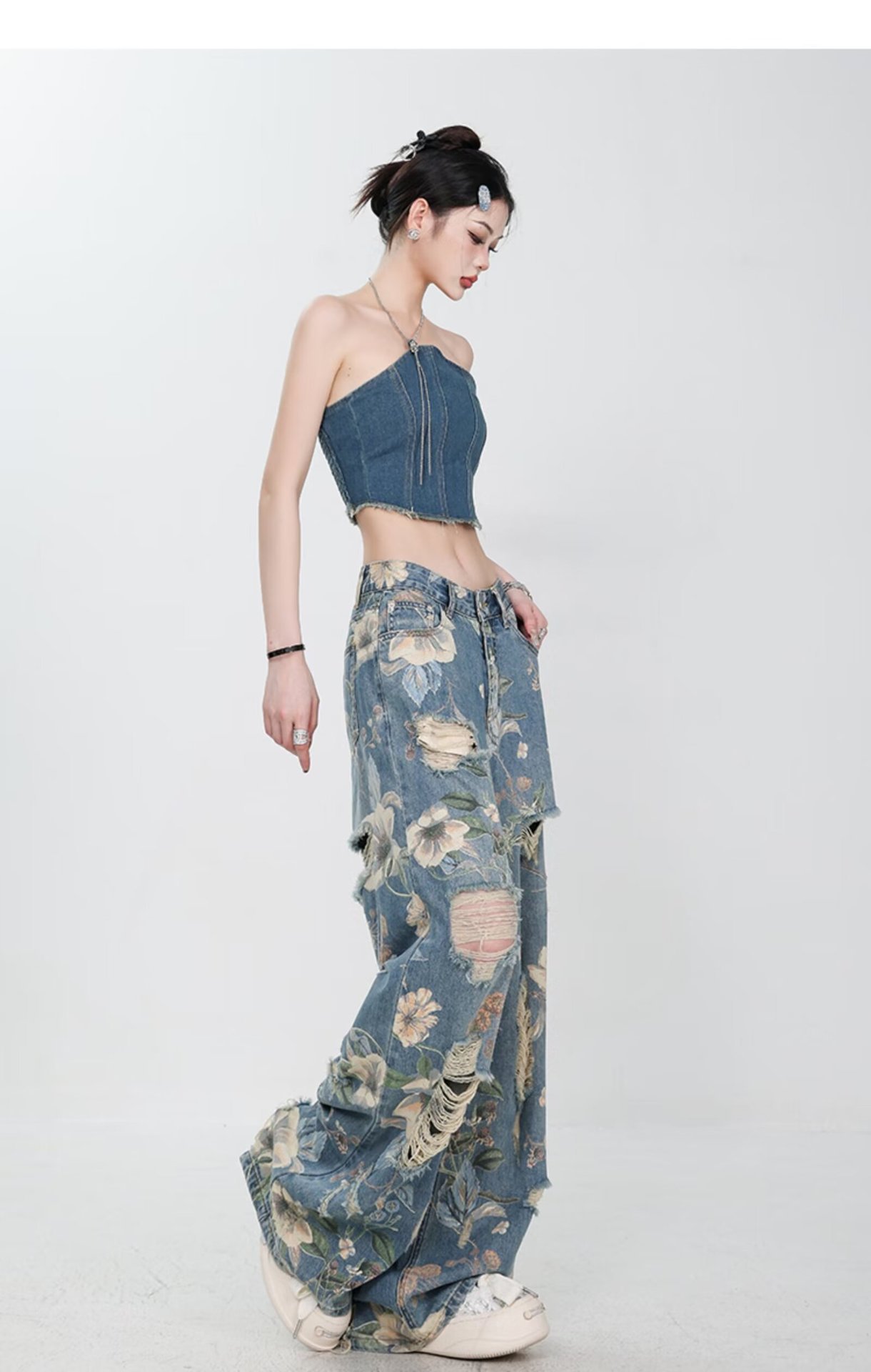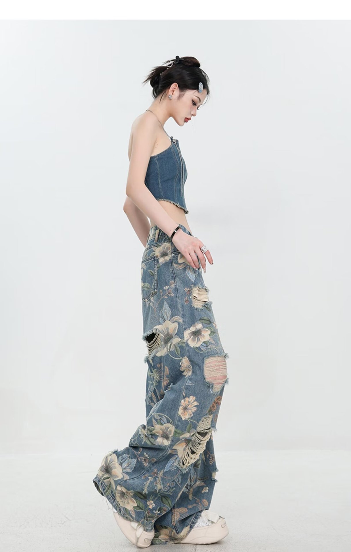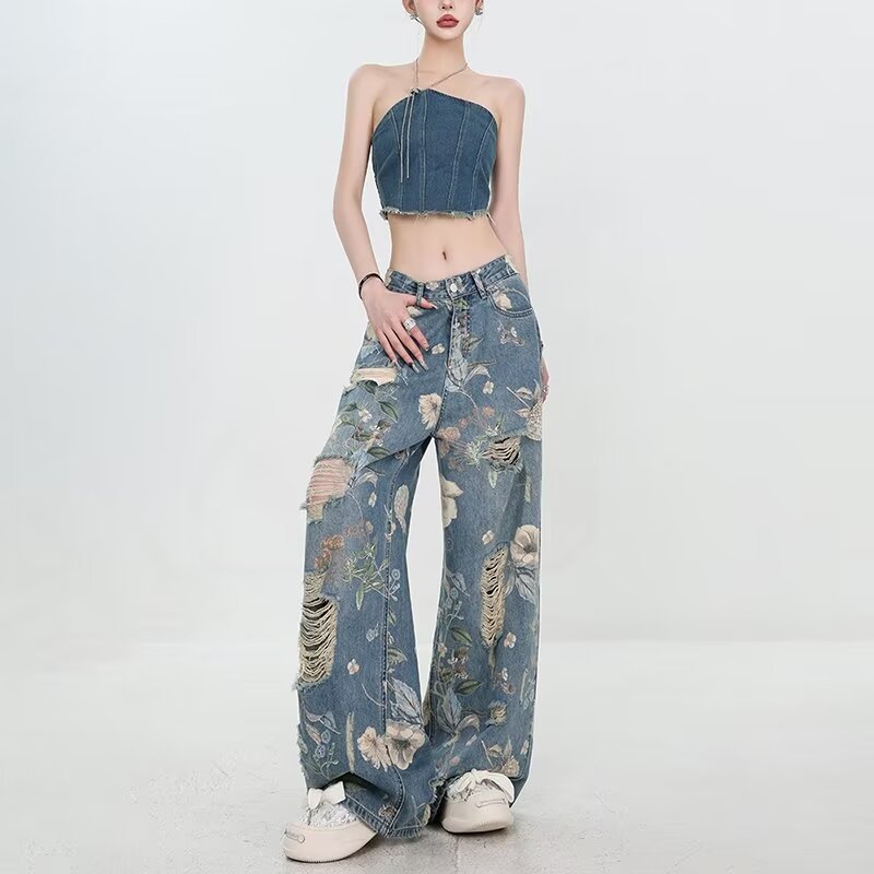아메리칸 스타일 스트리트 프린트 청바지 여성용 트렌디 브랜드 스타일 느슨한 올매치 디자인 느낌 넓은 다리 바지스토어 가기