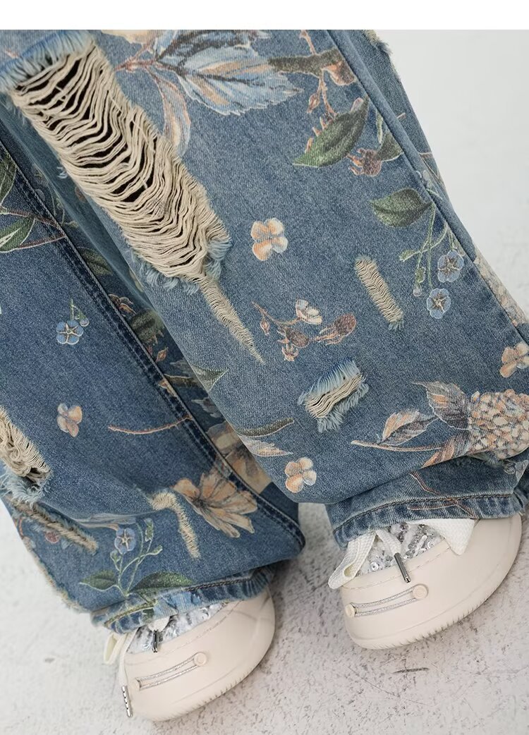 아메리칸 스타일 스트리트 프린트 청바지 여성용 트렌디 브랜드 스타일 느슨한 올매치 디자인 느낌 넓은 다리 바지
