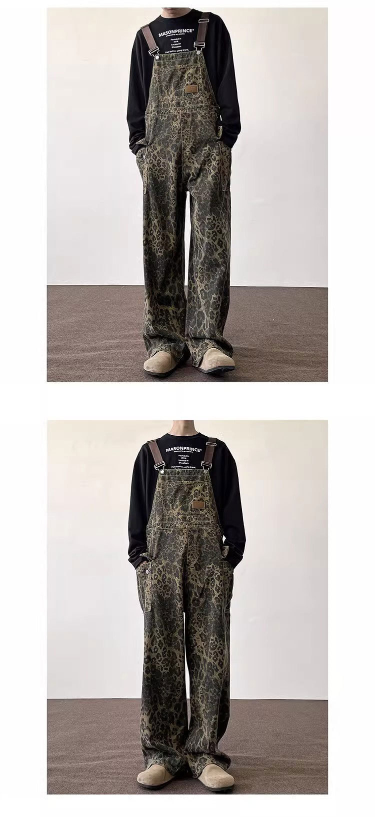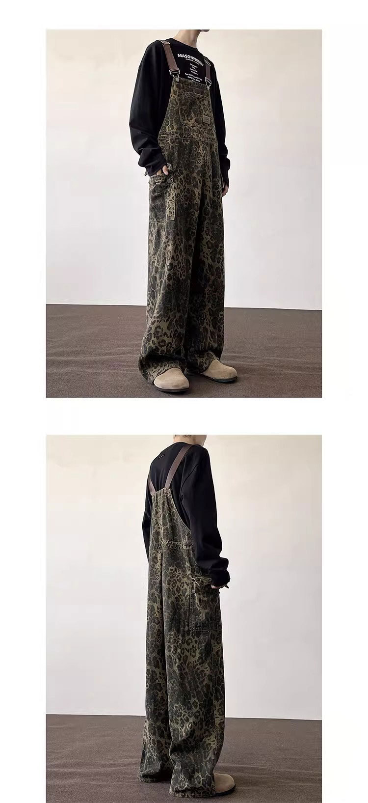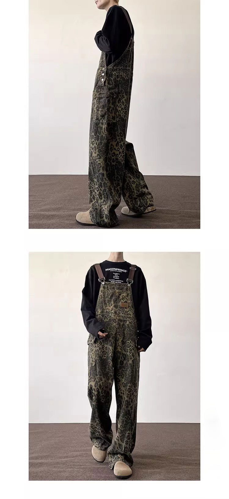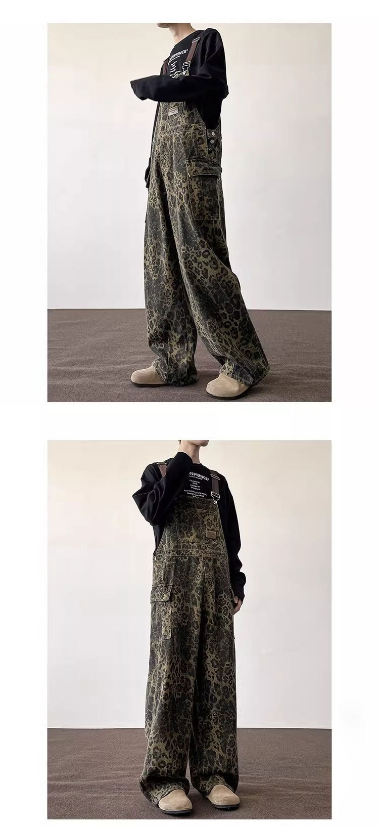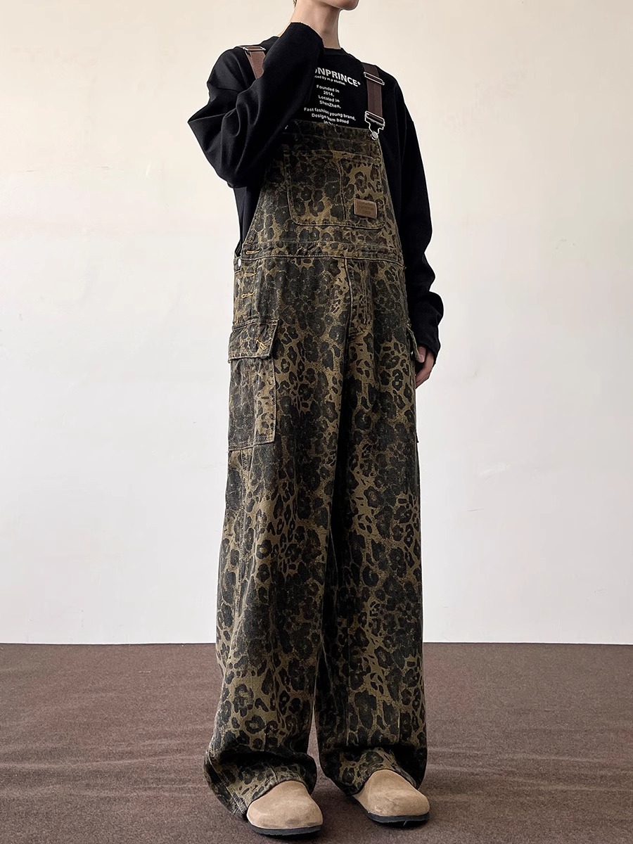 2024 봄과 가을 새로운 미국 스타일 복고풍 레오파드 무늬 오버롤 감각 느슨한 스트레이트 넓은 다리 캐주얼 긴 바지