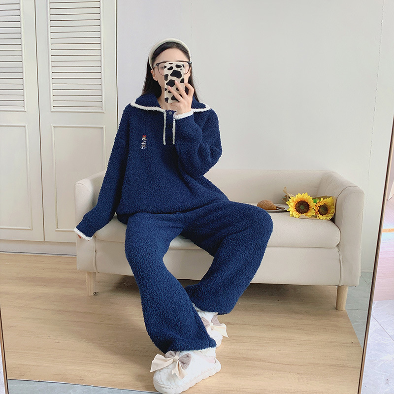 겨울 귀여운 부드러운 반쪽 벨벳 파자마 세트 여성 기모 두꺼운 캐주얼 따뜻한 가정 겉옷