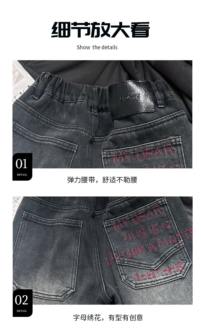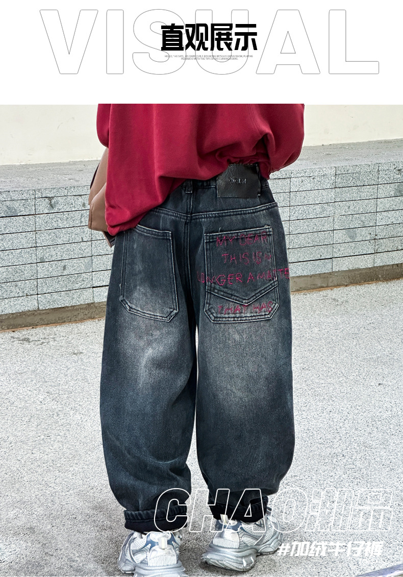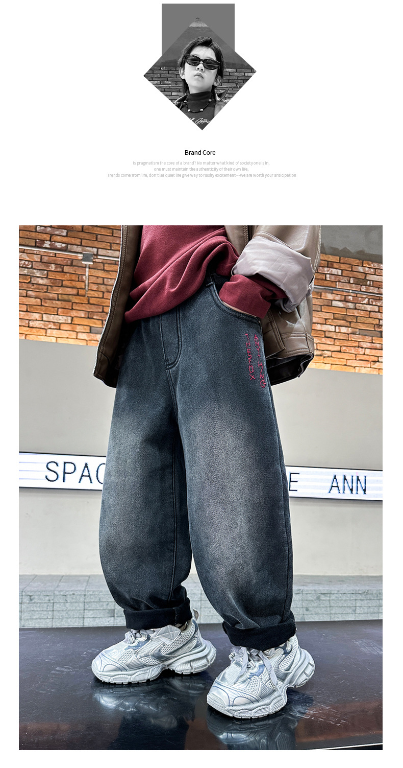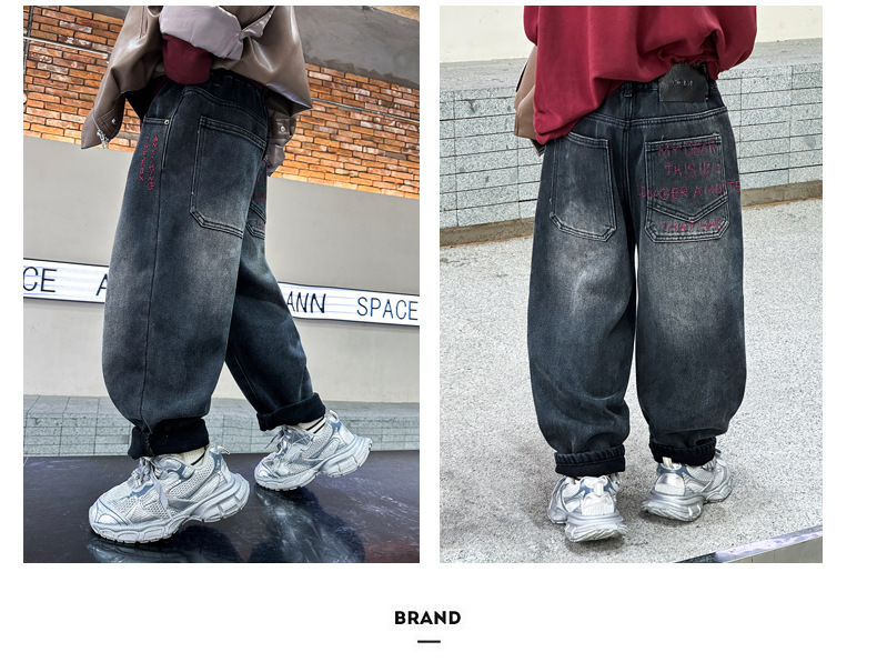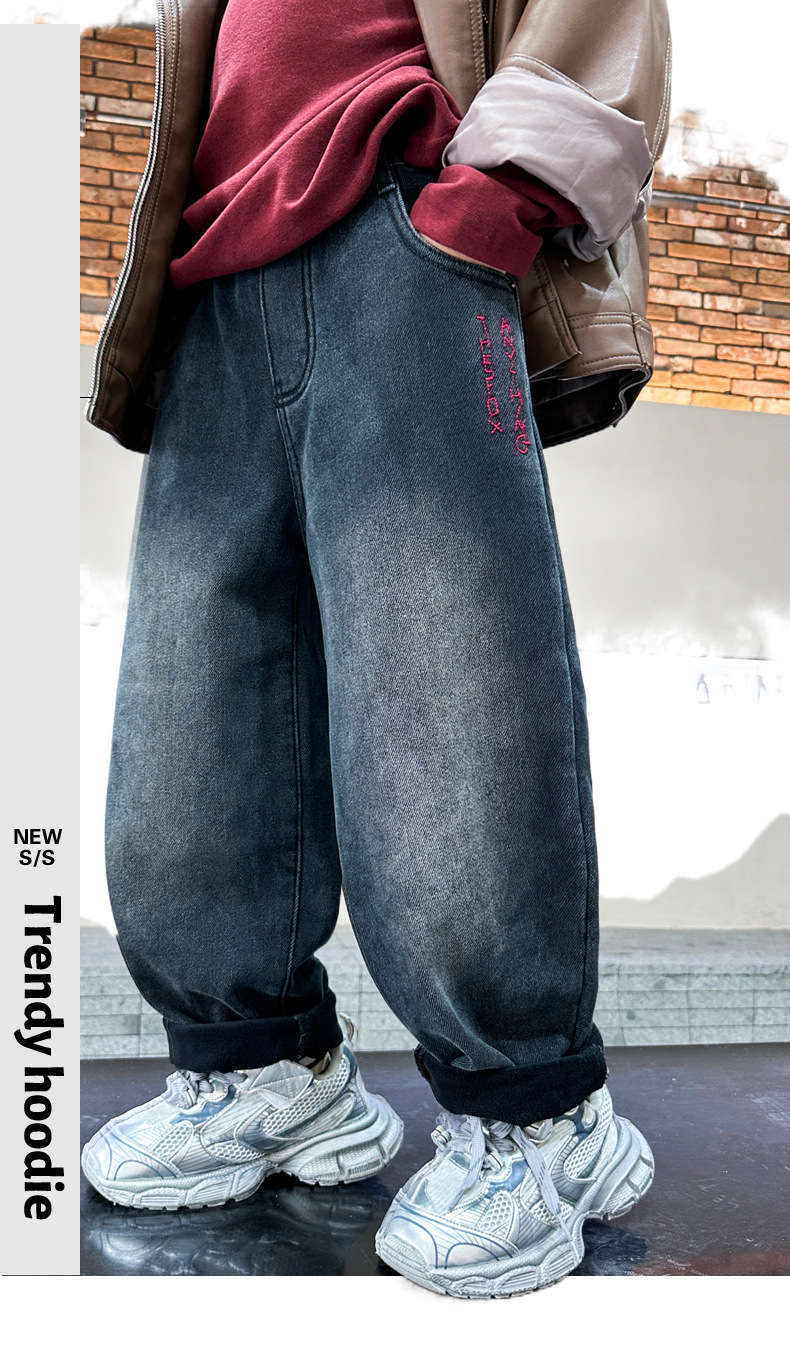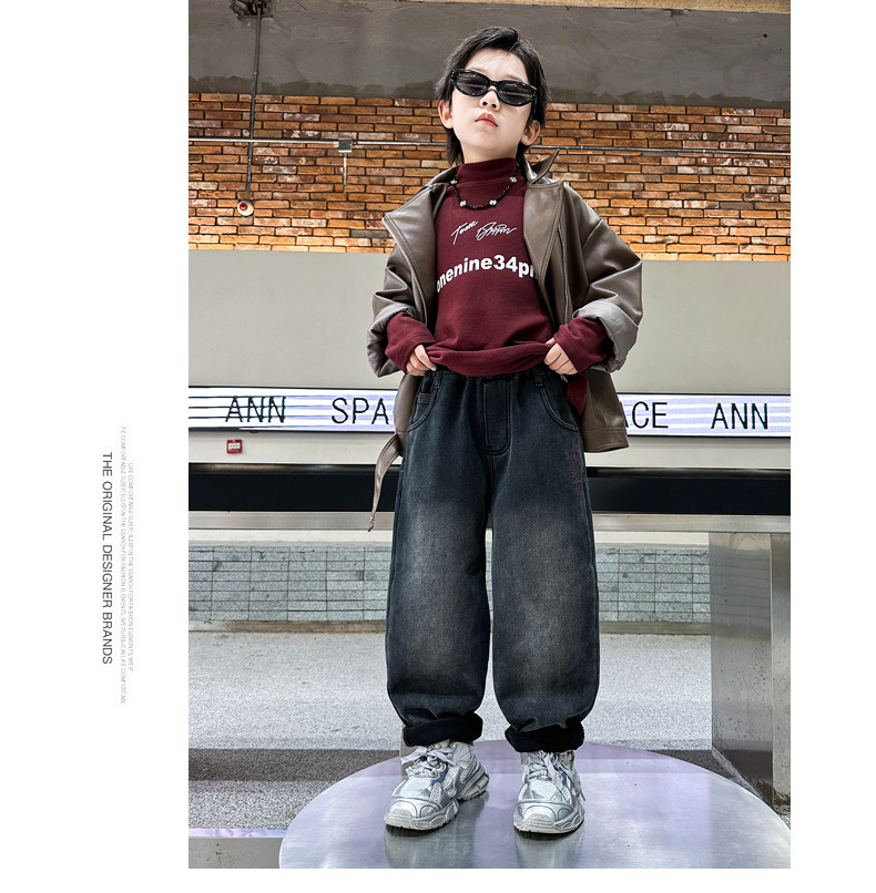 아동복 기모 바지 2024 년 가을과 겨울 새로운 도착 데님 중 · 빅 보이스 겨울옷 두꺼운 겨울 트렌디