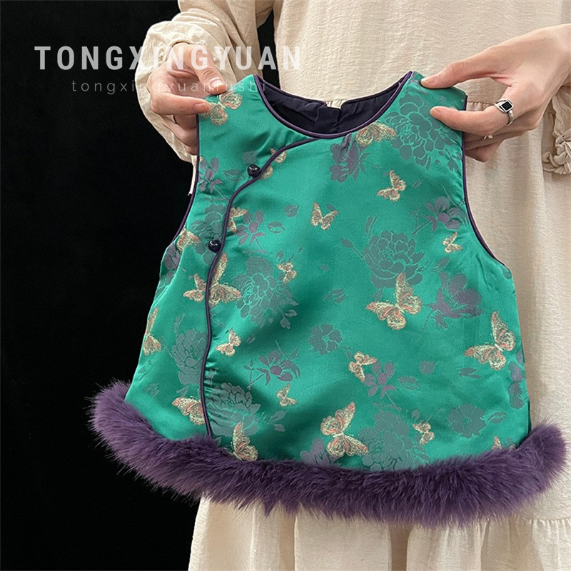 Tongxingyuan 2024 겨울 소녀 아동복 국가 스타일 새틴 자카드 조끼 아기의 새로운 중국 스타일 웨이스트 코트 조끼 청삼 스커트스토어 가기
