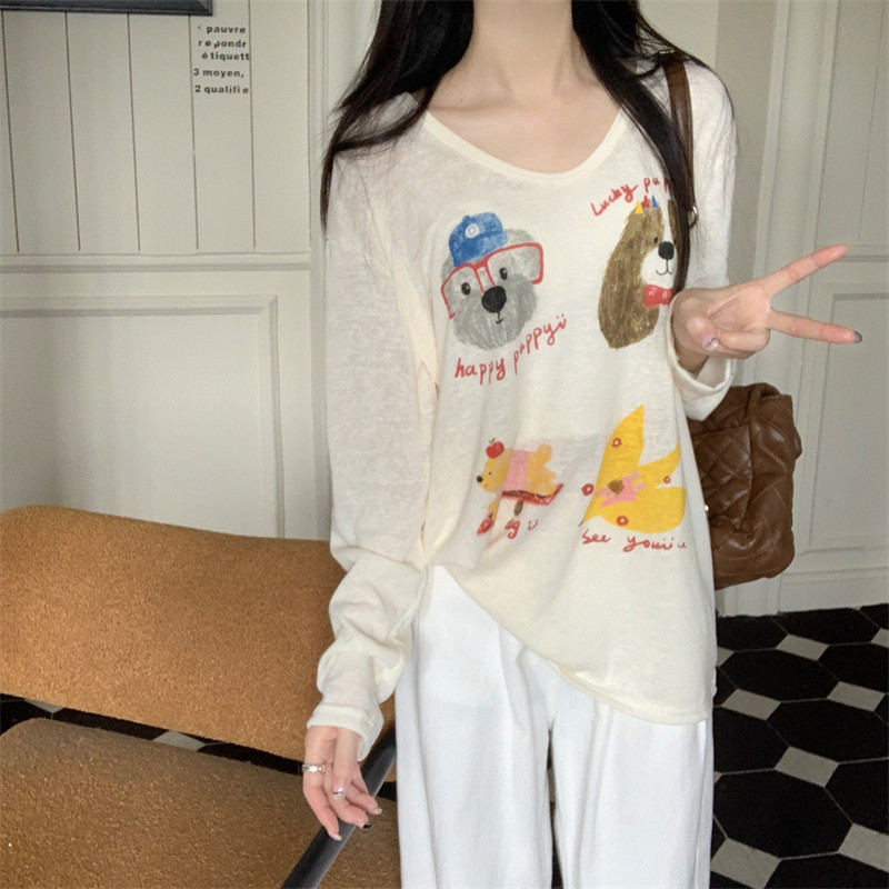 틈새 재미 프린트 긴팔 티셔츠 여성용 얇은 자외선 차단제 가을 유행 게으른 느슨한 디자인 감각 블라우스스토어 가기