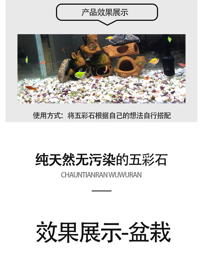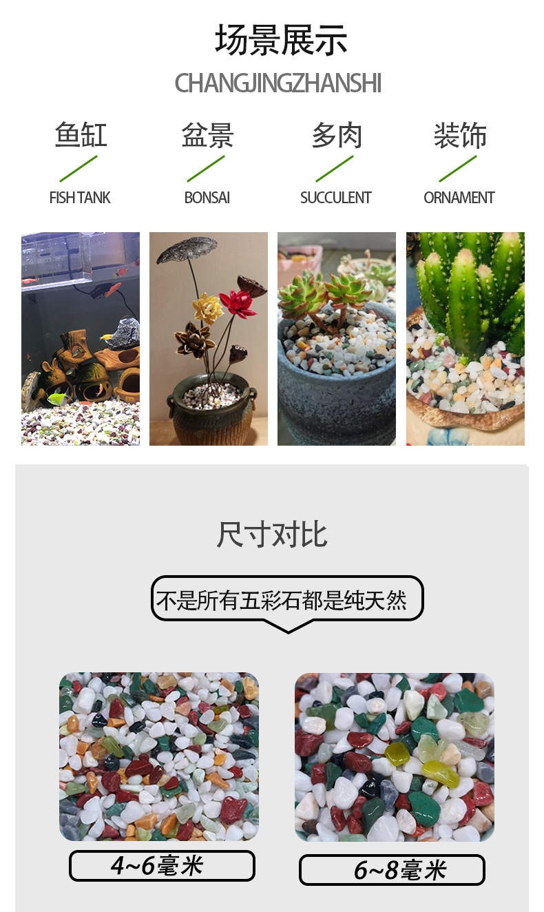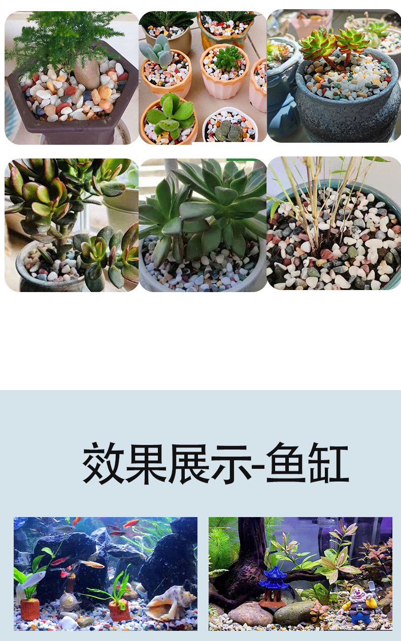 • 4-6mm 다채로운 돌 2.5kg 팩에는 시뮬레이션 수생 식물 2개가 포함되어 있습니다.