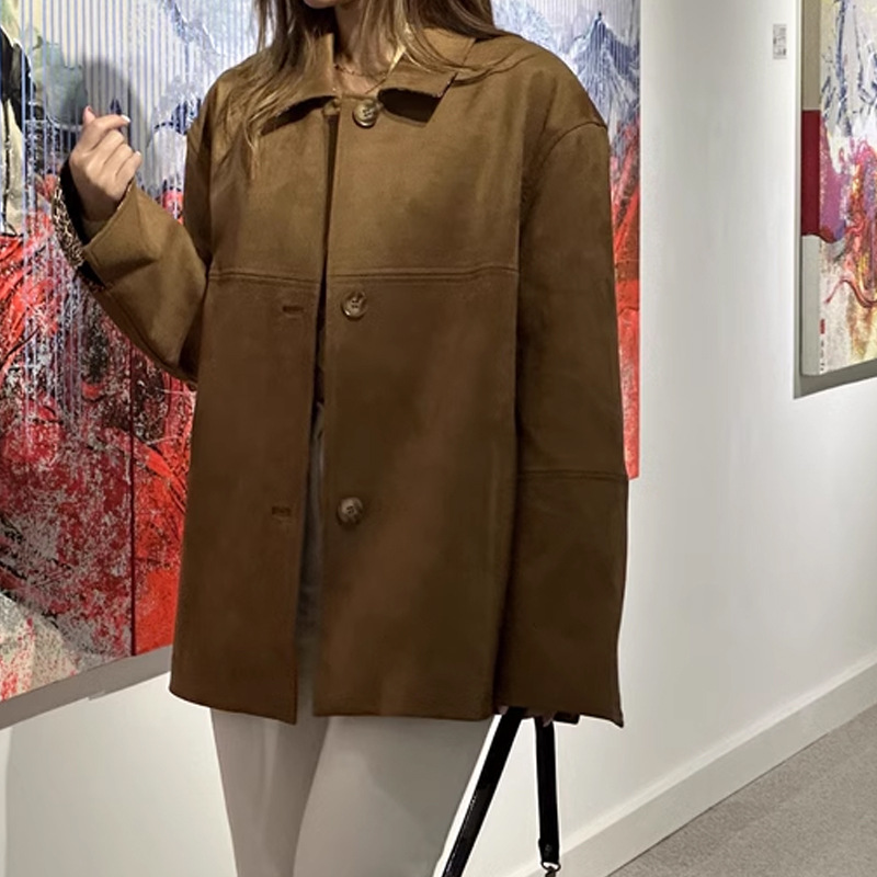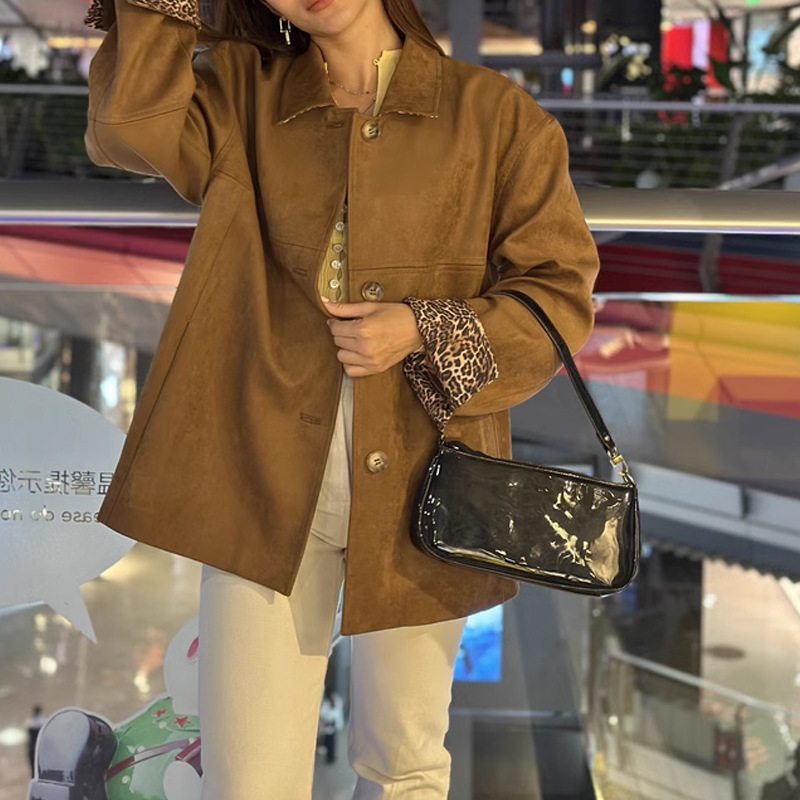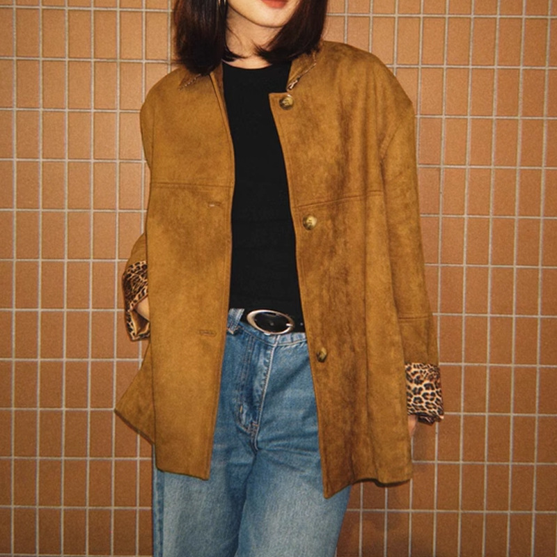 레오파드 워킹 걸 다크 브라운 스웨이드 섬유 스티칭 레오파드 무늬 옷깃 프로필 코트 재킷 탑