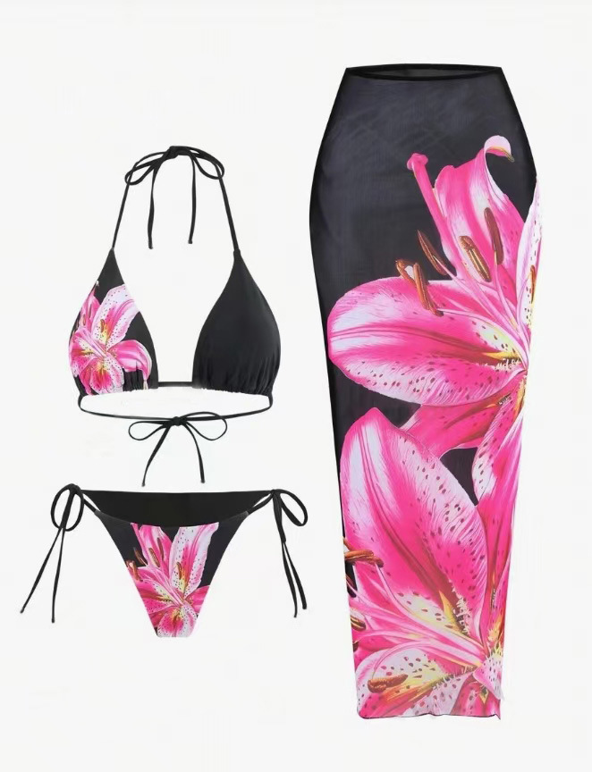 새로운 대외 무역 국경 간 유럽과 미국 비키니 커버 업 재킷 섹시한 백합 맞춤형 프린트 수영복 3 피스 세트