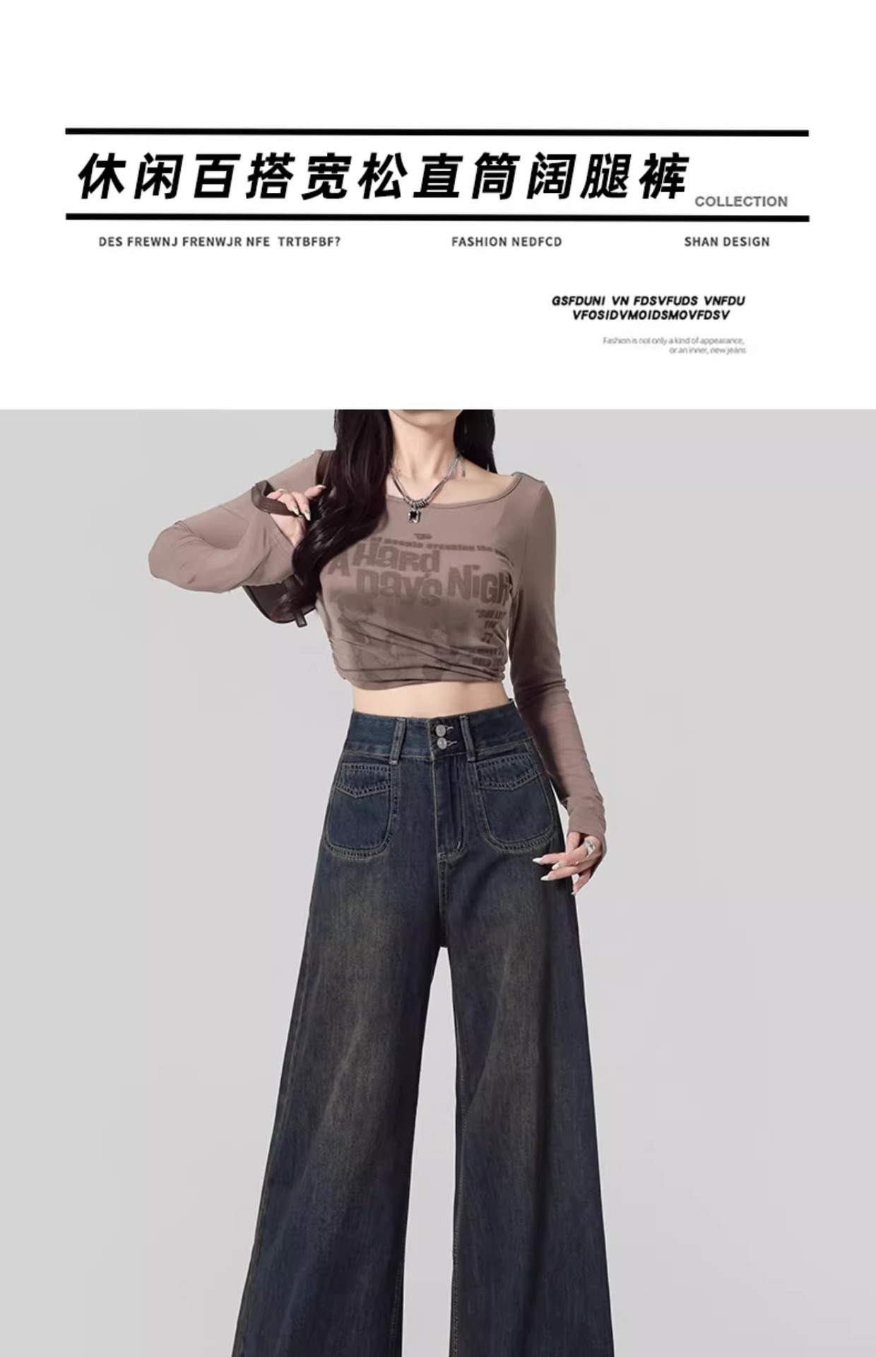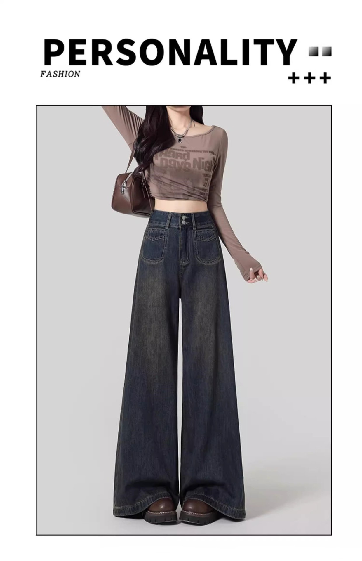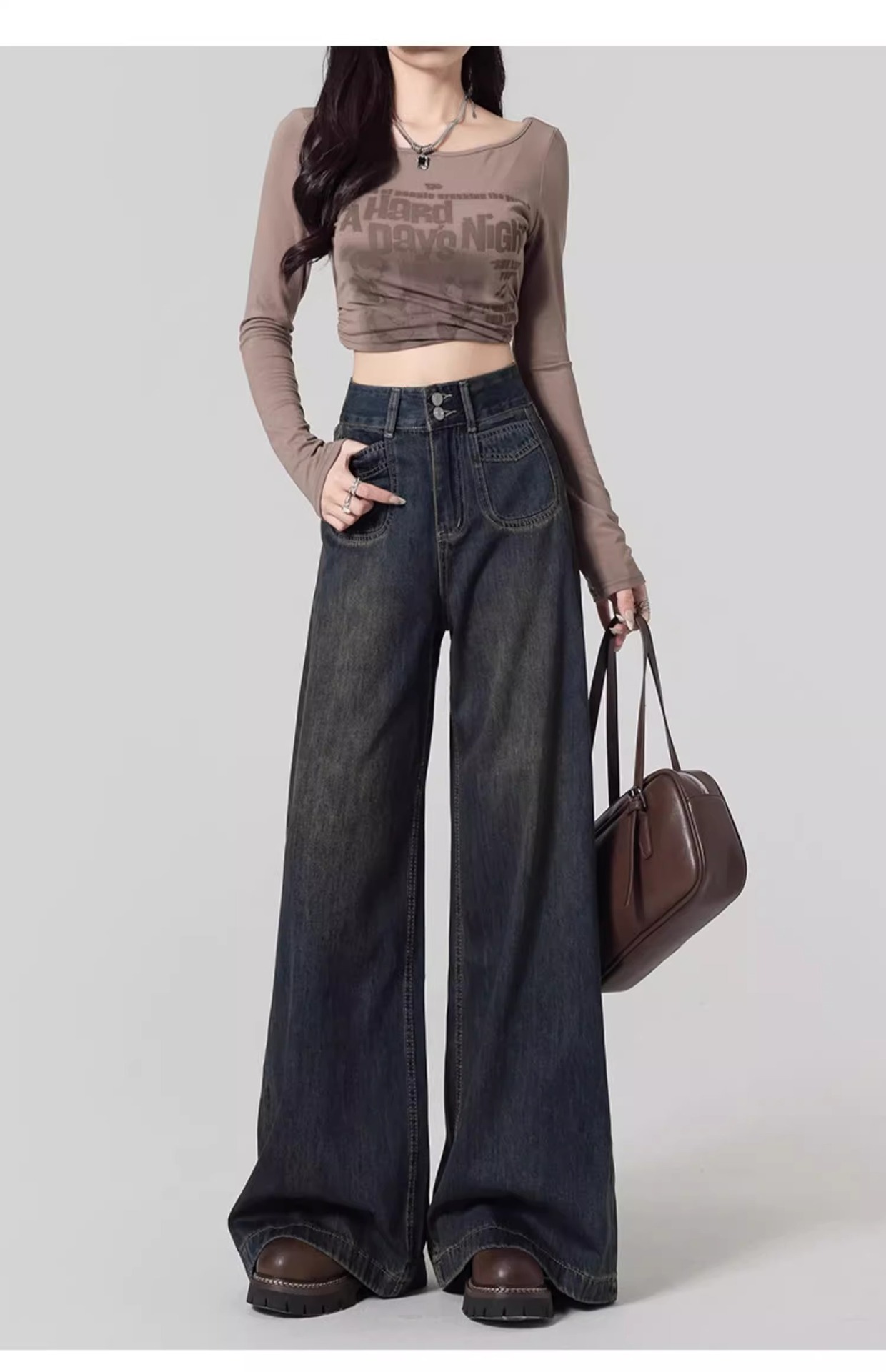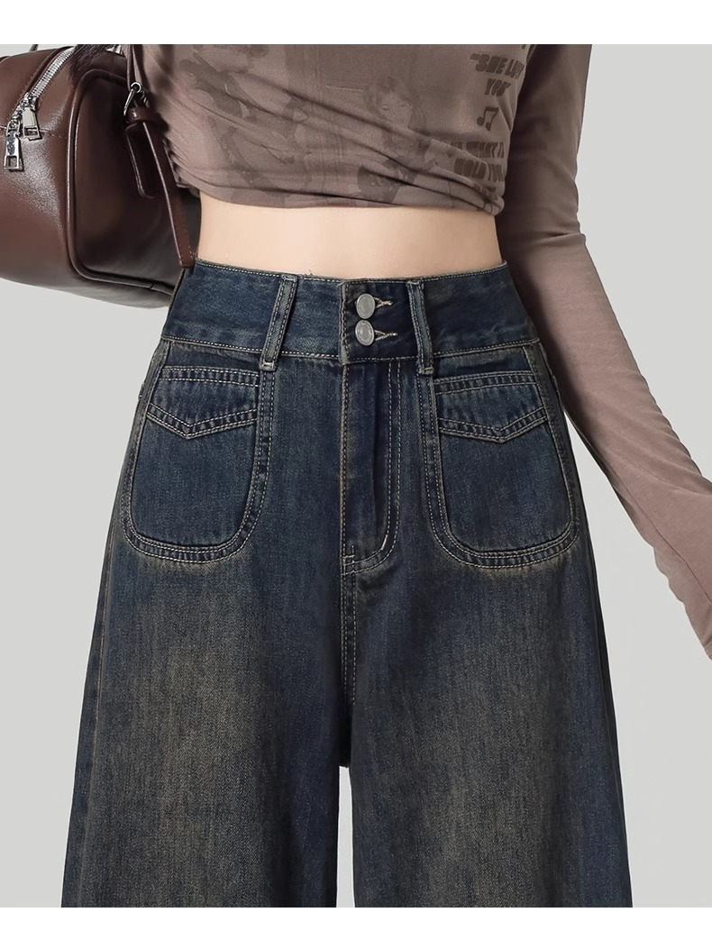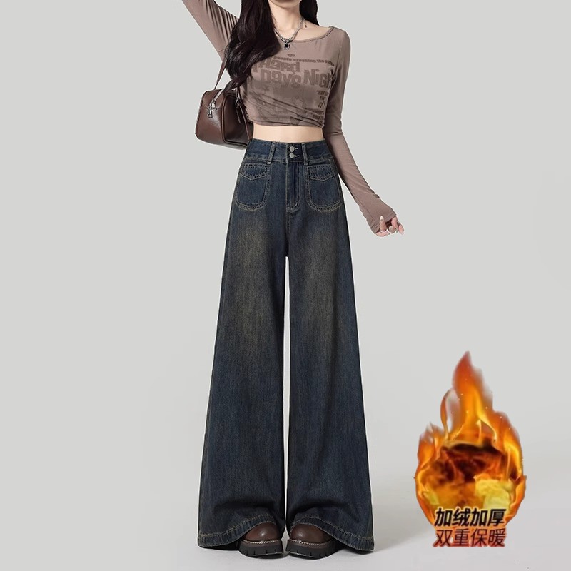 기모 두꺼운 시멘트 그레이 마이크로 와이드 레그 청바지 여자 겨울 유행 올매치 느슨한 높은 허리 바지스토어 가기