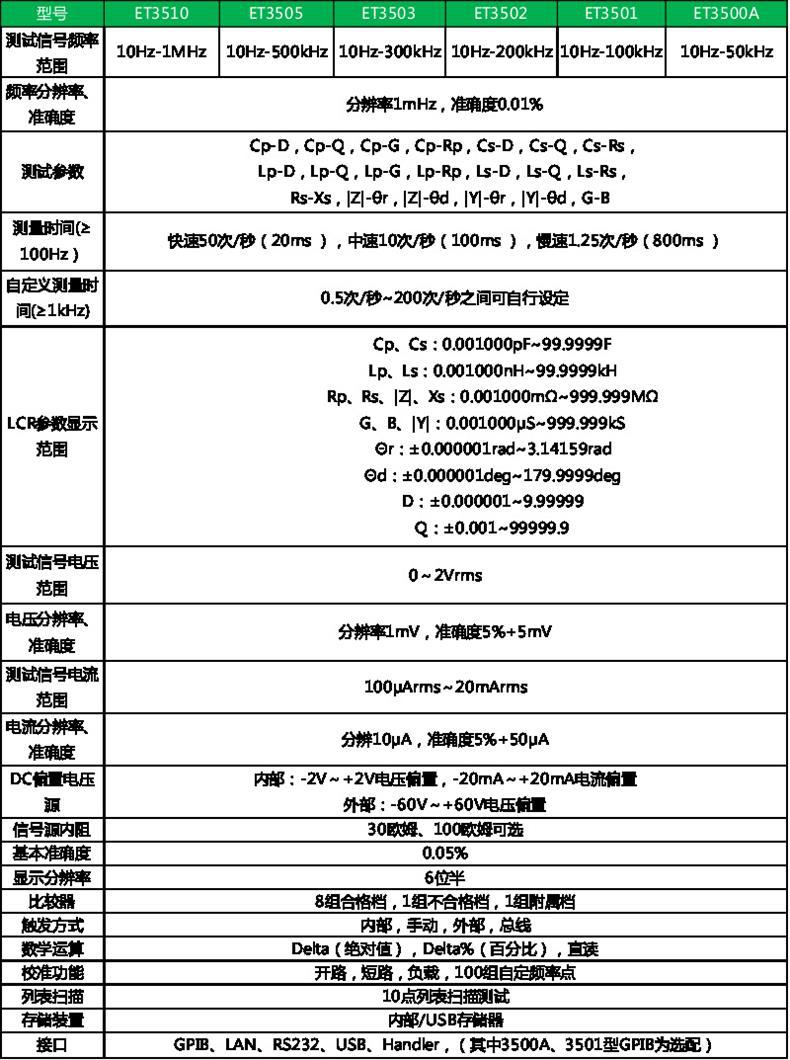 ET3501数字电桥(LCR表)是采用自动平衡电桥原理设计的高精度元件参数分析仪,其10Hz~100kHz的测试带宽、频率连续可调、0.05%的基本测量精度以及仪器所提供的自动电平控制功能、列表扫描和档计数功能为绝大多数元器件和材料提供准确、完整的测量与分析,广泛适用于产品研发、元器件入厂检验、产品在线分检等应用场合。