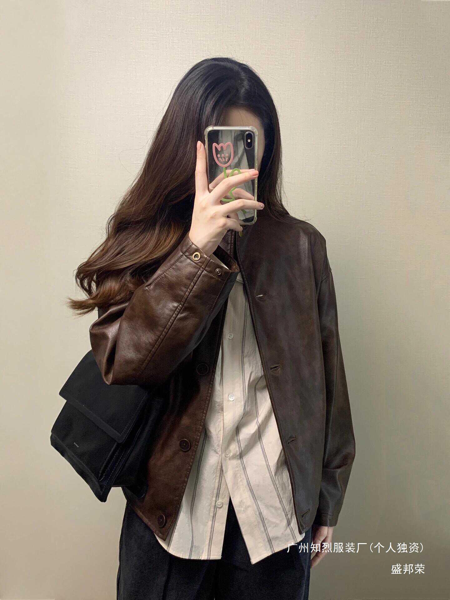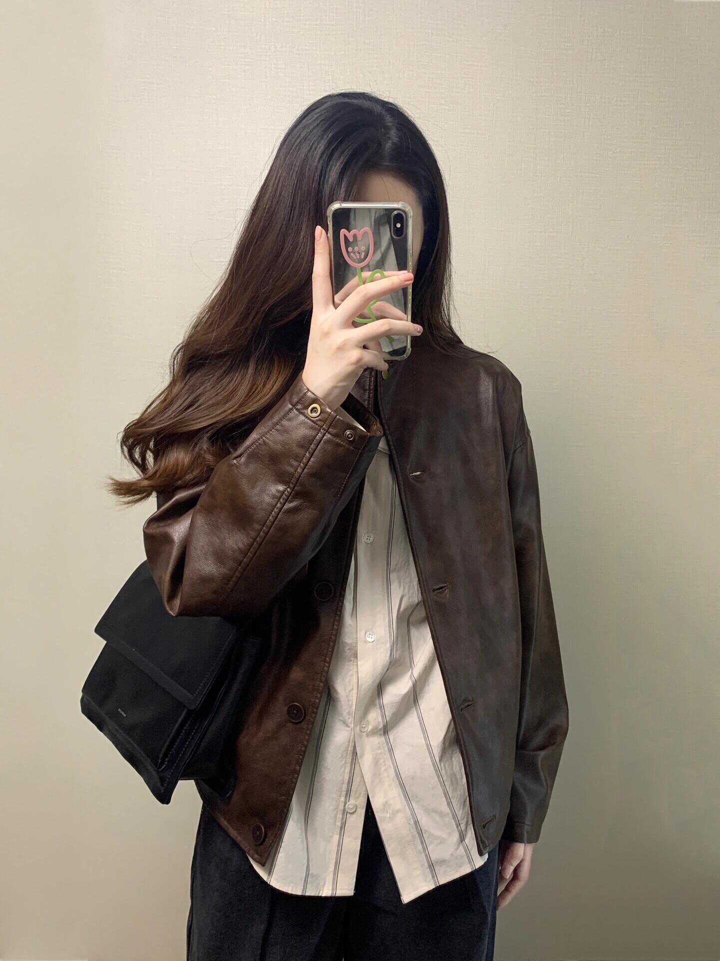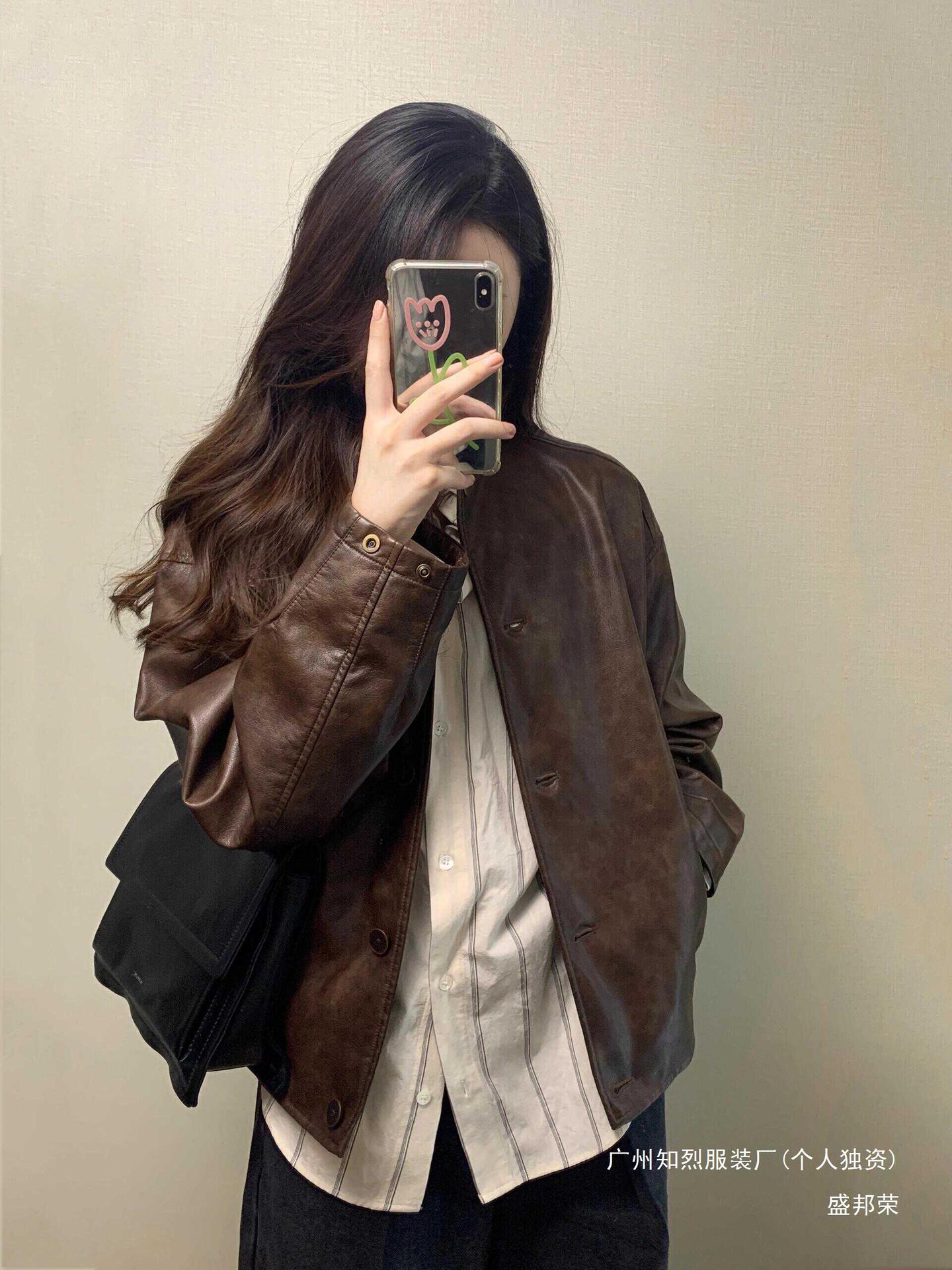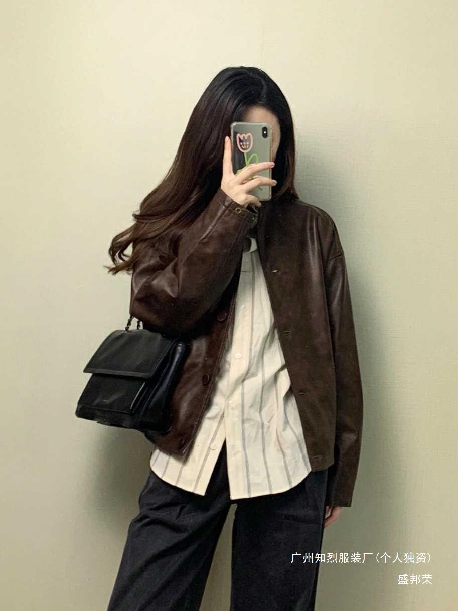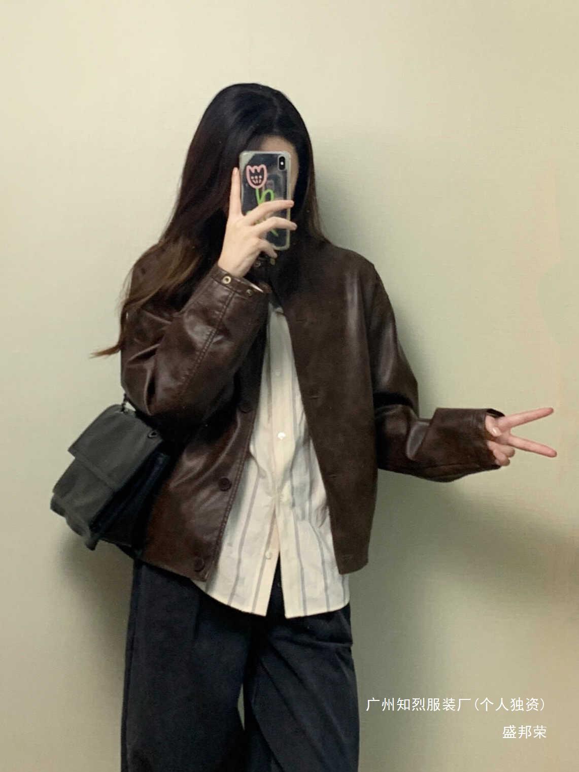 Shengbang Rongli 칼라 재킷 새로운 아름다운 가죽 자켓 여성의 봄과 가을 짧은 다크 브라운 라드 오토바이스토어 가기