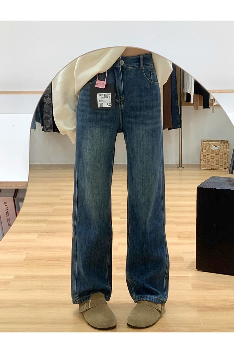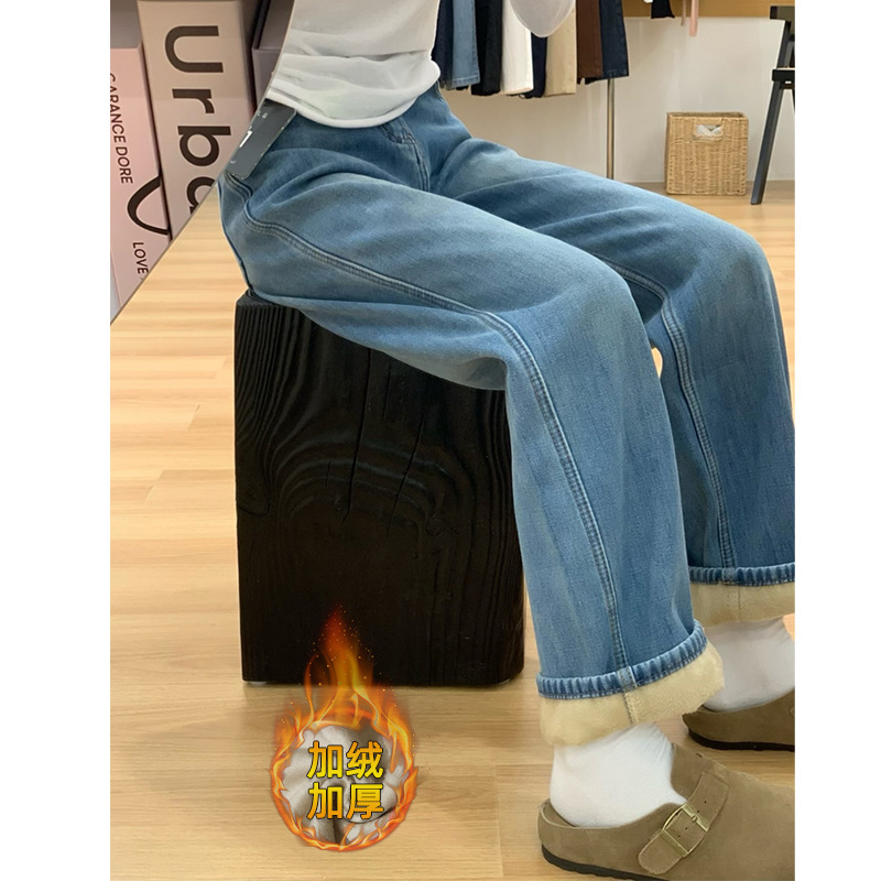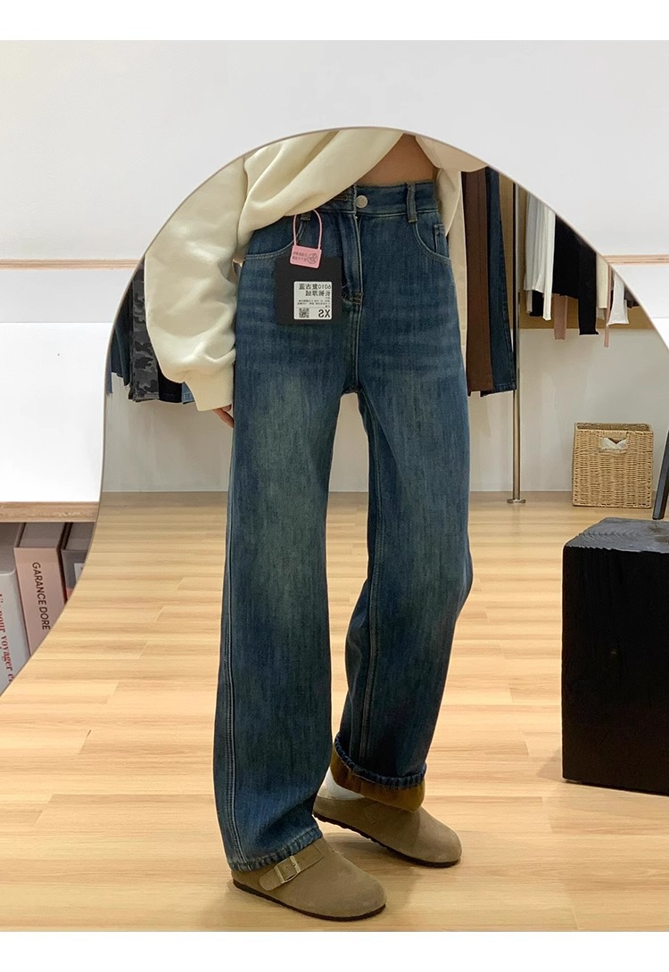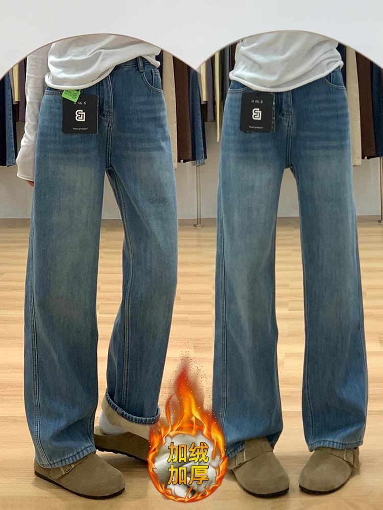 벨벳 안감 두꺼운 일자핏 청바지 여성용 2025 가을 겨울 신상품 작은 키 여성을 위한 하이웨이스트 슬림핏 배형 청바지스토어 가기