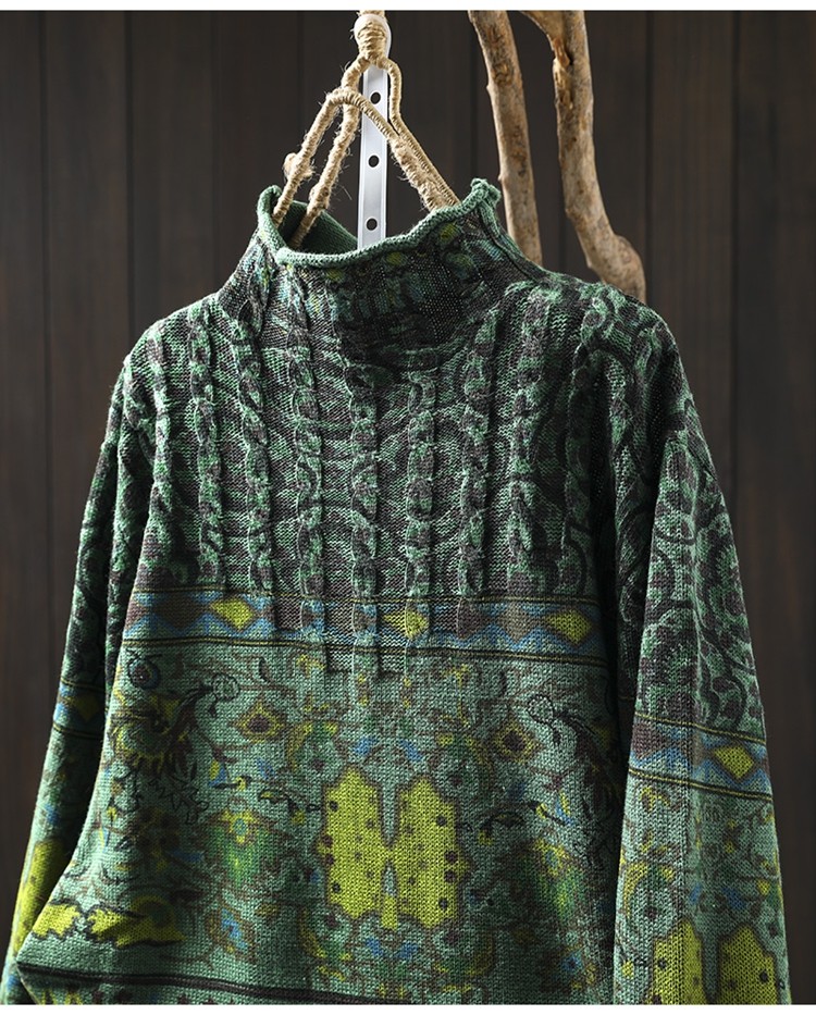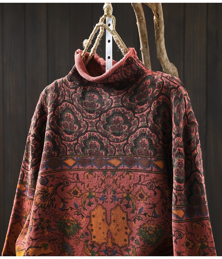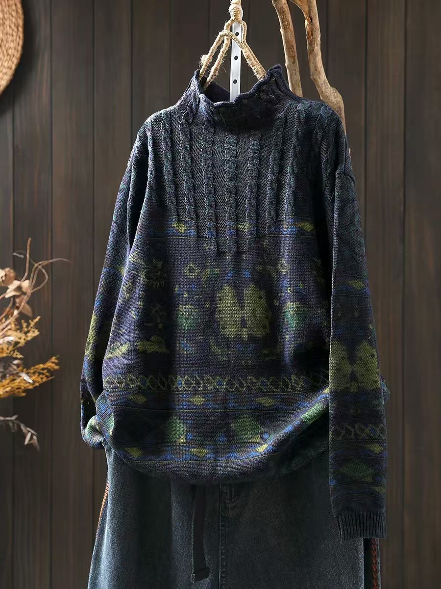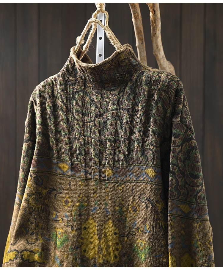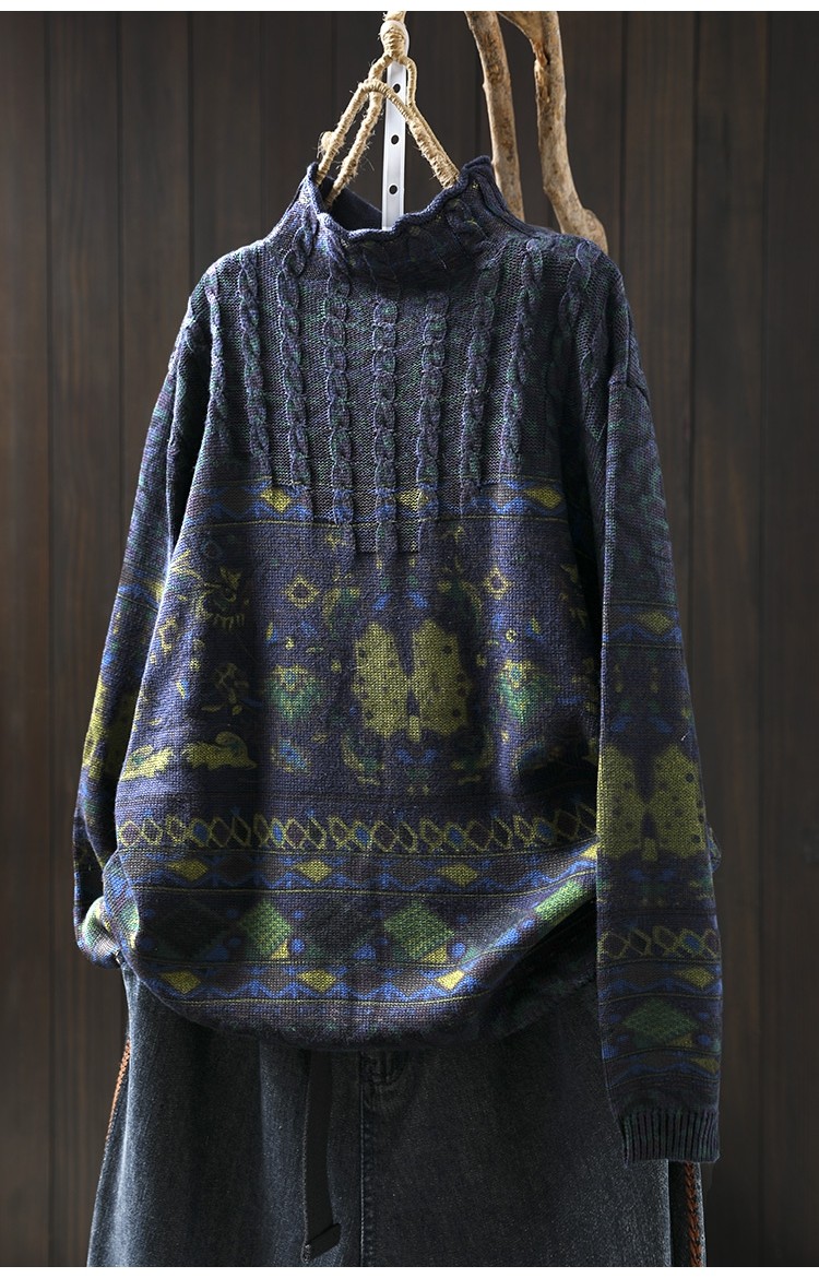 겨울 새로운 반 터틀넥 인쇄 면 스웨터 여성의 느슨한 슬리밍 빈티지 쿨 캐주얼 풀오버 82513