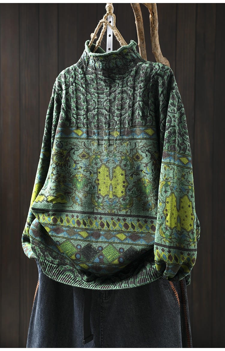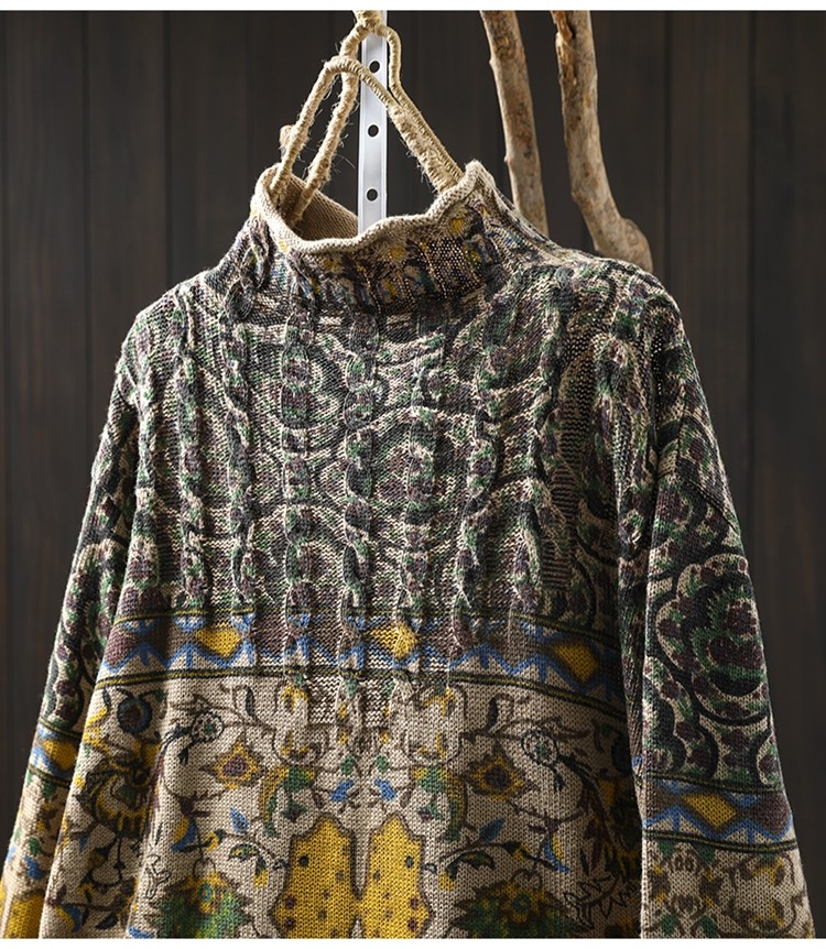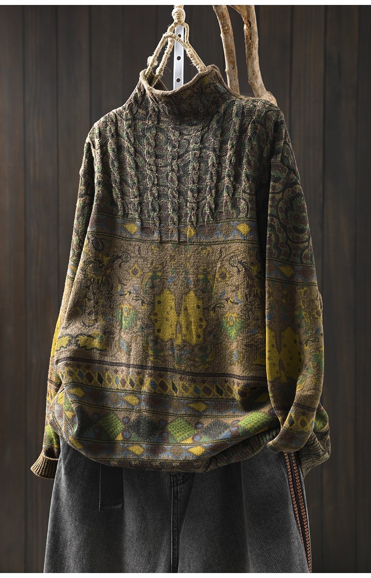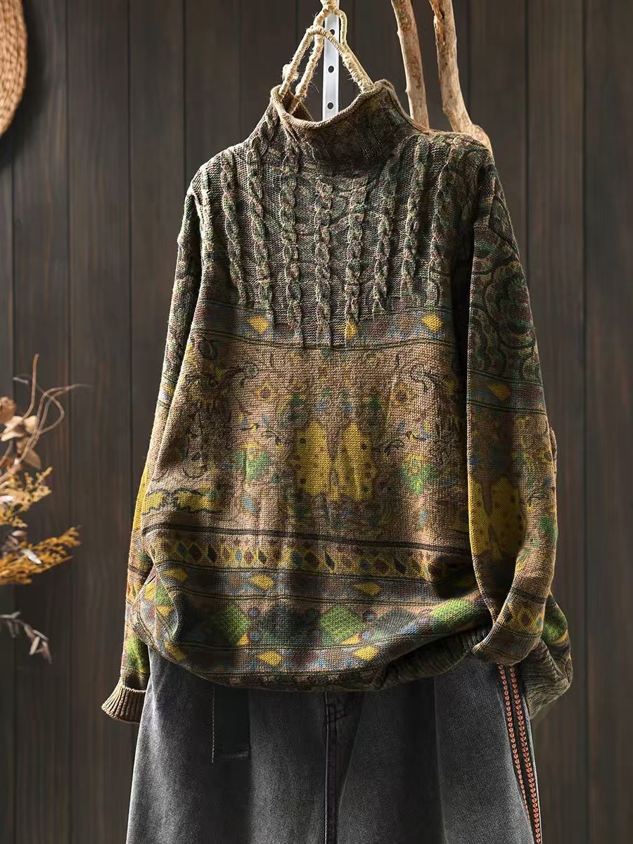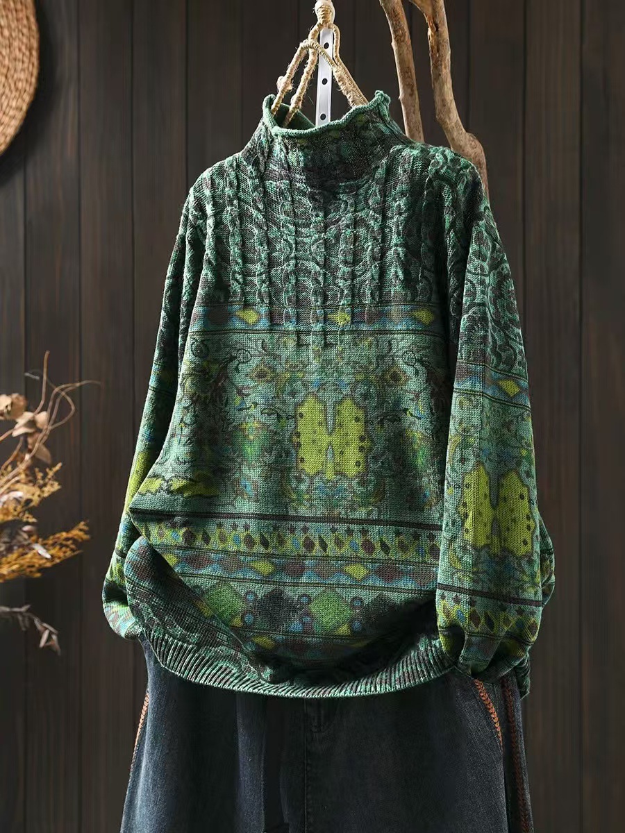 겨울 새로운 반 터틀넥 인쇄 면 스웨터 여성의 느슨한 슬리밍 빈티지 쿨 캐주얼 풀오버 82513