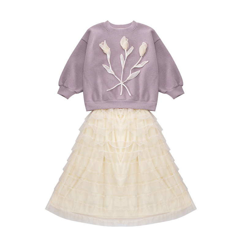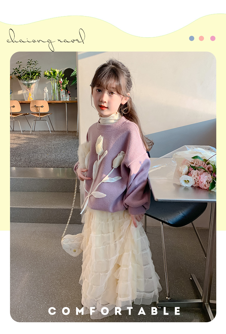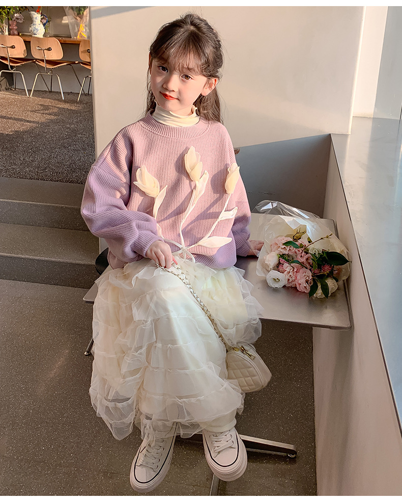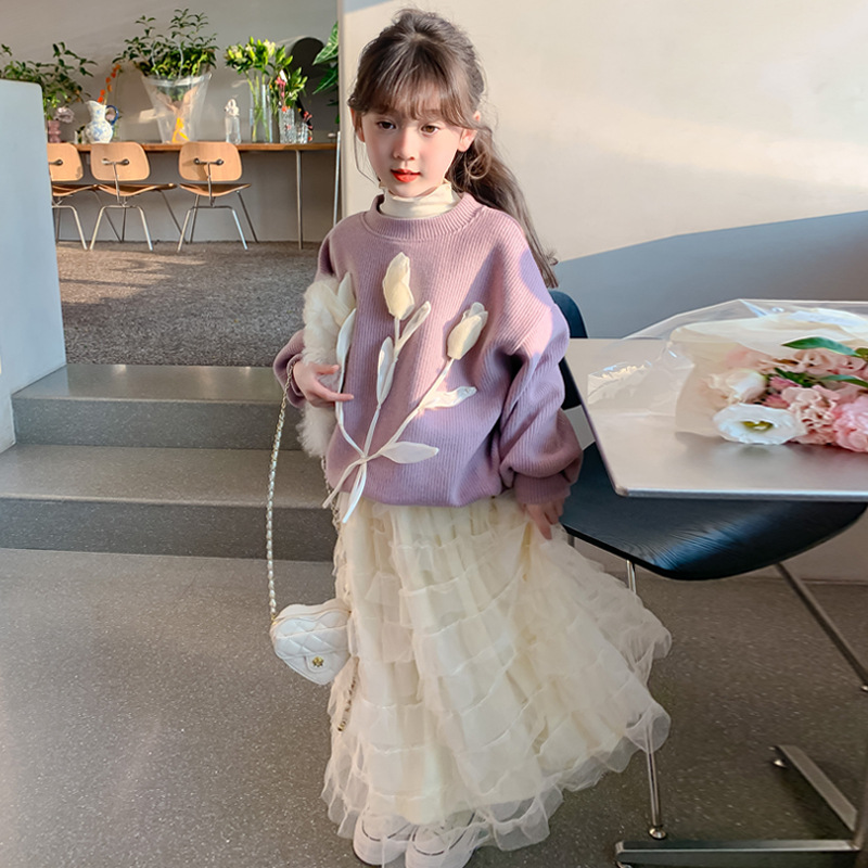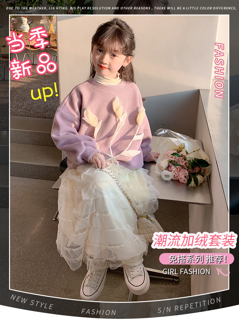 어린이 의류 소녀 공주 스타일 기모 스웨터 스커트 세트 2024 가을과 겨울 새로운 대형 어린이 유행 거즈 스커트 조수스토어 가기