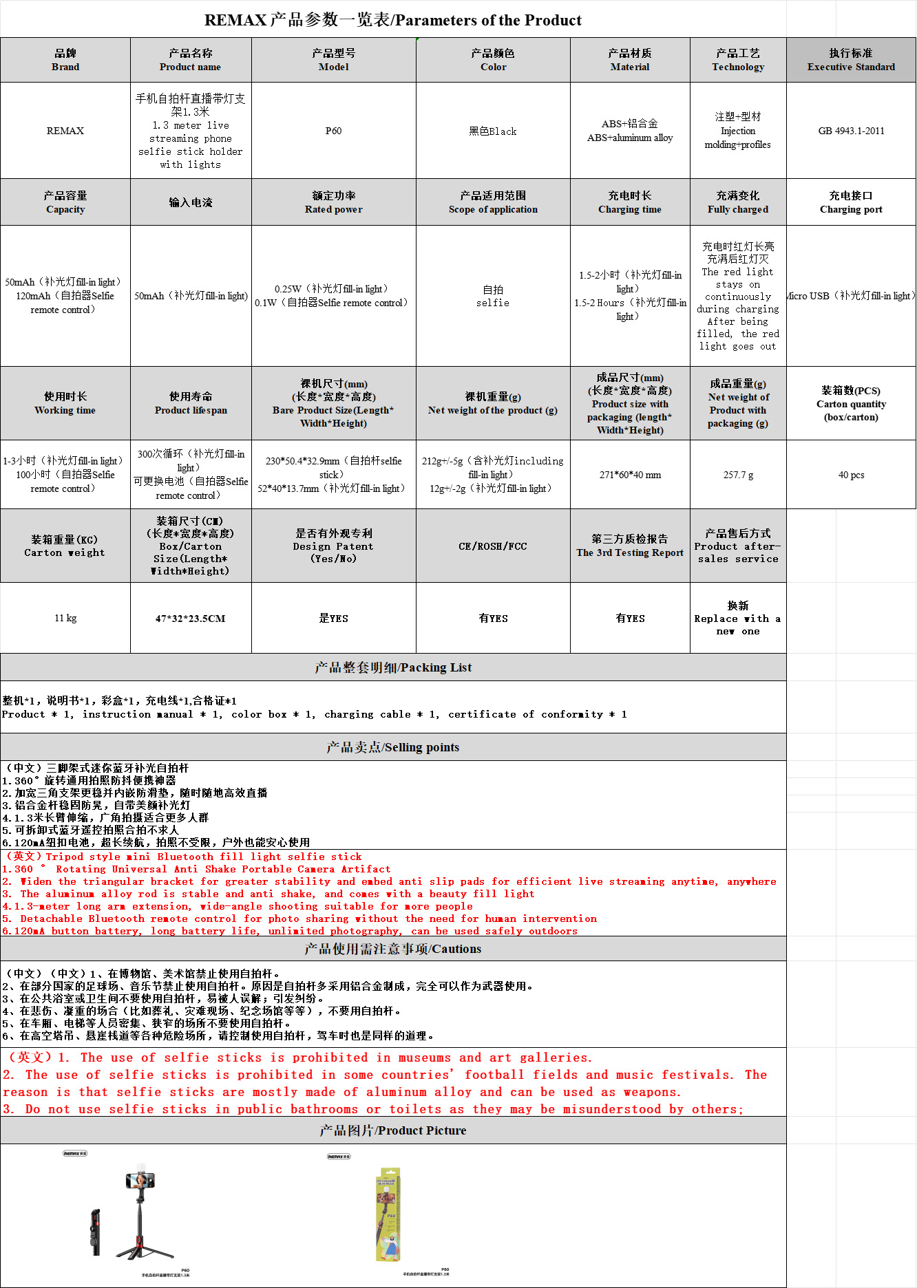 REMAX Rui 휴대 전화 블루투스 원격 제어 셀카 스틱 라이트 브래킷 1.3M 야외 삼각대 셀카 P60 라이브