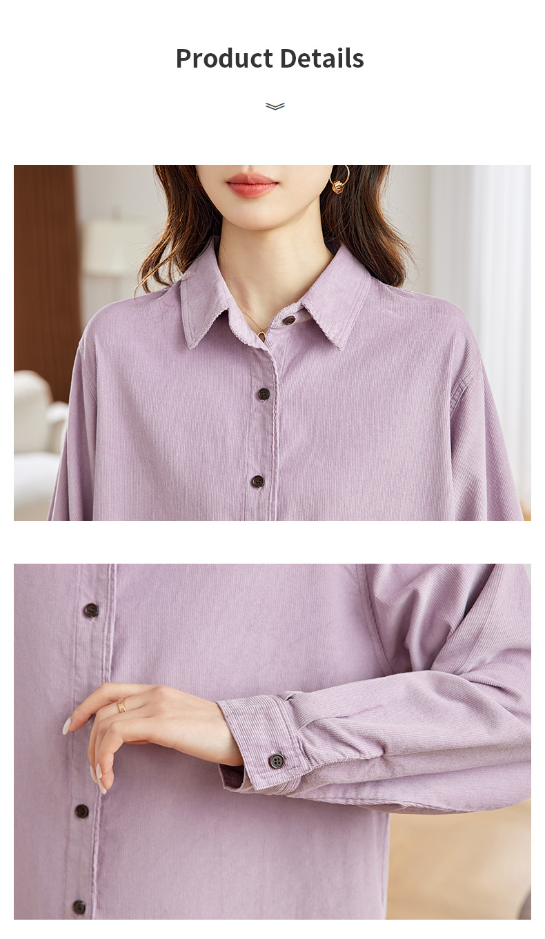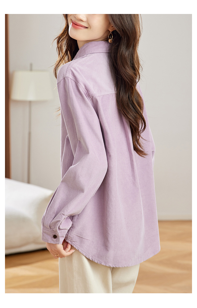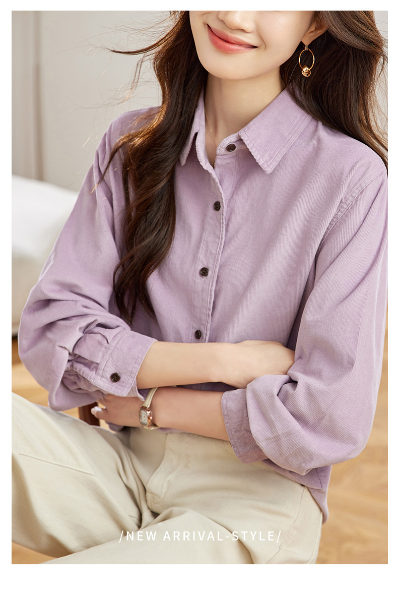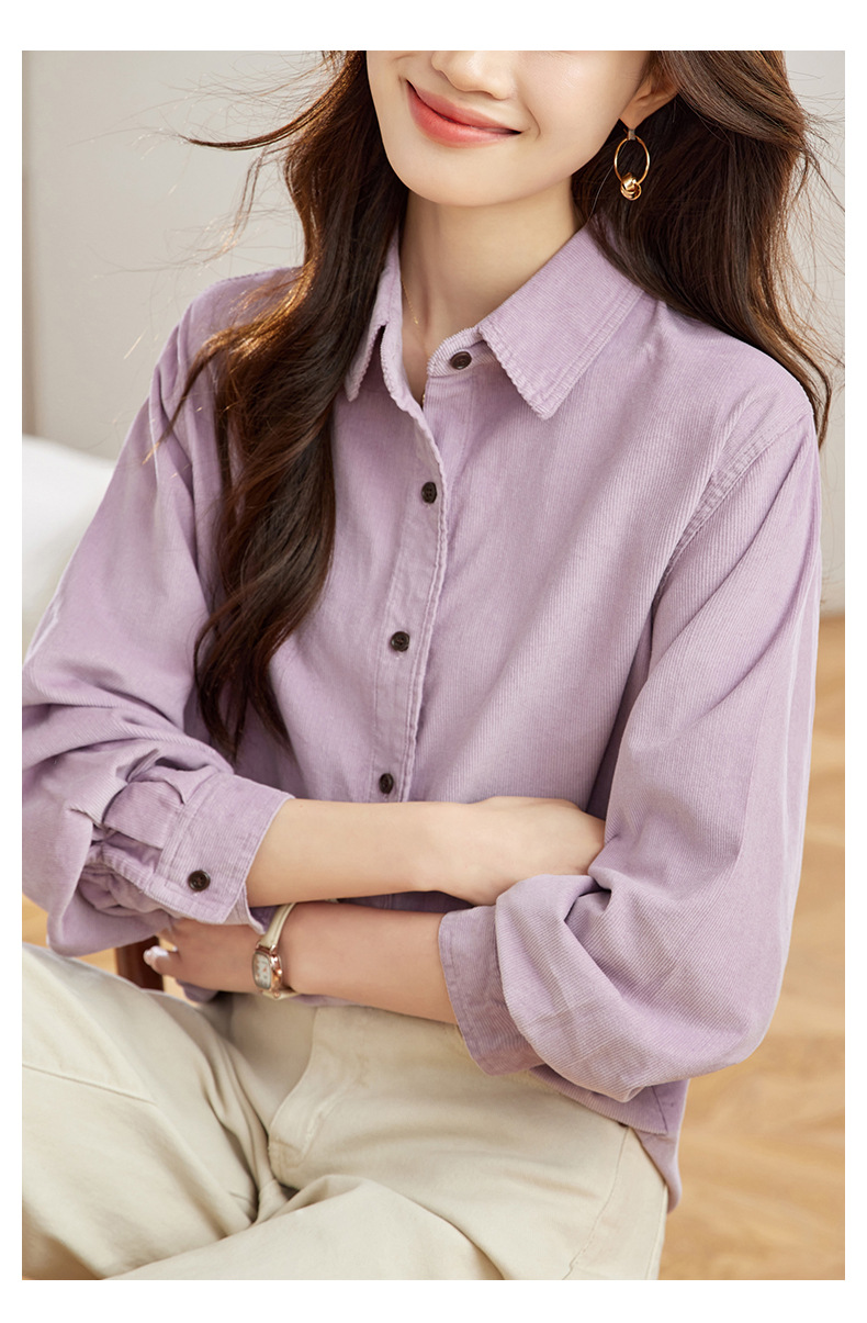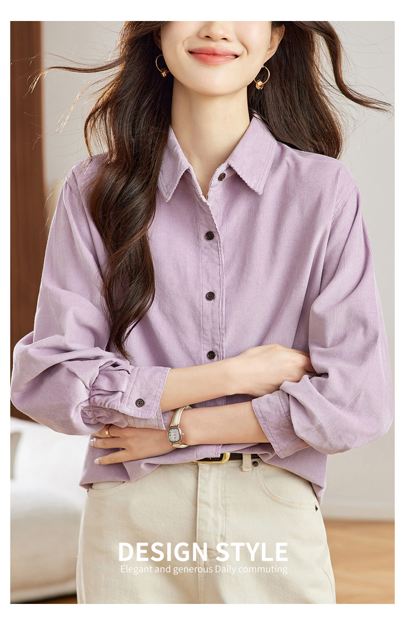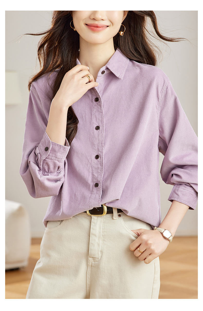 공장 직접 보라색 코듀로이 셔츠 긴 소매 2025 봄 새로운 간단한 통근 탑 한국 여성 셔츠