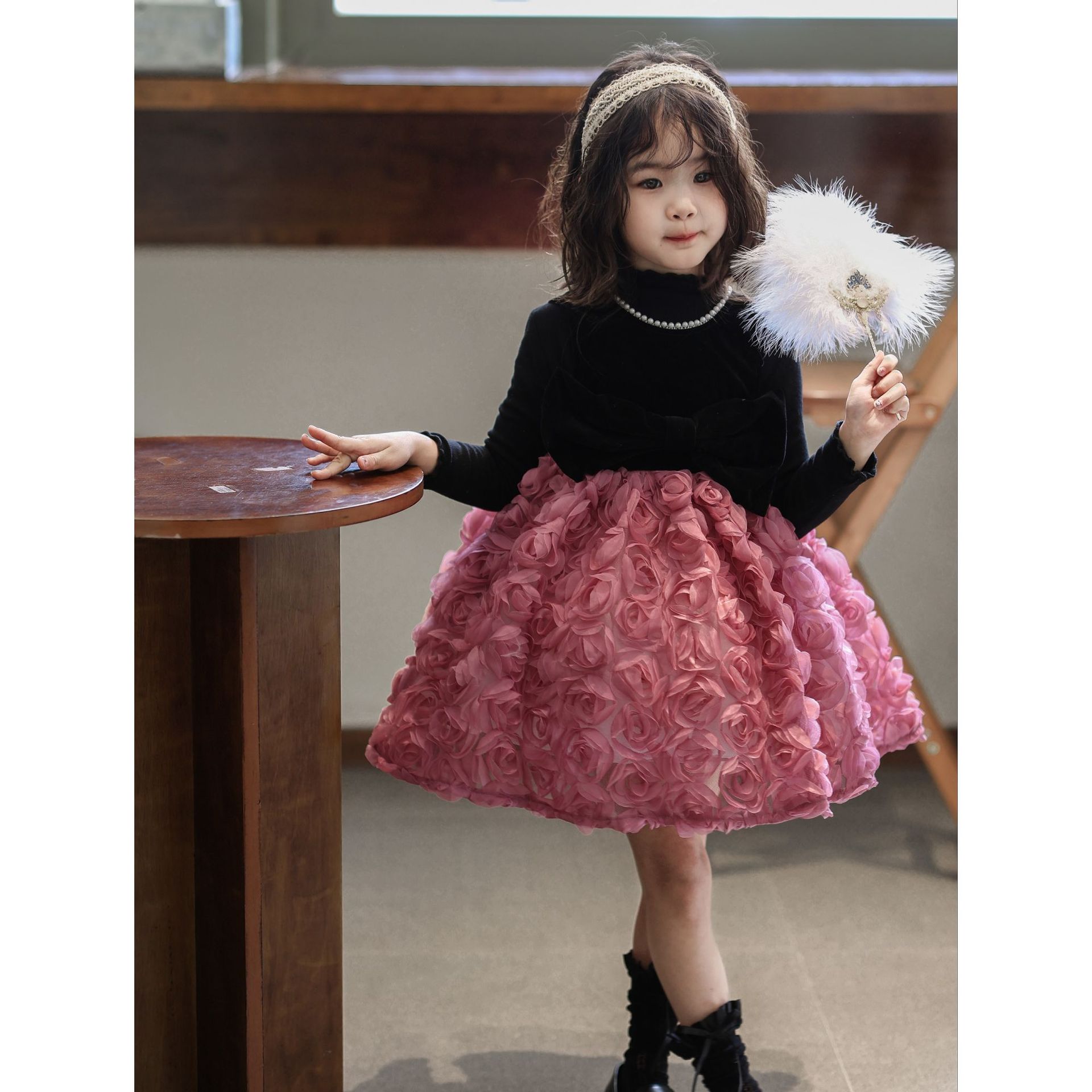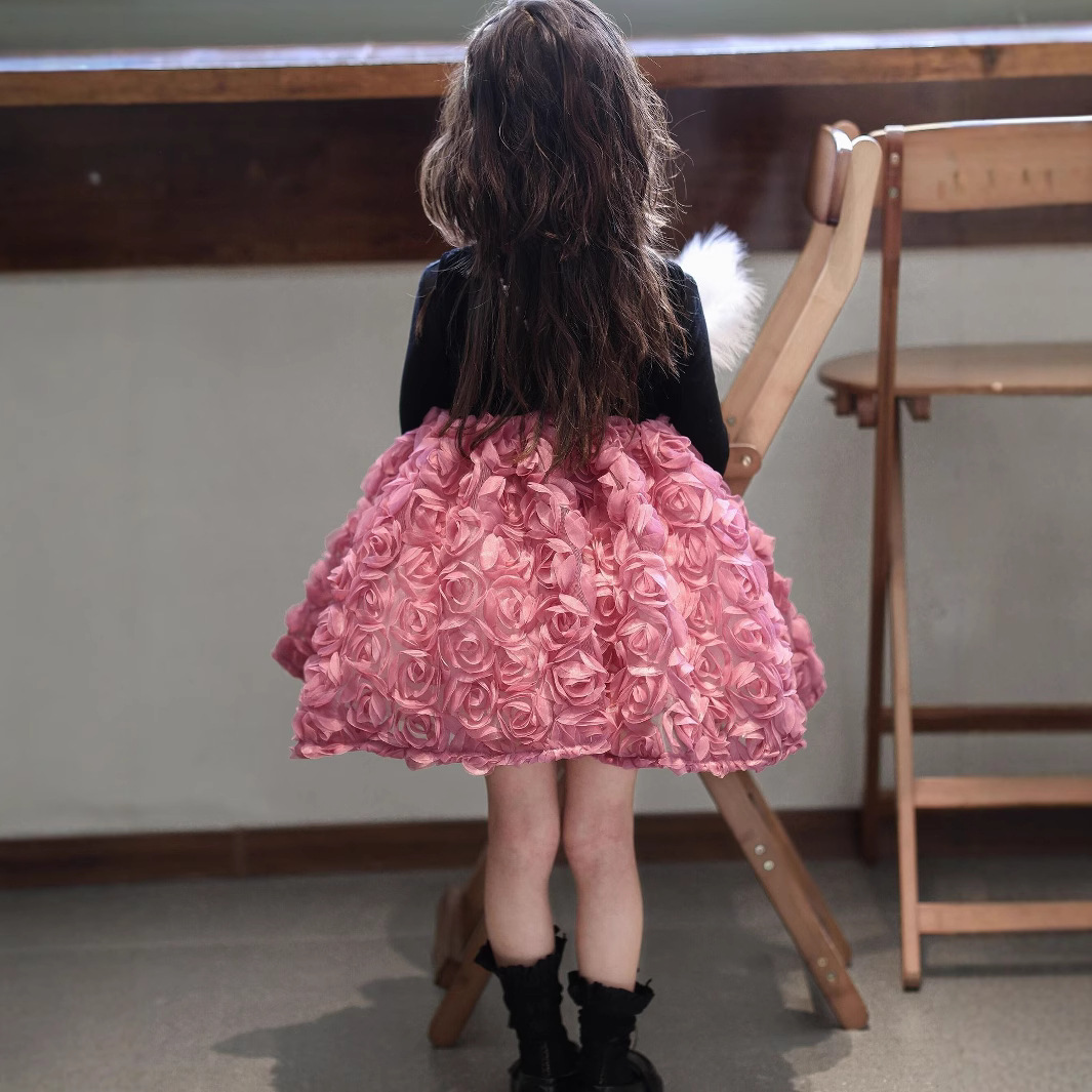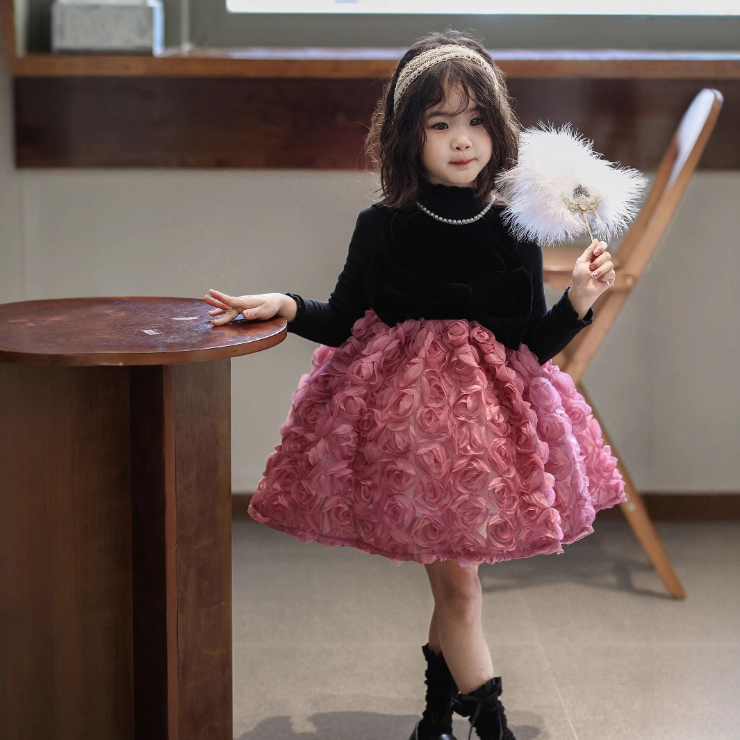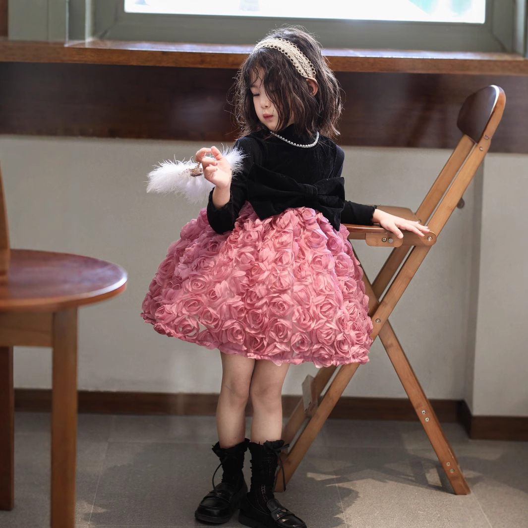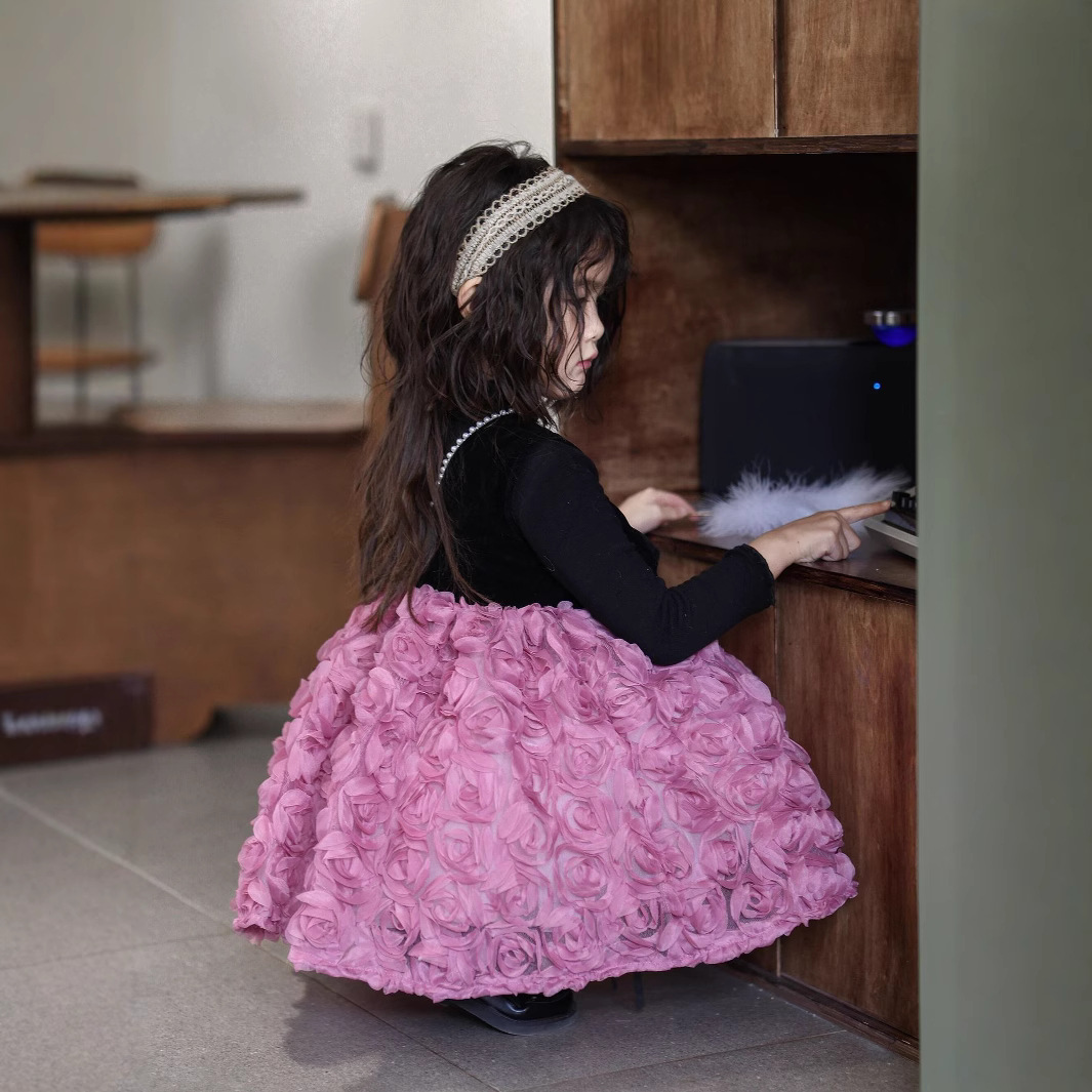 2025 가을 겨울 신상 여아 생일 공주 드레스 우아한 민소매 드레스 여아용 플러스 벨벳 장미꽃 망사 드레스스토어 가기