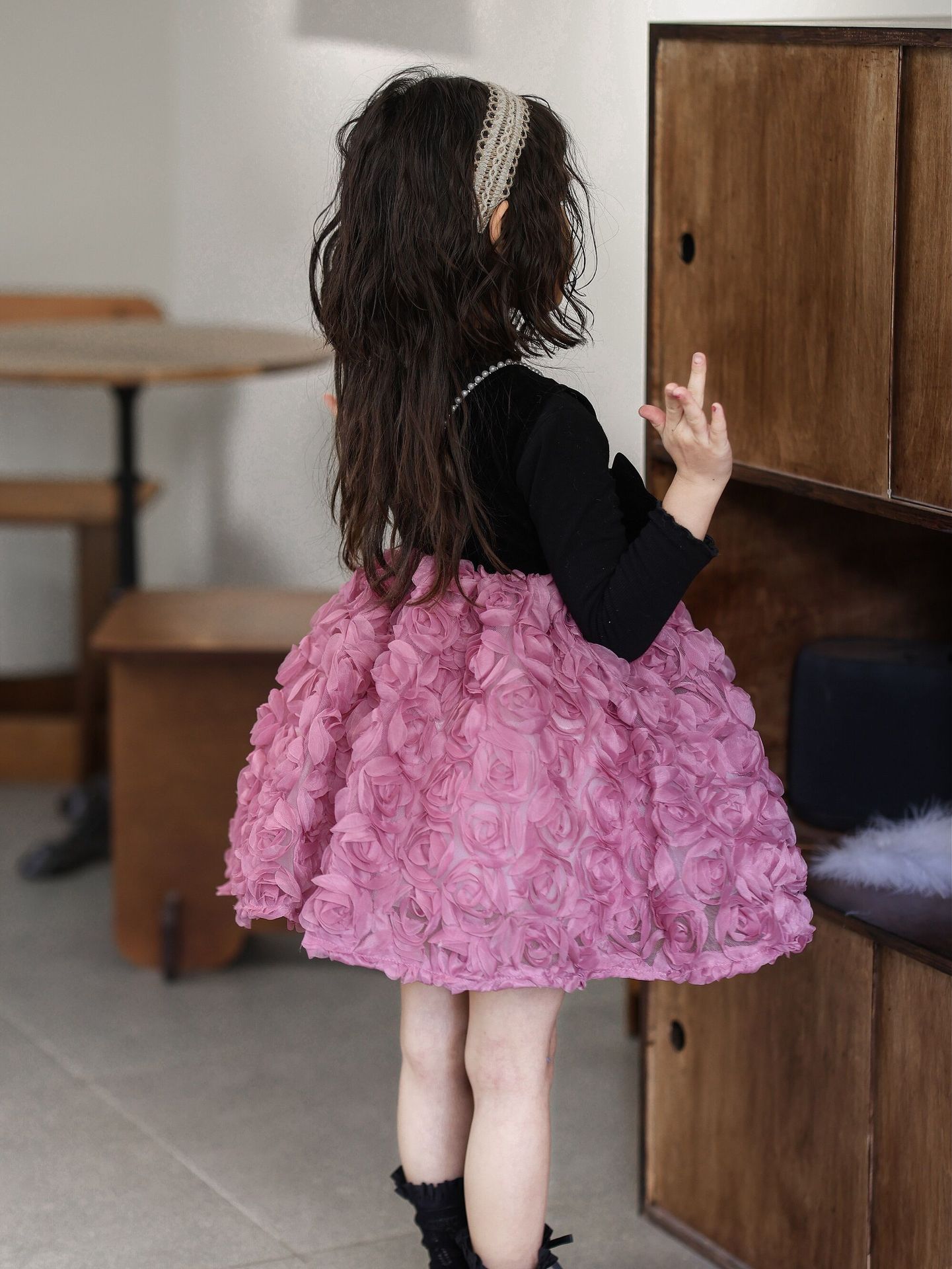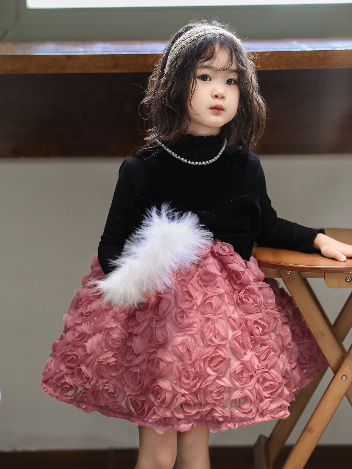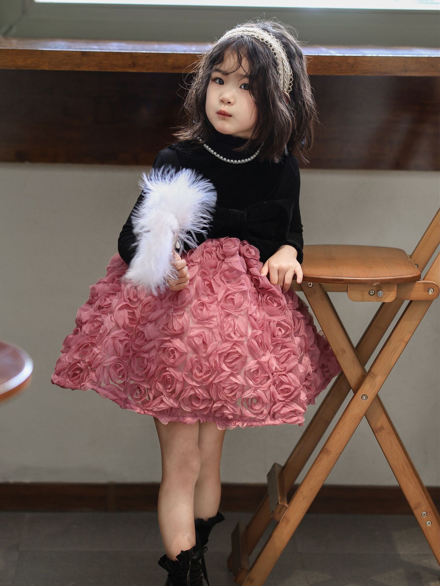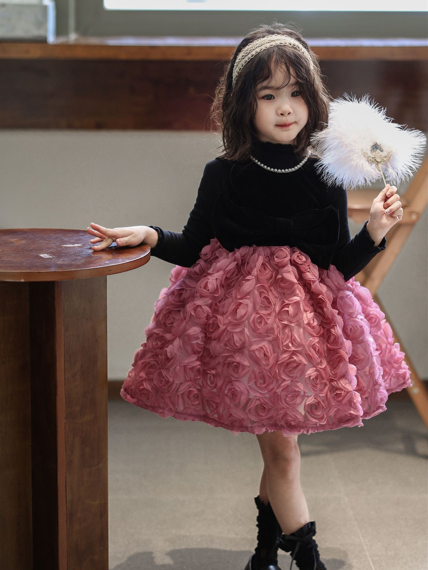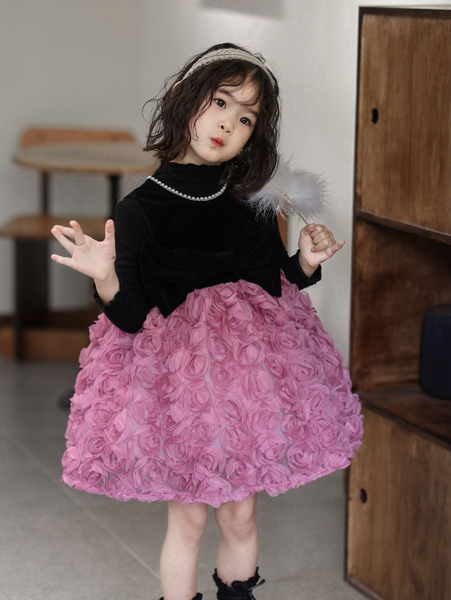 2025 가을 겨울 신상 여아 생일 공주 드레스 우아한 민소매 드레스 여아용 플러스 벨벳 장미꽃 망사 드레스스토어 가기