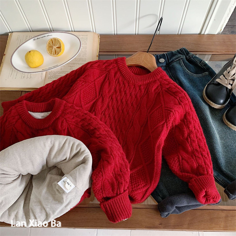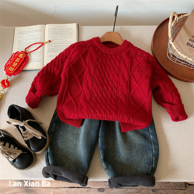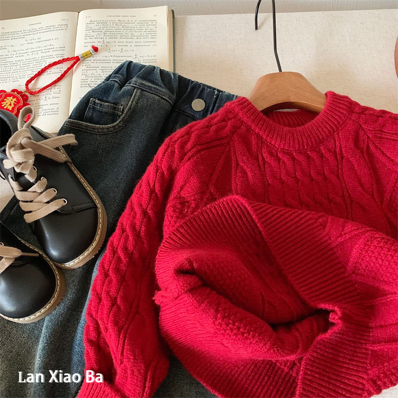 어린이 스웨터 2024 소년과 소녀를위한 겨울 레트로 트위스트 풀오버 아기의 새해 서양식 니트 셔츠 연례 착용 두꺼운 패션스토어 가기