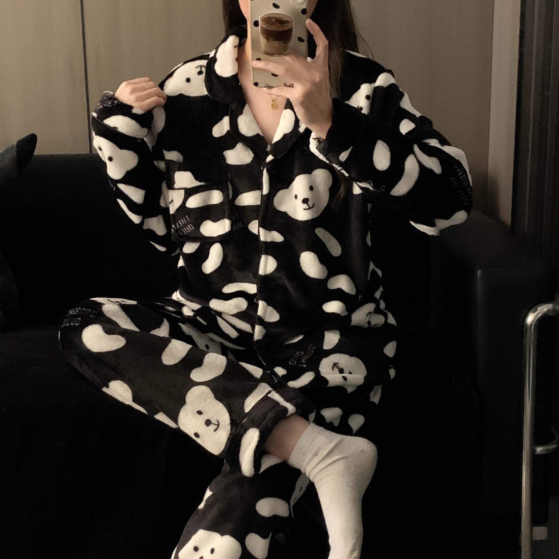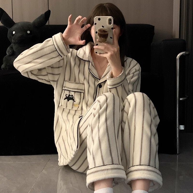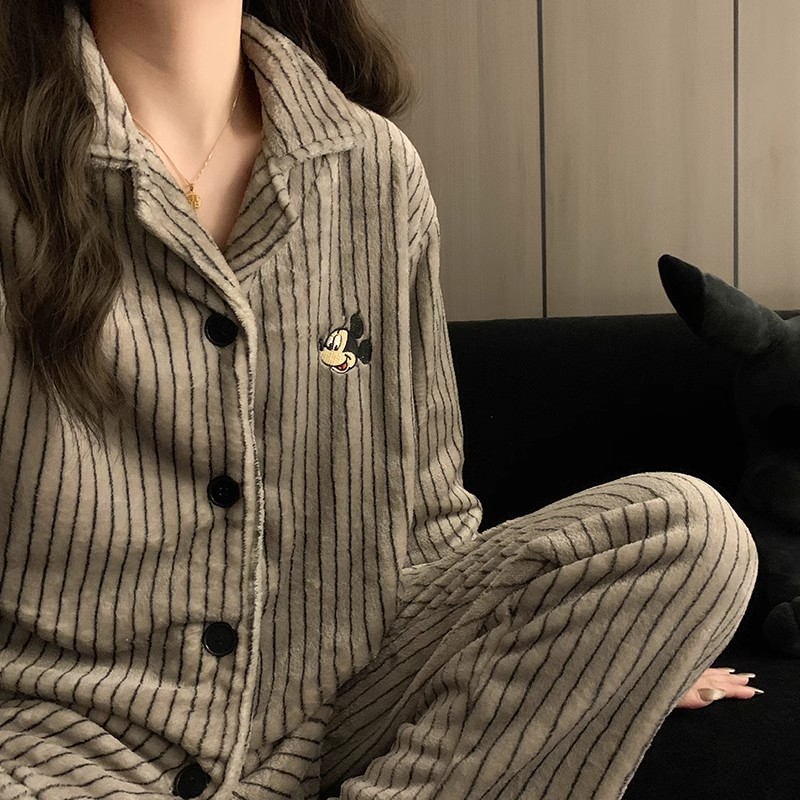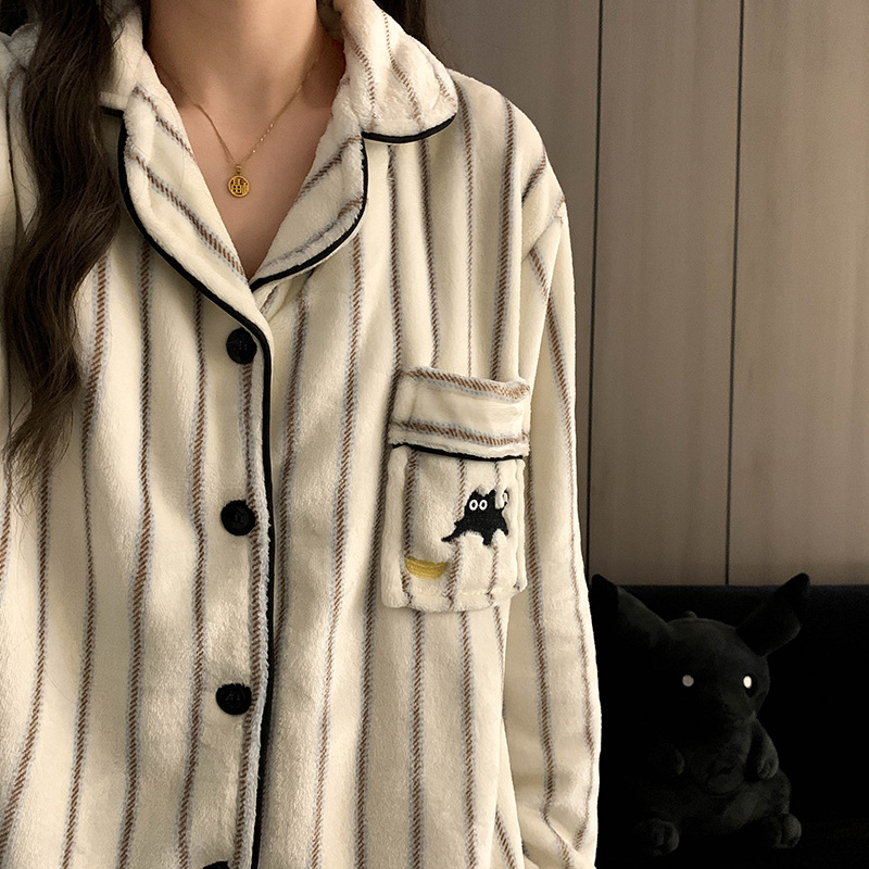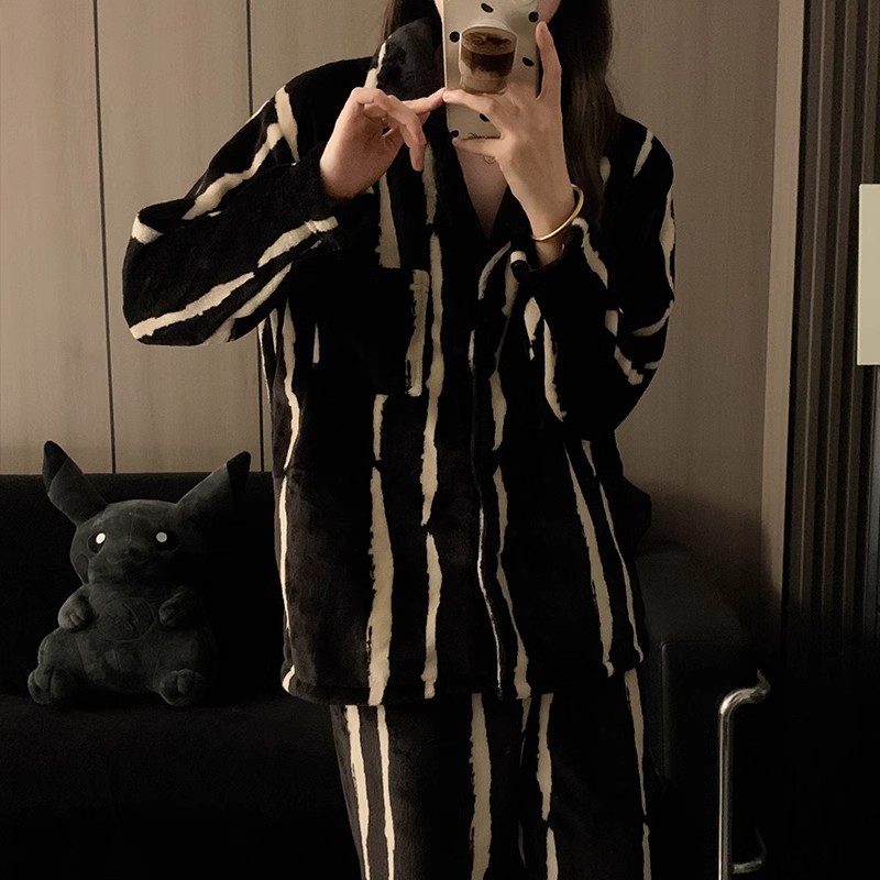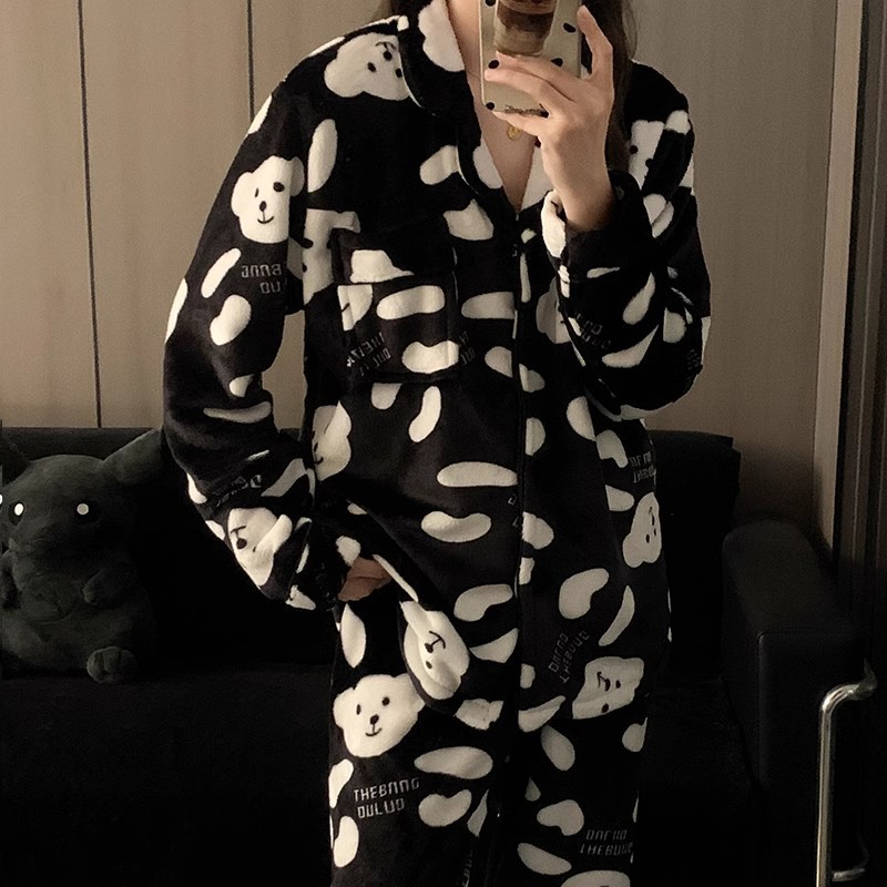 검은 만화 레트로 스타일 겨울 두꺼운 산호 양털 파자마 남자 기모 플란넬 가을과 겨울 홈 옷스토어 가기