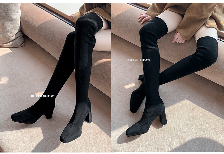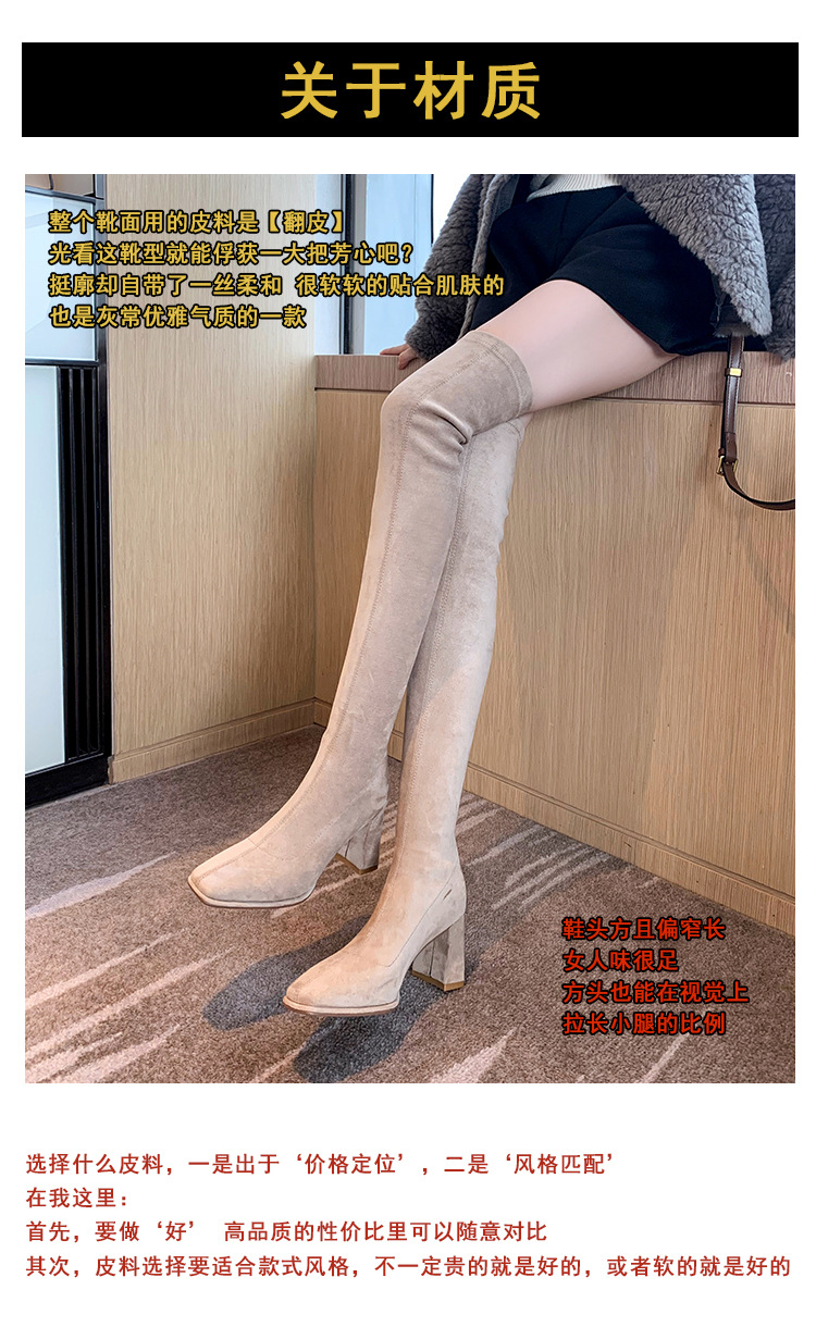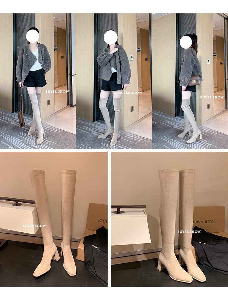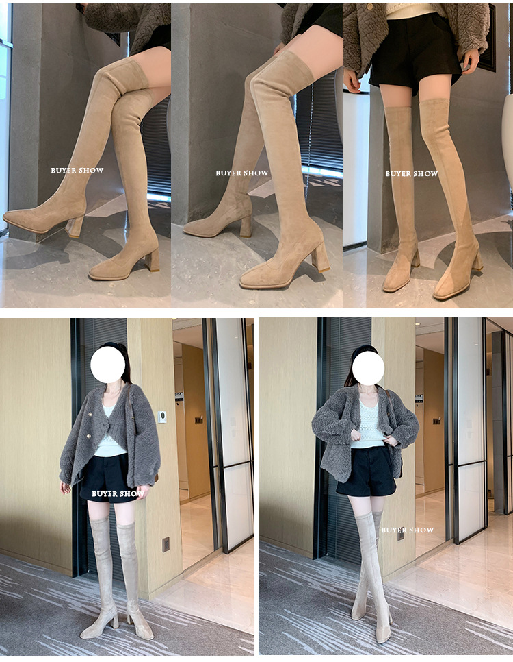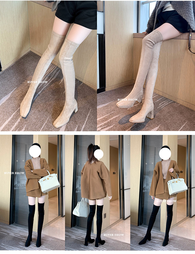 월라이아 스퀘어토 카키색 롱부츠 여성용 무릎 위 부츠 가을 겨울 신상품 플러스벨벳 하이힐 신축성 슬림 부츠 롱부츠스토어 가기