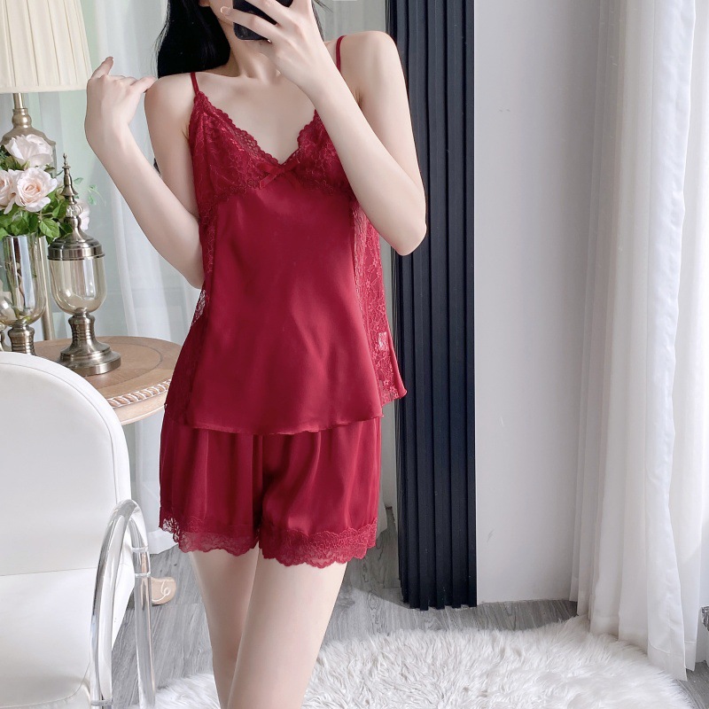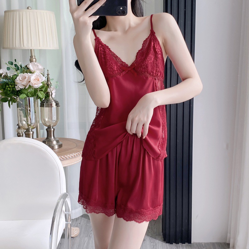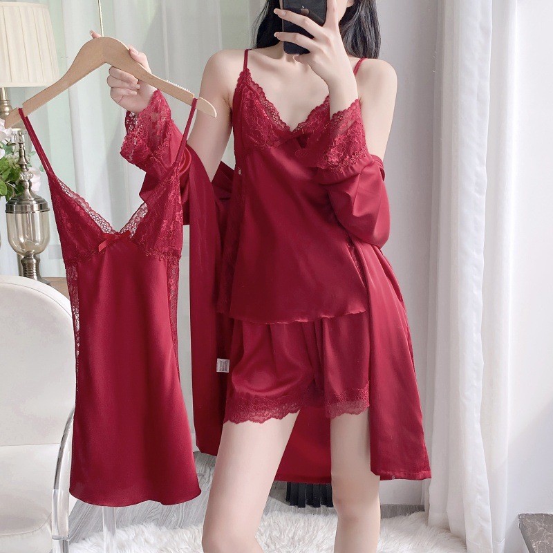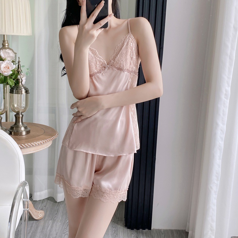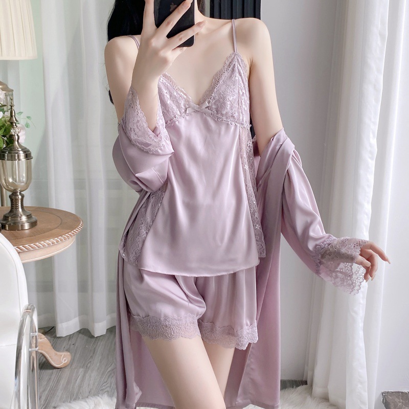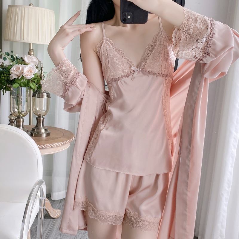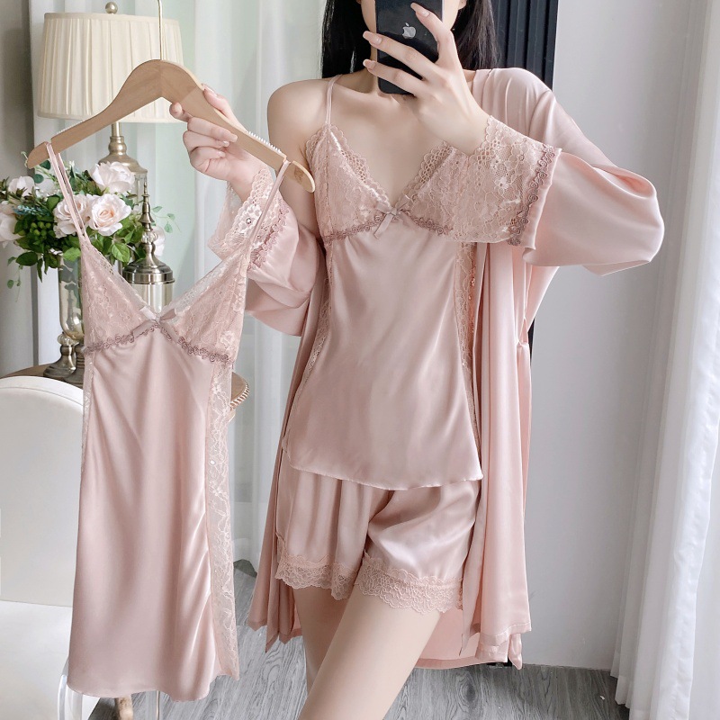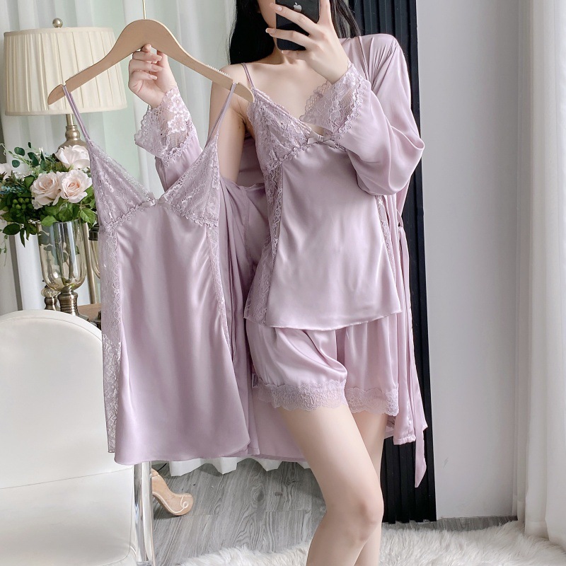 공장 도매 잠옷 여성 여름 얇은 유방 패드 아이스 실크 모조 실크 잠옷 여성 멜빵 4 피스 홈 의류스토어 가기