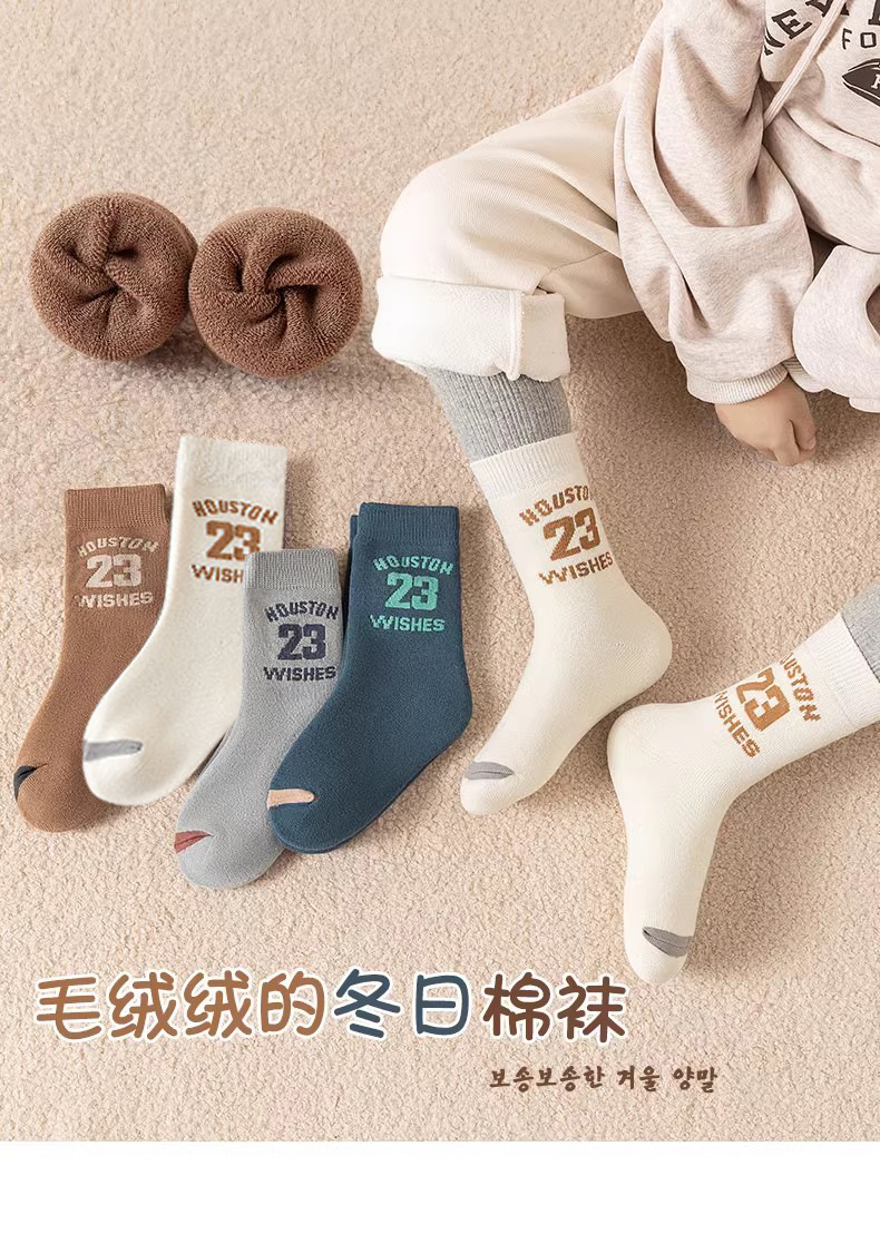 소년 양말 겨울 기모 두꺼운 미드 튜브 양말 대형 어린이 영어 디지털 다크 브라운 단색 따뜻한 양말