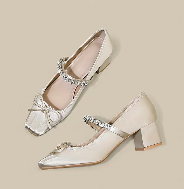 작은 향기로운 스타일의 라인석 고급 두꺼운 뒤꿈치 신발 새로운 대외 무역 스퀘어 헤드 싱글 레이어 신발 활 디자인 새틴 타이 저우 여성 신발스토어 가기