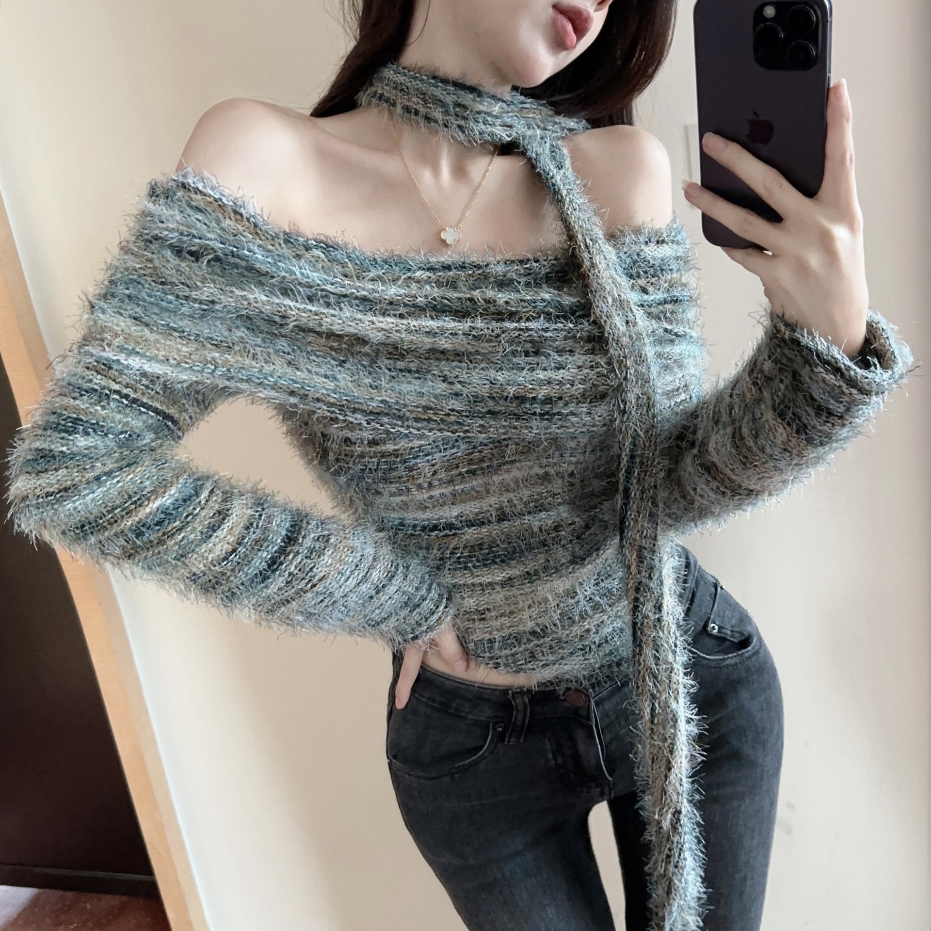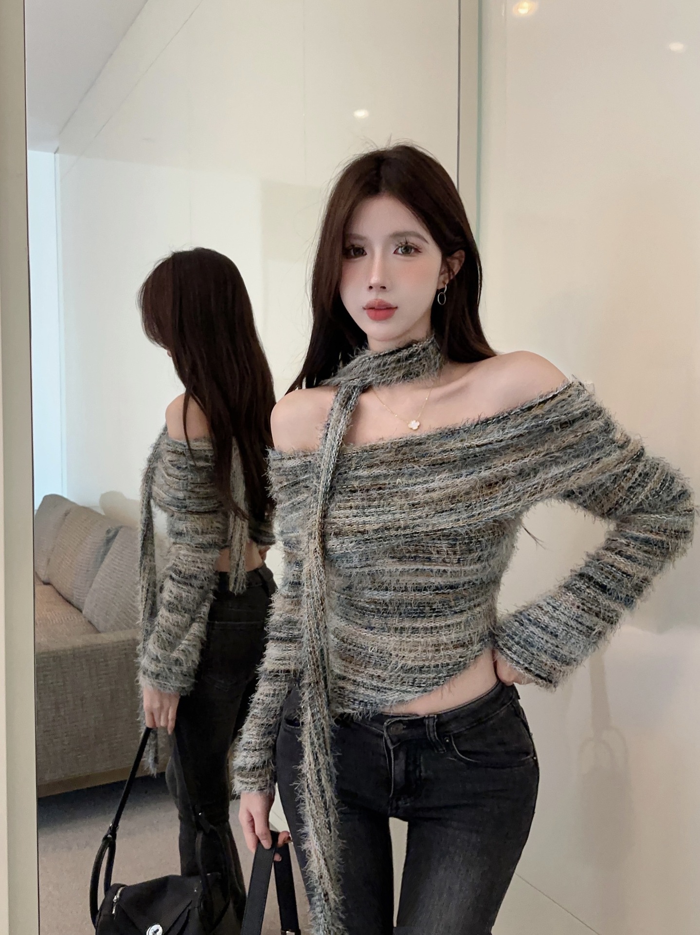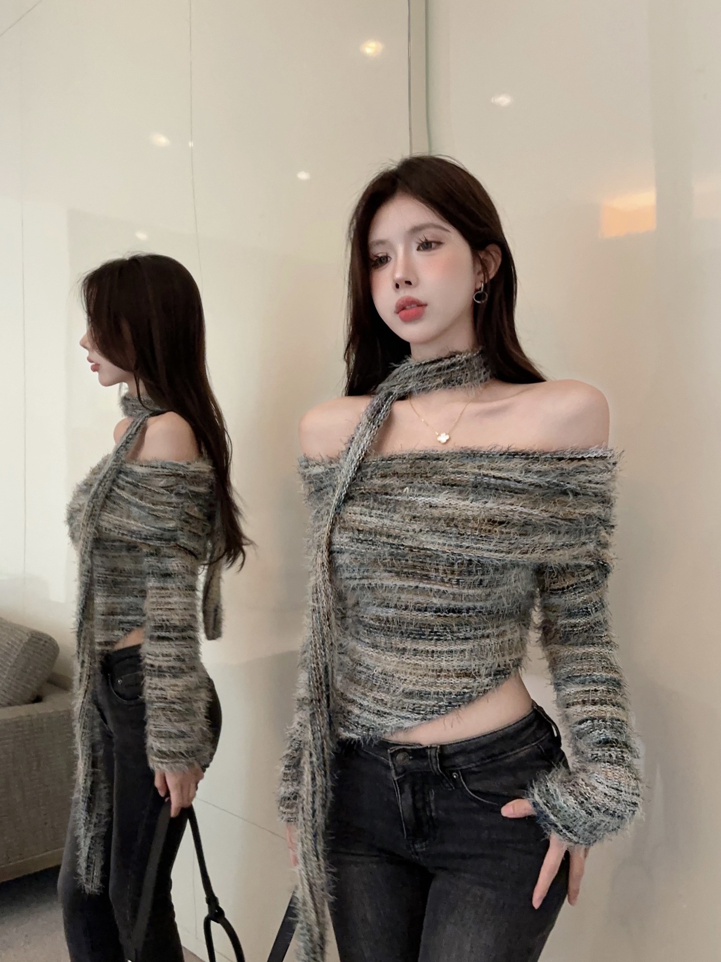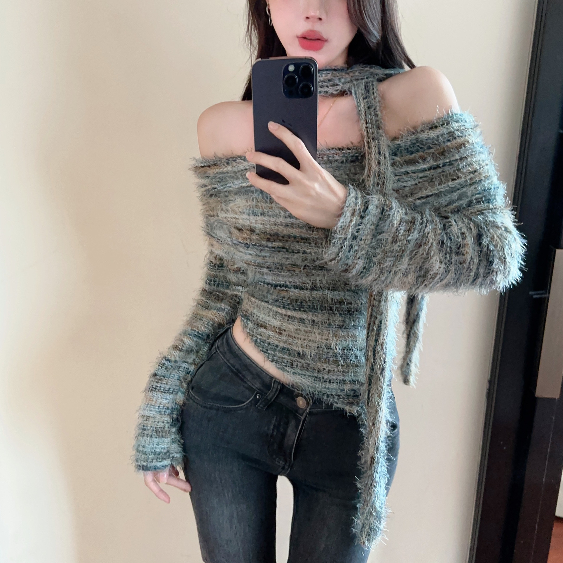 순수한 욕망 스파이스 소녀 바람 매달려 목 리본 오프 숄더 니트웨어 여성용 가을 및 겨울 불규칙한 소프트 왁스 스웨터베이스 셔츠 트렌디