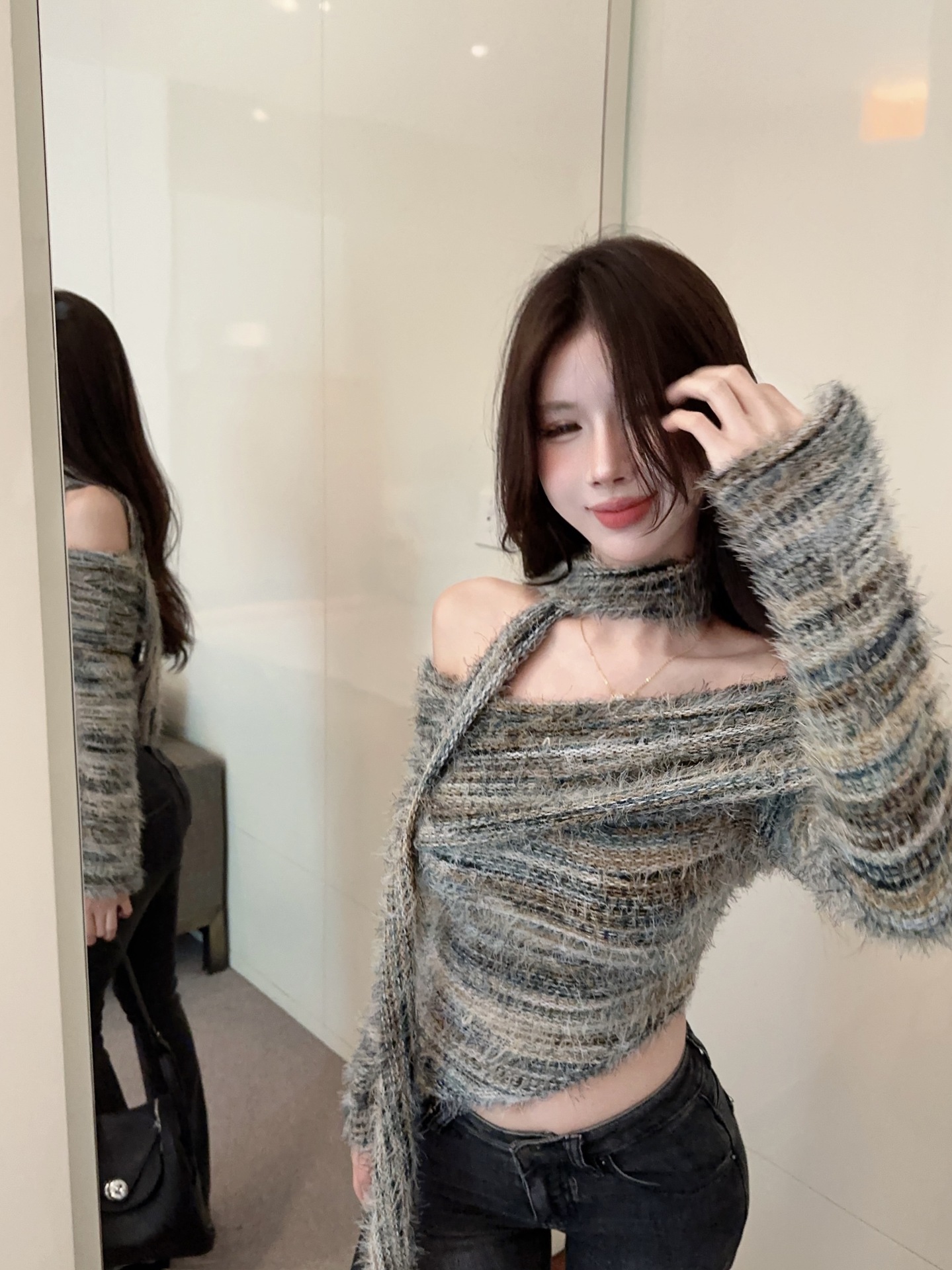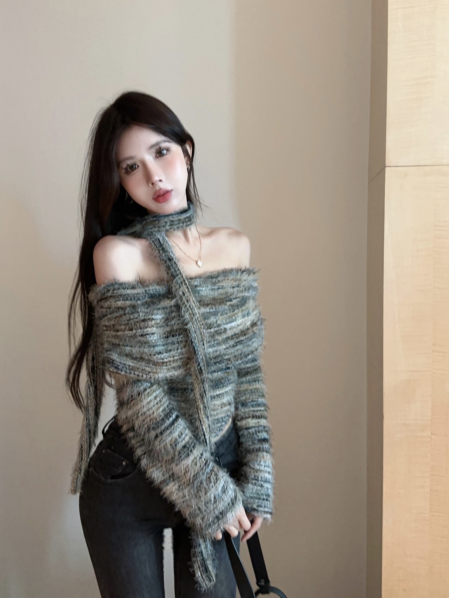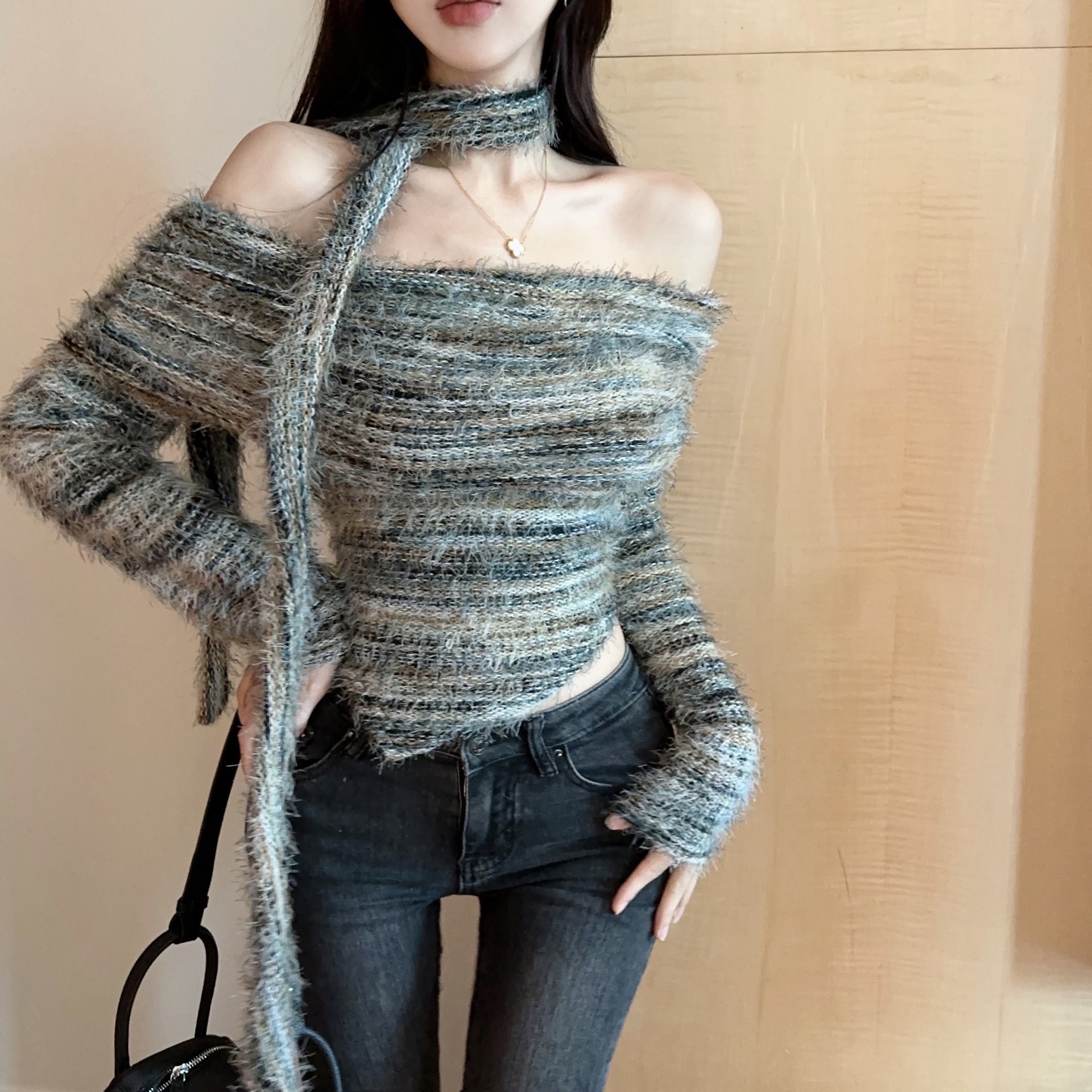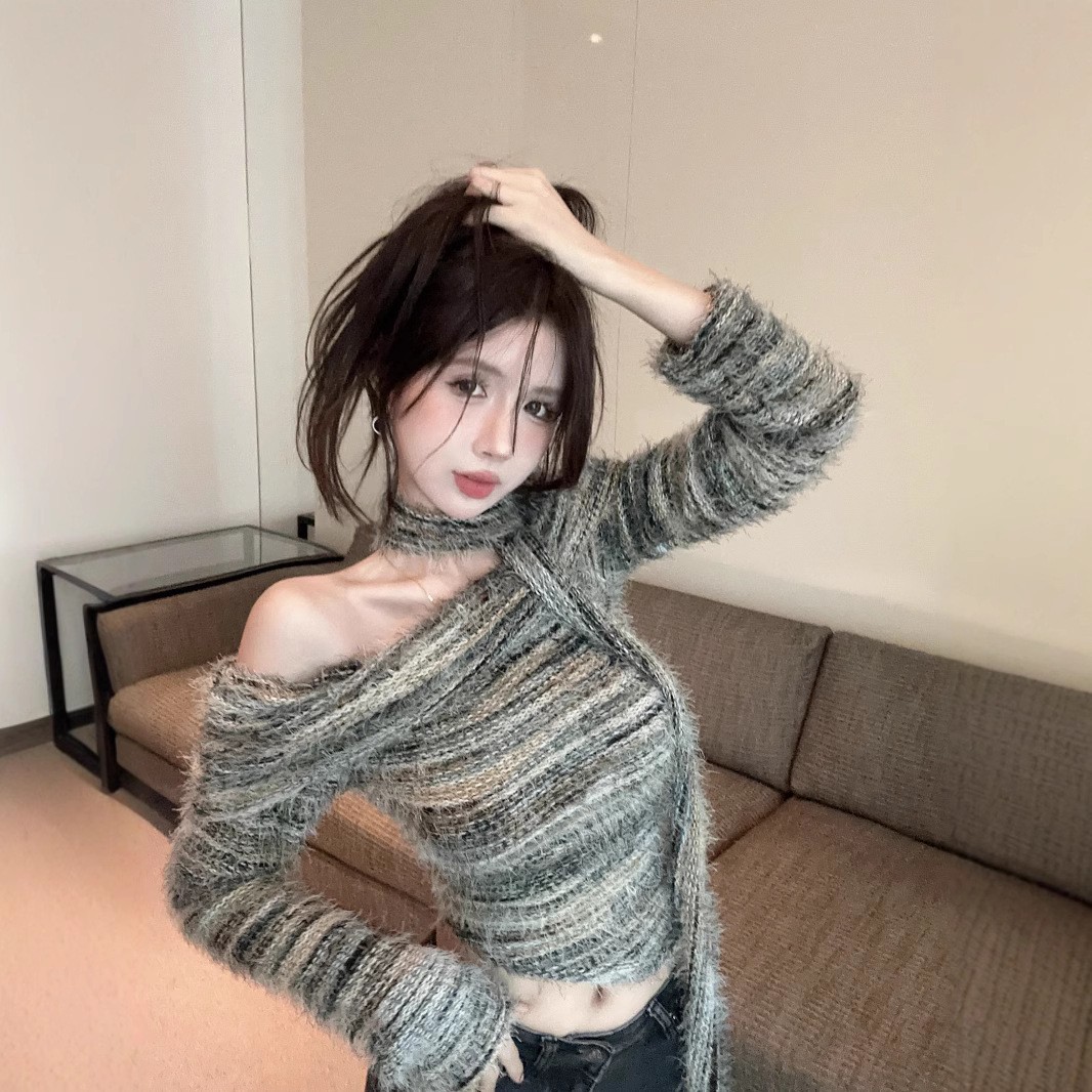 순수한 욕망 스파이스 소녀 바람 매달려 목 리본 오프 숄더 니트웨어 여성용 가을 및 겨울 불규칙한 소프트 왁스 스웨터베이스 셔츠 트렌디