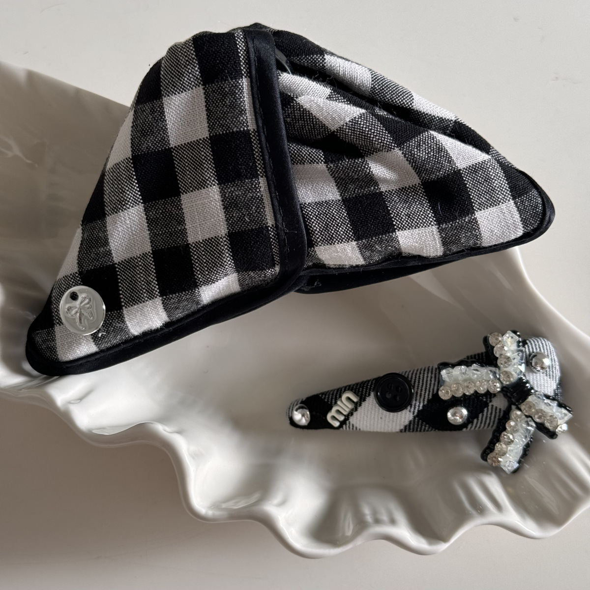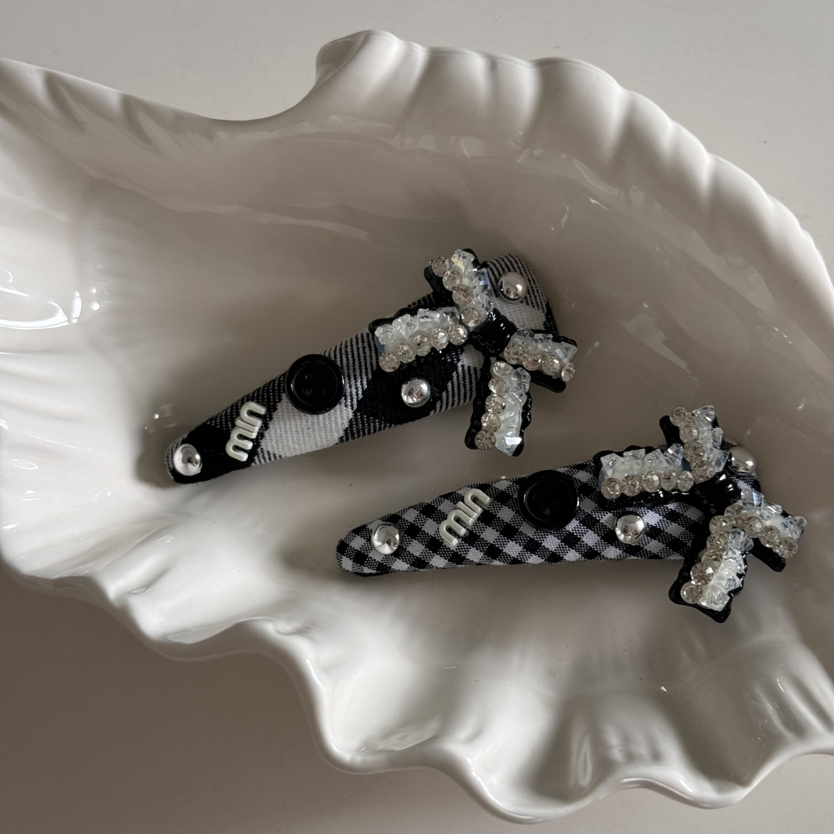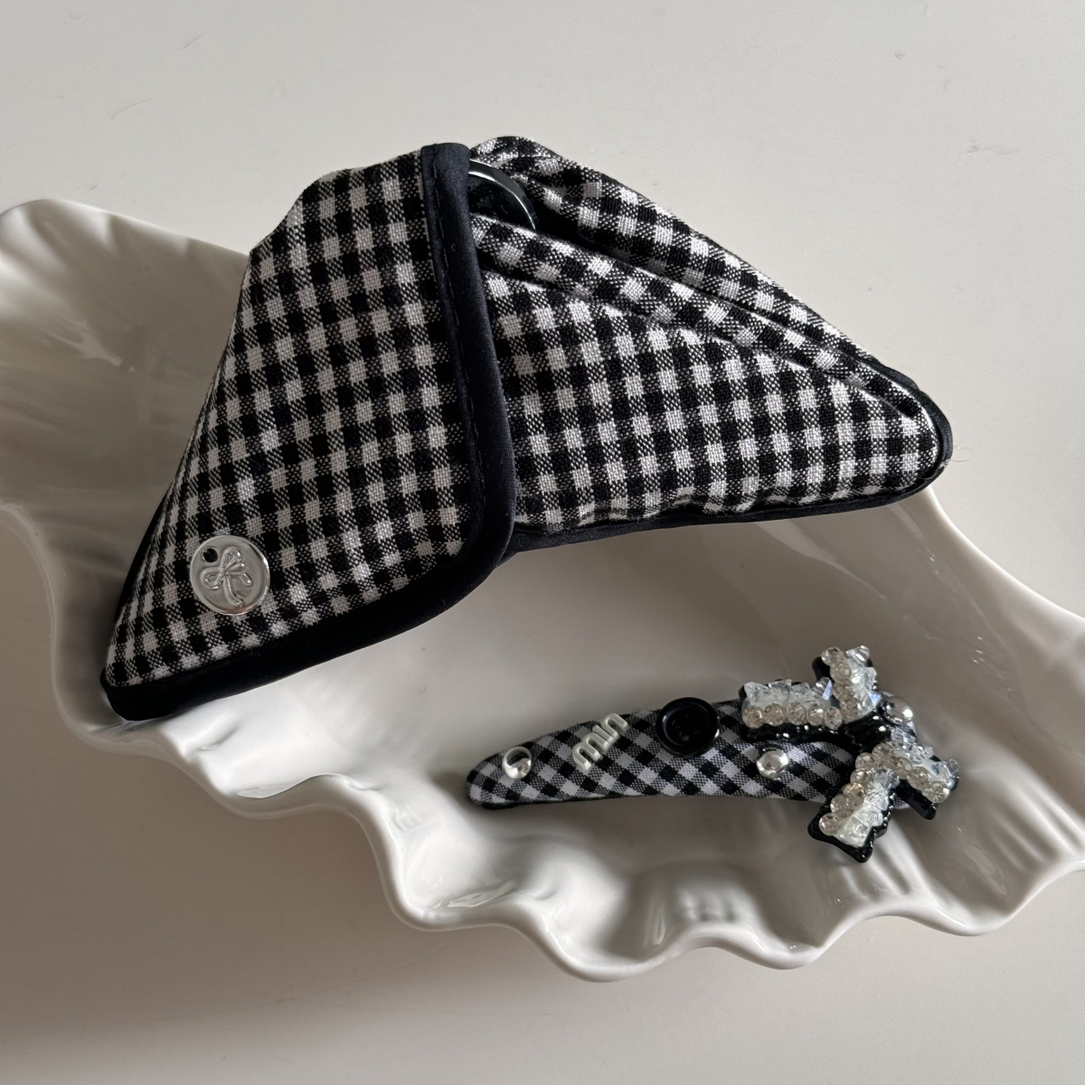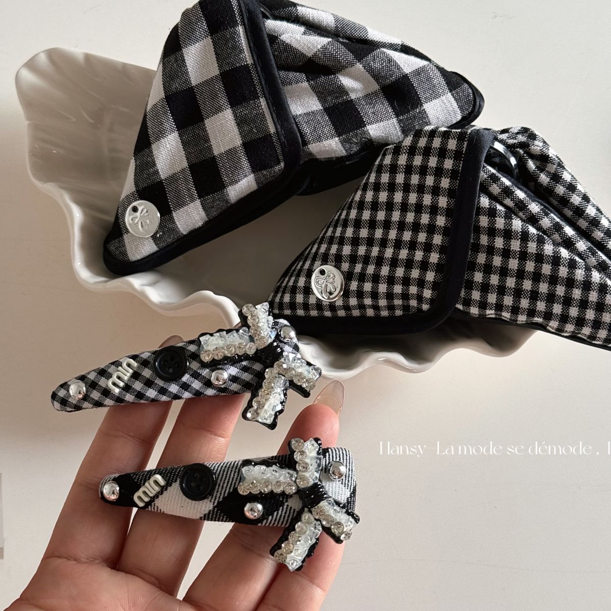 고급 흑백 격자 무늬 헝겊 삼각형 그랩 클립 상어 클립 머리핀 BB 클립 라인스톤 매듭 머리 액세서리
