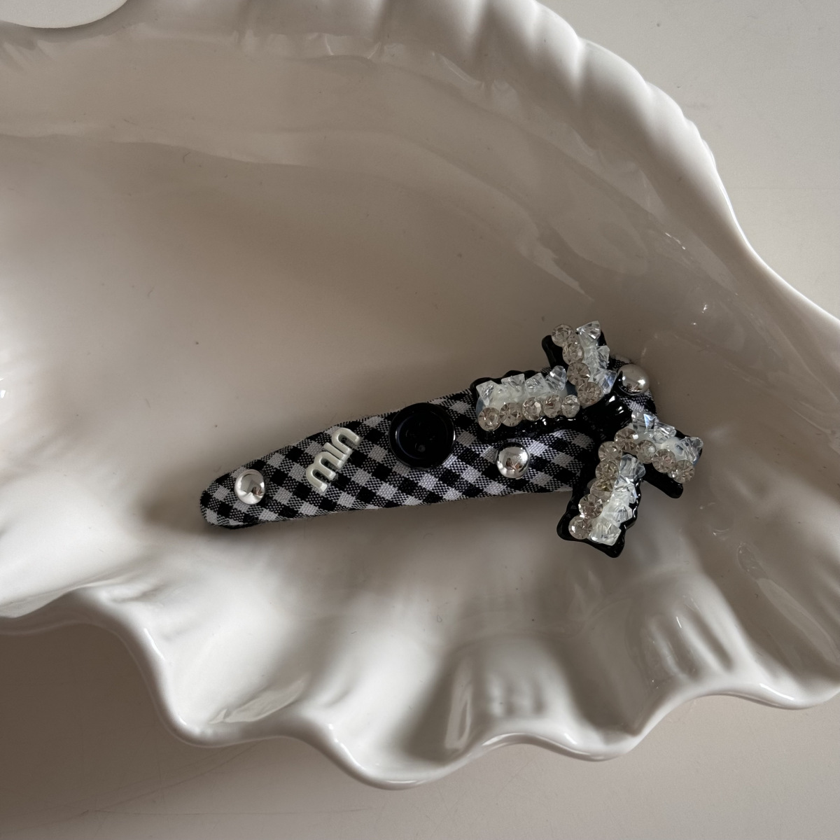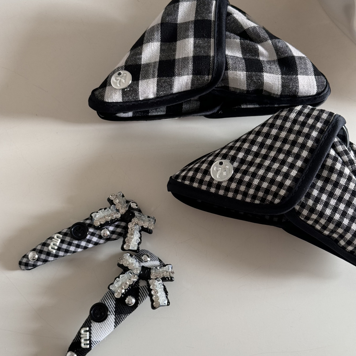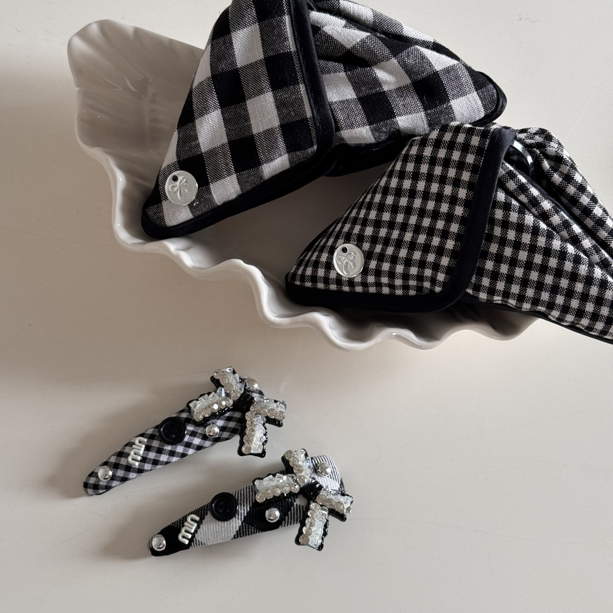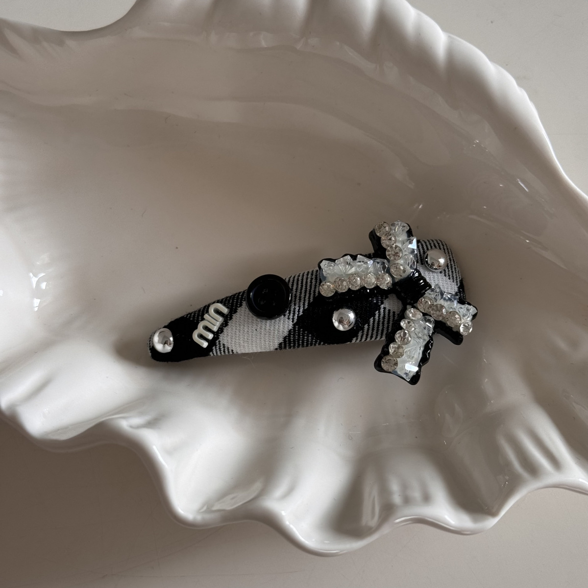 고급 흑백 격자 무늬 헝겊 삼각형 그랩 클립 상어 클립 머리핀 BB 클립 라인스톤 매듭 머리 액세서리