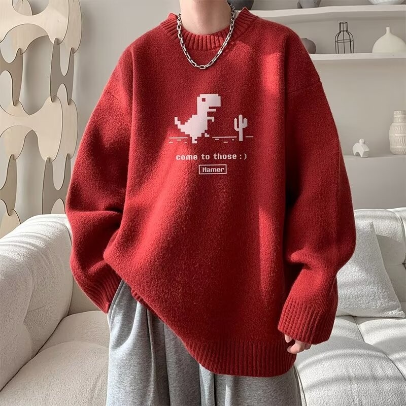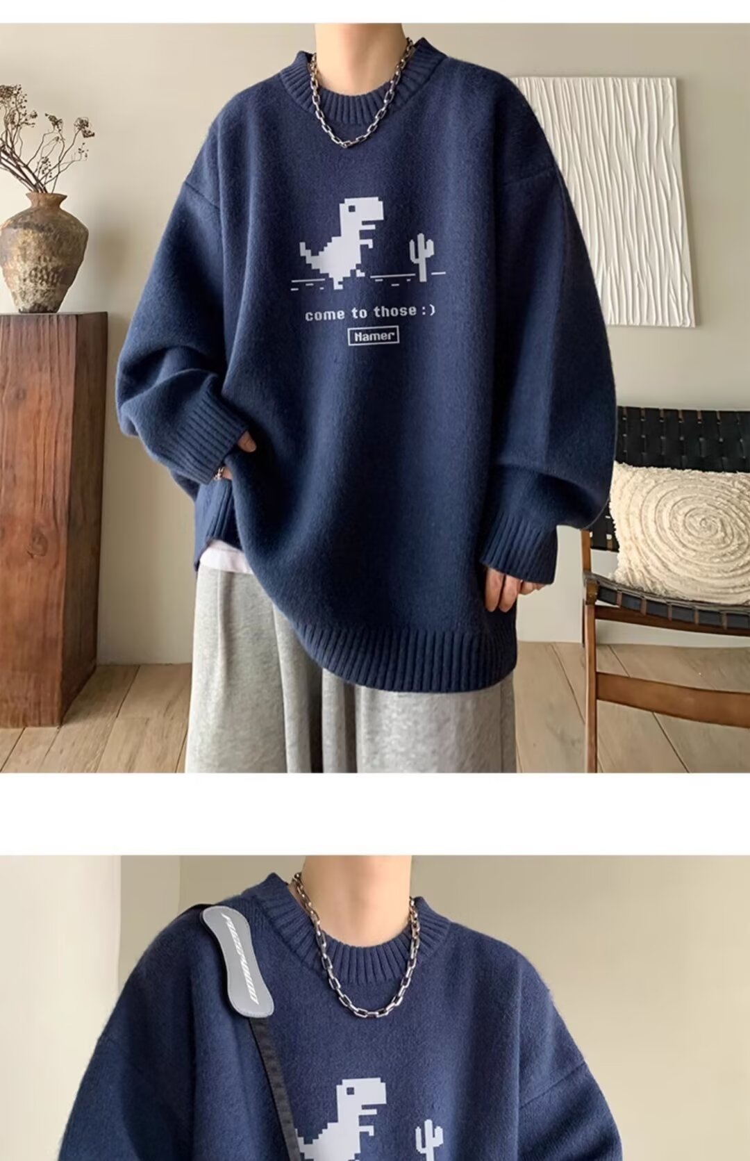 아메리칸 스타일 레트로 공룡 인쇄 스웨터 남성 플러스 사이즈 가을과 겨울 새로운 패션 브랜드 느슨한 니트 스웨터 재킷스토어 가기