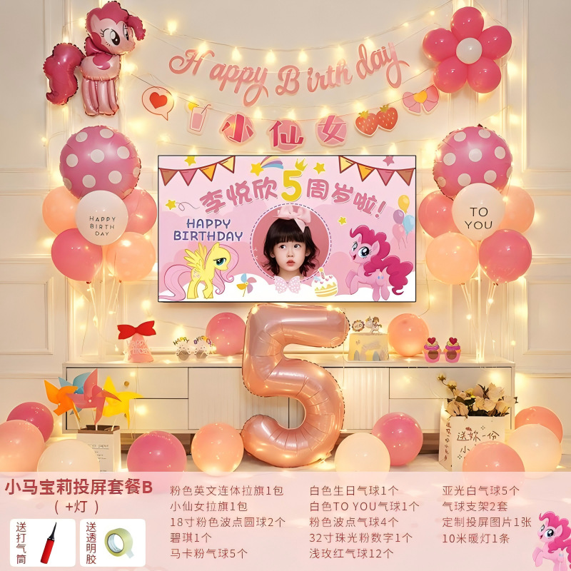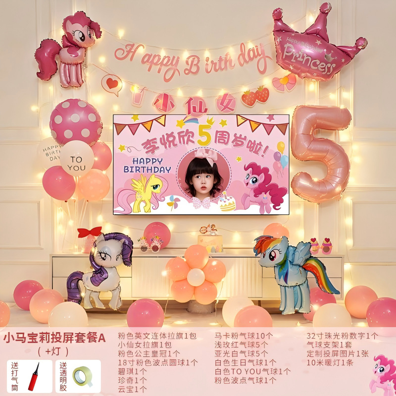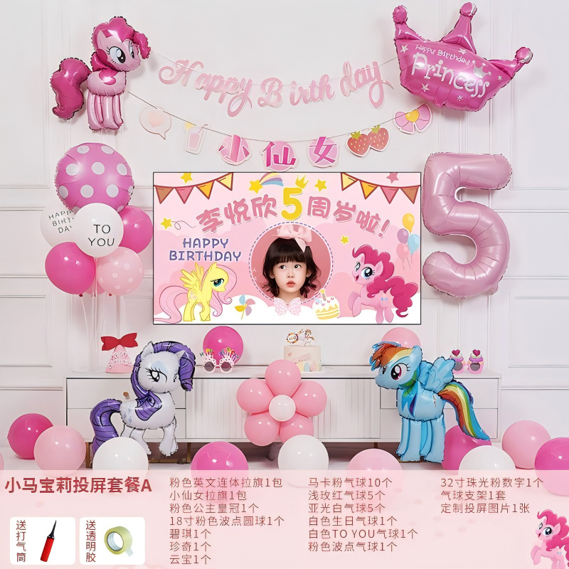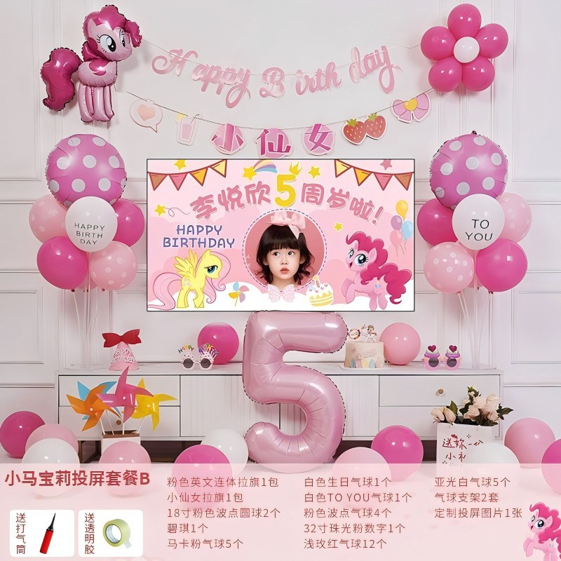 포니 폴리 테마 생일 풍선 장식 장면 레이아웃 유니콘 배경 벽 공주 어린이 소녀