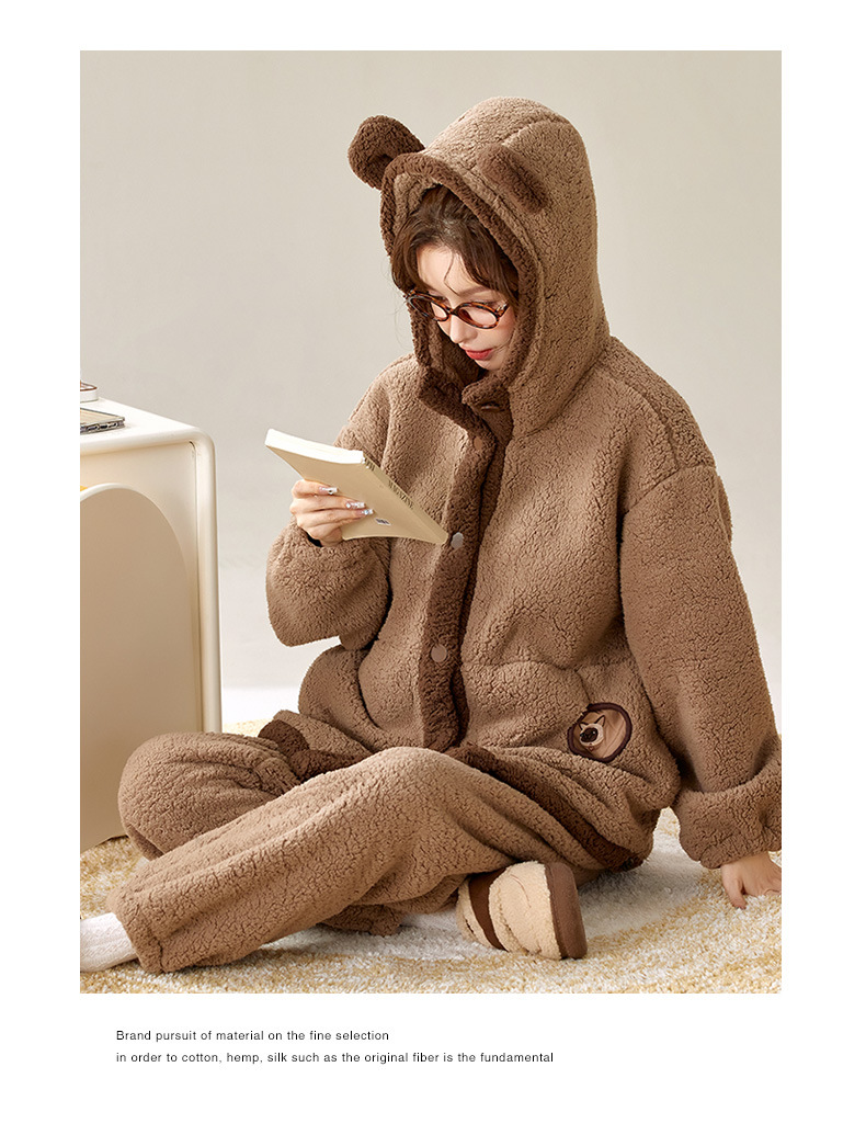 가을과 겨울 양가죽 잠옷 여성 만화 귀여운 후드 자이언트 따뜻한 두꺼운 느슨한 집 옷 세트 겨울