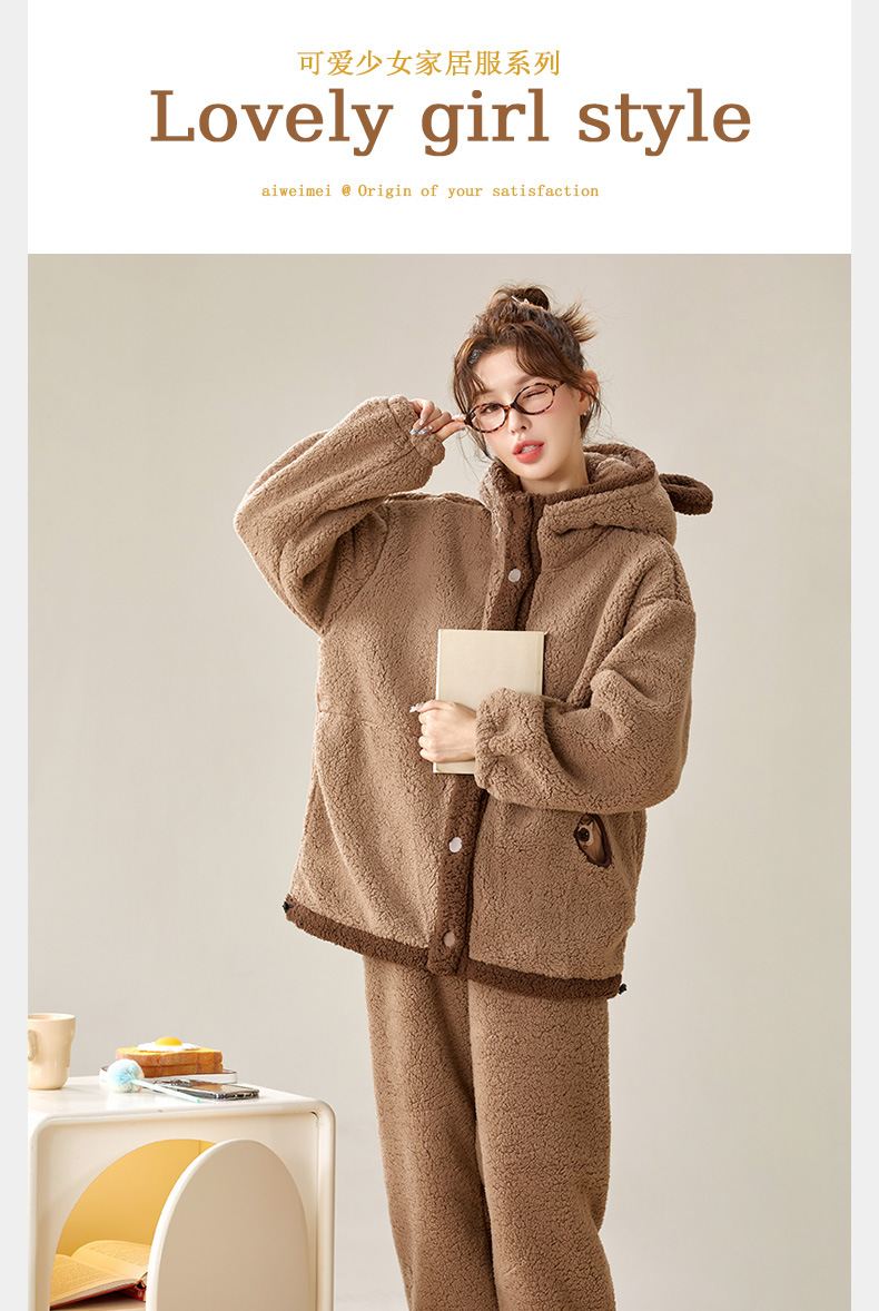 가을과 겨울 양가죽 잠옷 여성 만화 귀여운 후드 자이언트 따뜻한 두꺼운 느슨한 집 옷 세트 겨울스토어 가기
