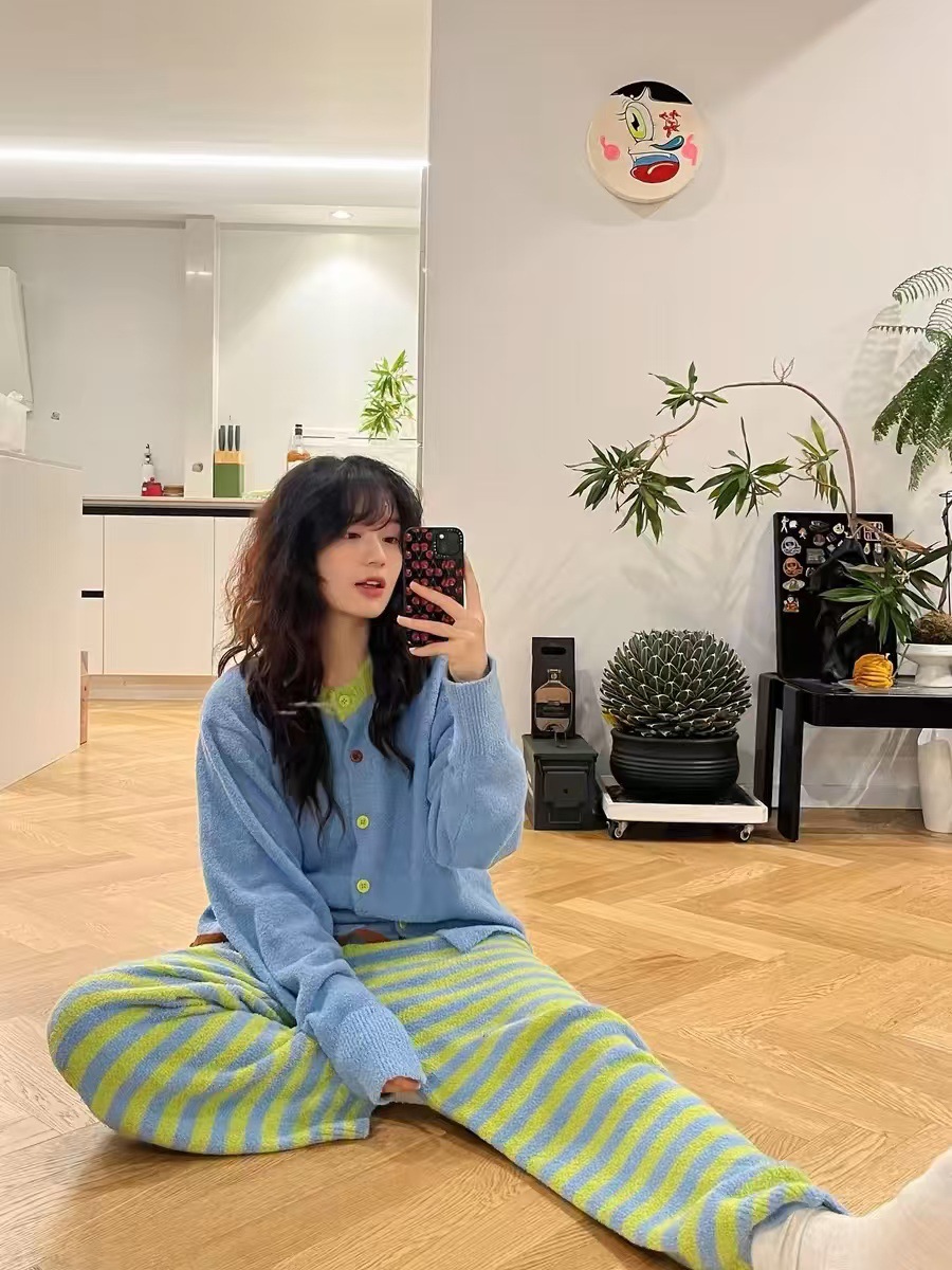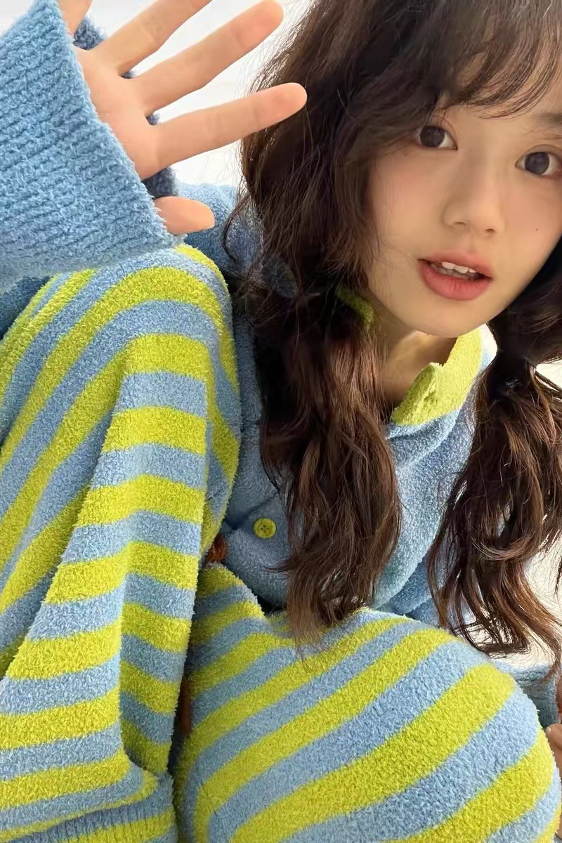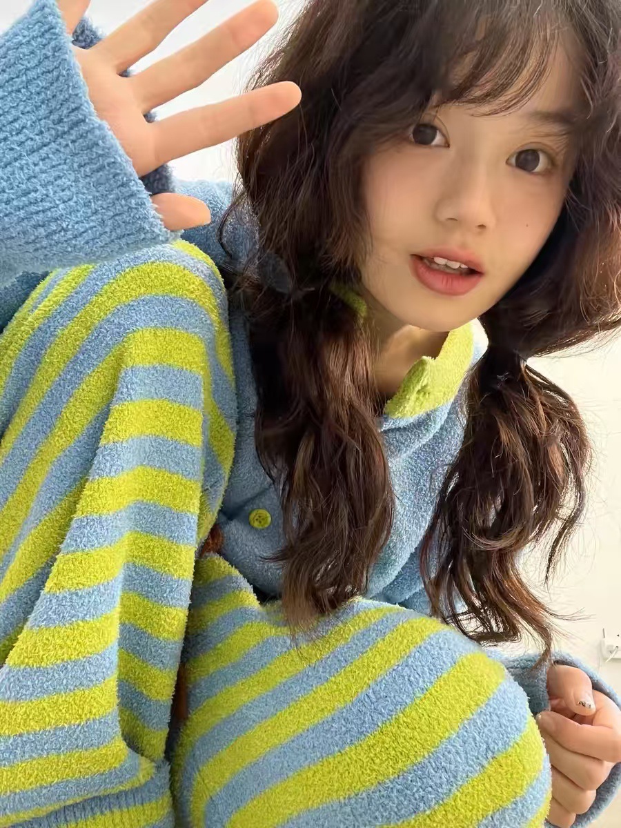[젠베이 벨벳] 한국식 고급 스트라이프 파자마 여성 겨울 새 두껍게 된 봉제 니트 홈웨어스토어 가기