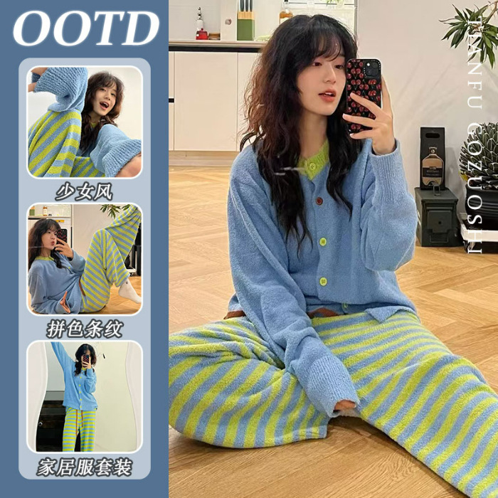 [젠베이 벨벳] 한국식 고급 스트라이프 파자마 여성 겨울 새 두껍게 된 봉제 니트 홈웨어