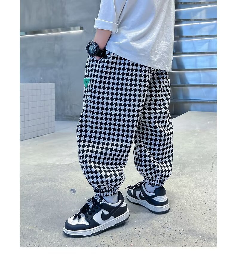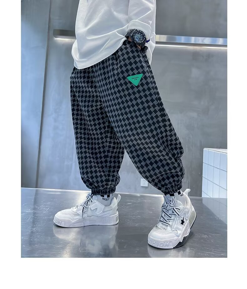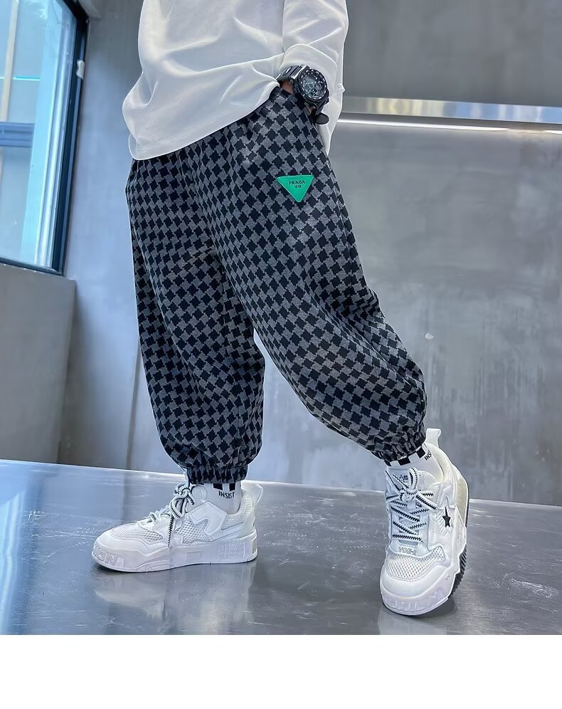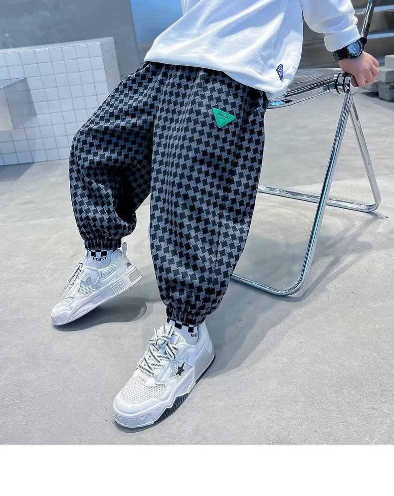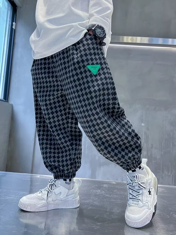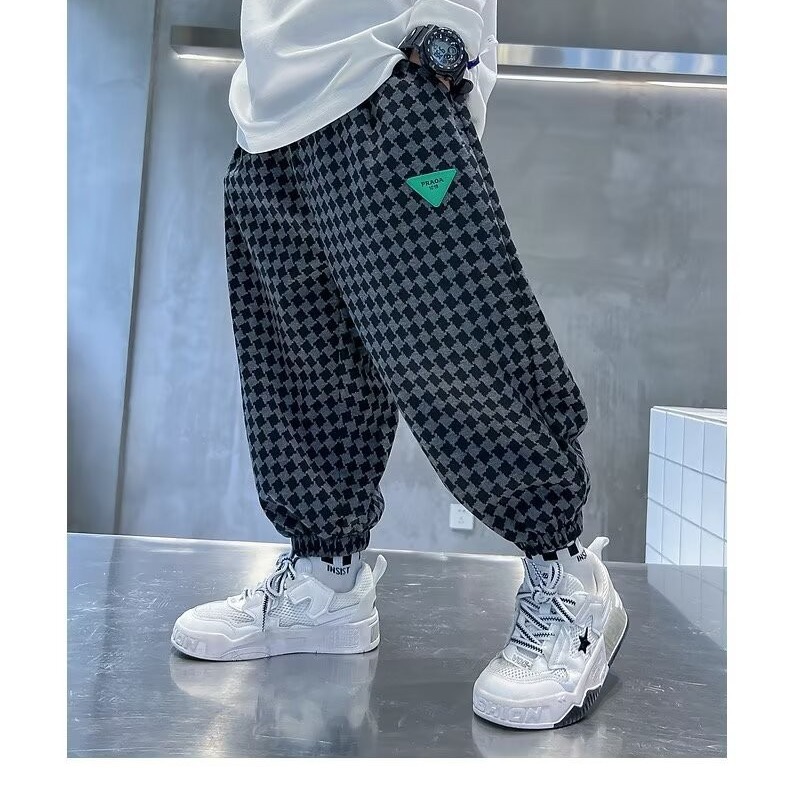 새로운 소년 봄과 가을 잘 생긴 격자 무늬 캐주얼 바지 2024 새로운 어린이 가을 바지 소년 느슨한 바지