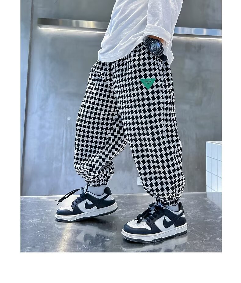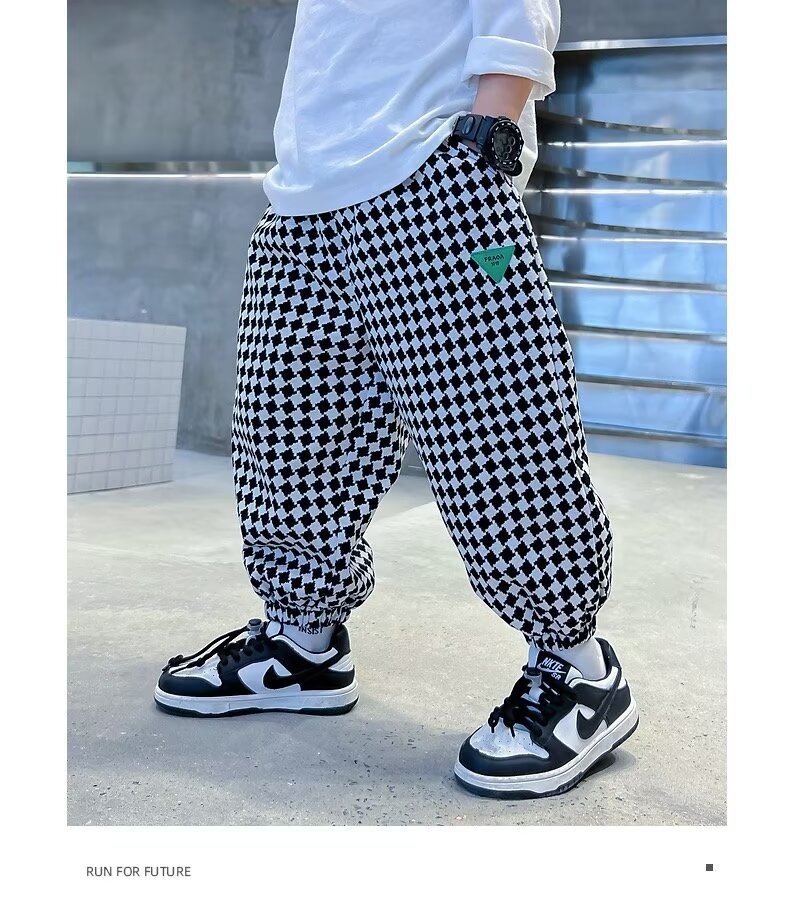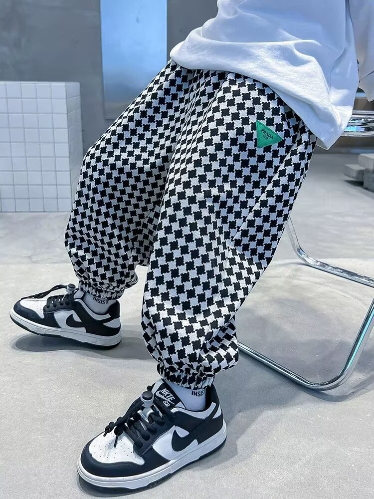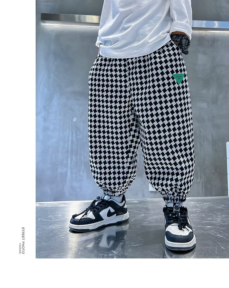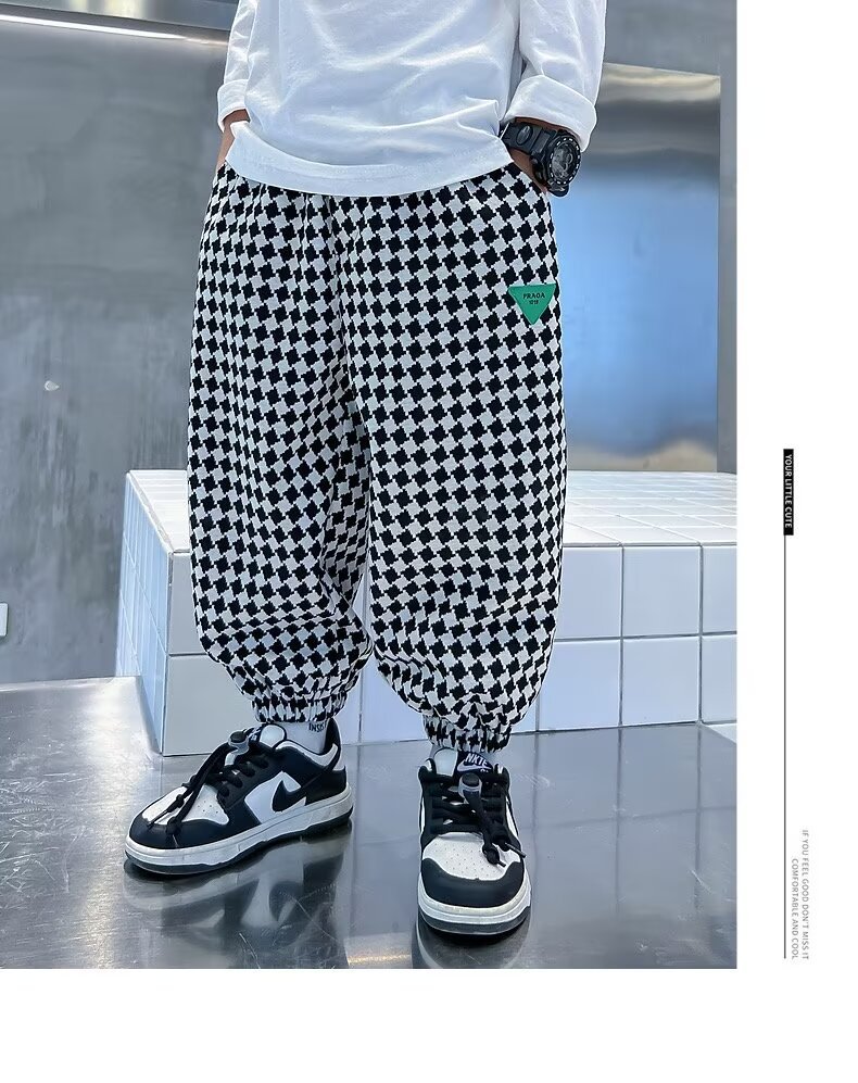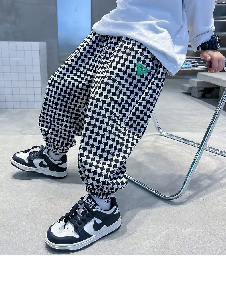 새로운 소년 봄과 가을 잘 생긴 격자 무늬 캐주얼 바지 2024 새로운 어린이 가을 바지 소년 느슨한 바지