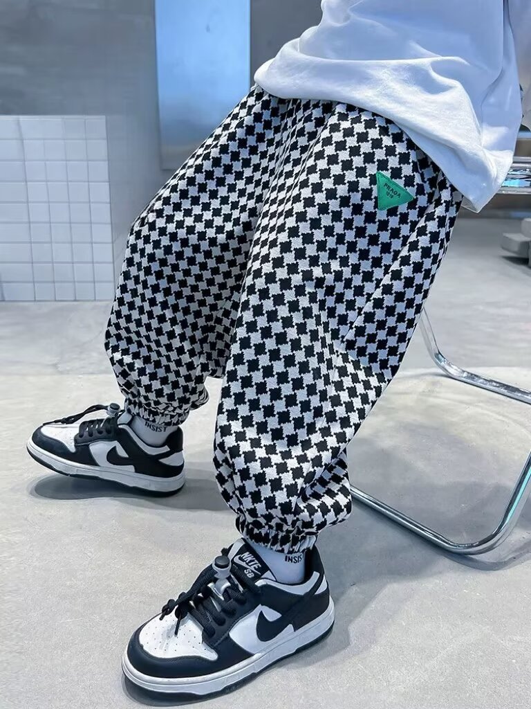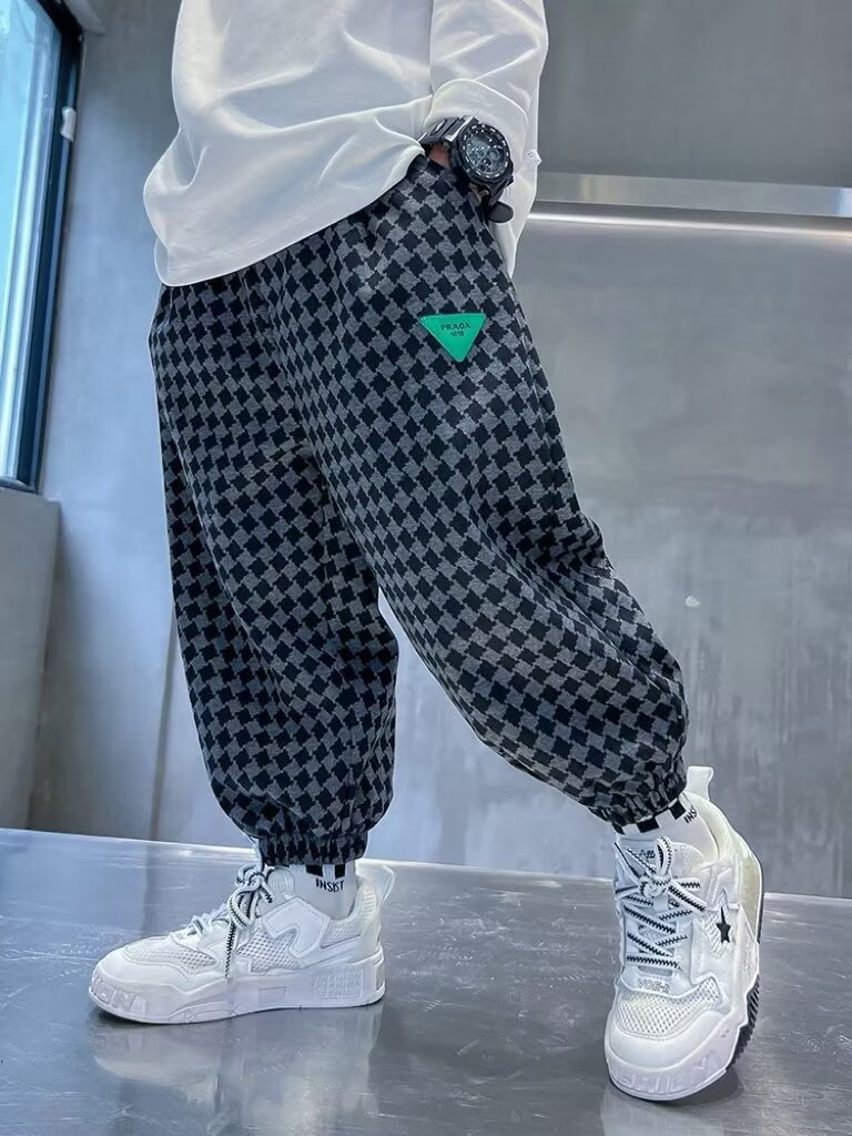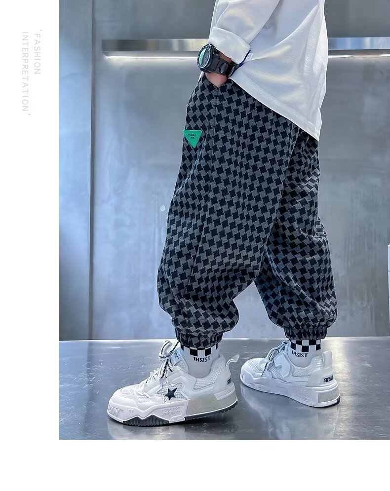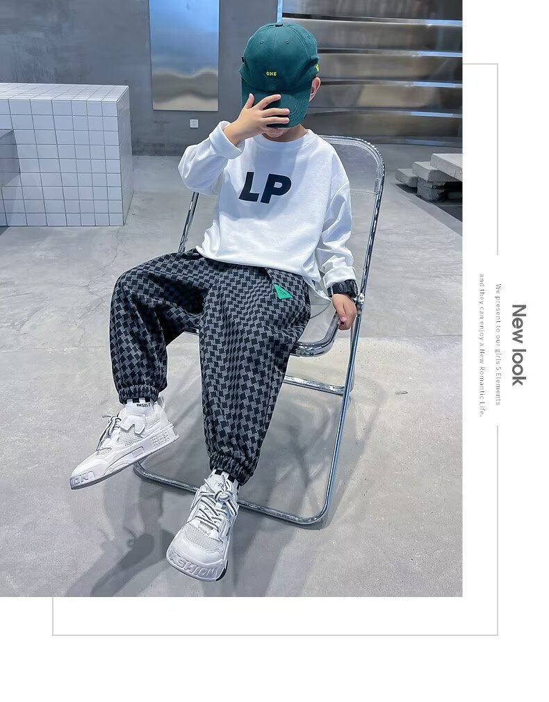 새로운 소년 봄과 가을 잘 생긴 격자 무늬 캐주얼 바지 2024 새로운 어린이 가을 바지 소년 느슨한 바지스토어 가기