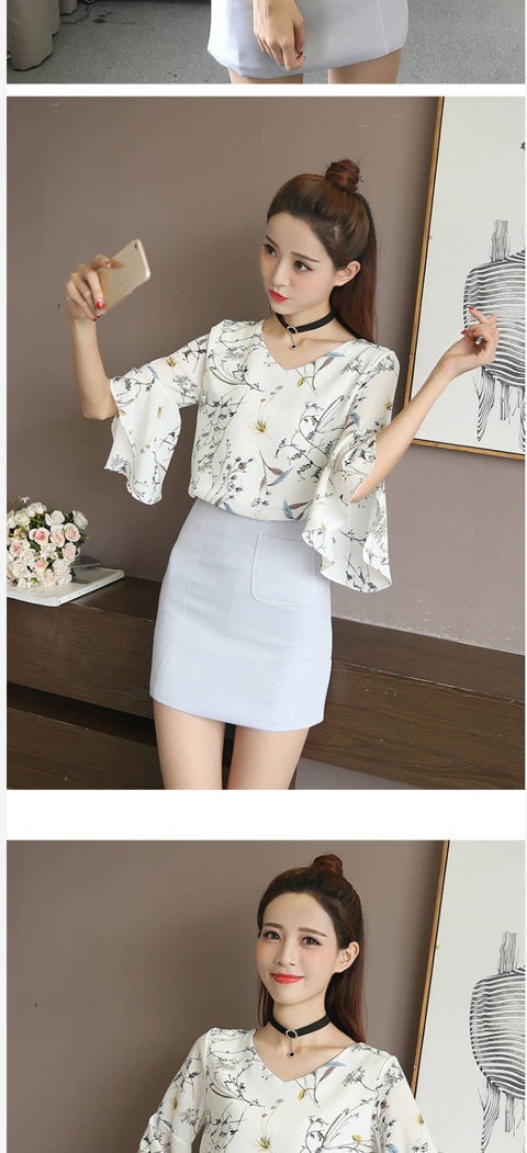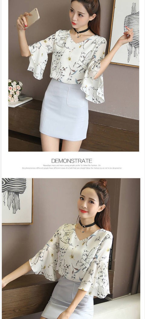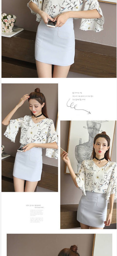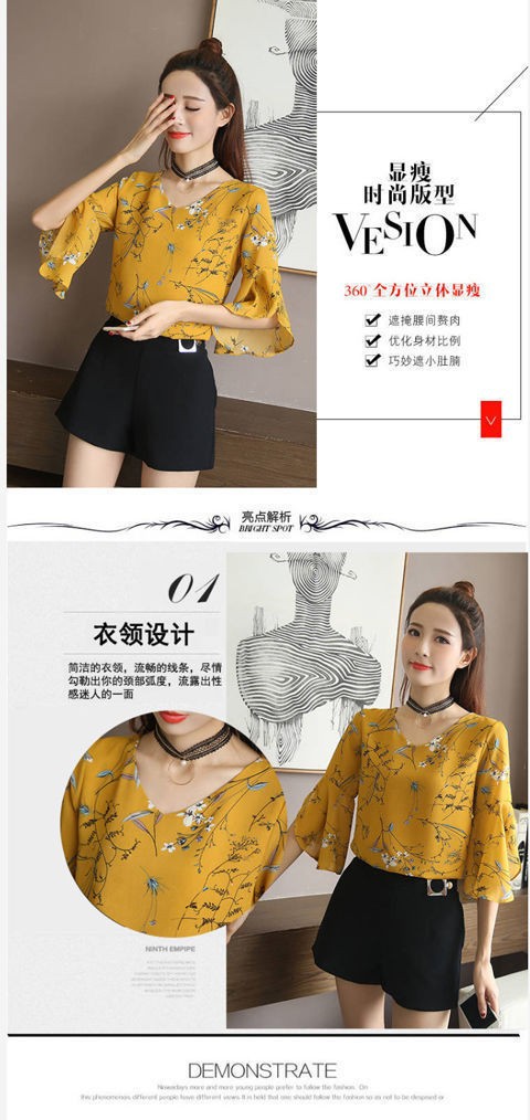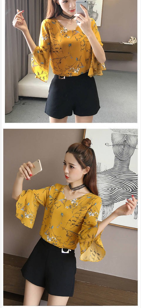 2021 년 봄과 여름 여성의 새로운 반팔 쉬폰 셔츠 브이넥 탑 트럼펫 슬리브 슈퍼 페어리 슬림베이스 셔츠스토어 가기