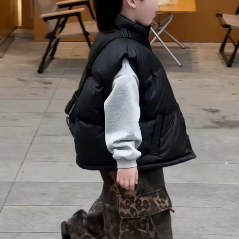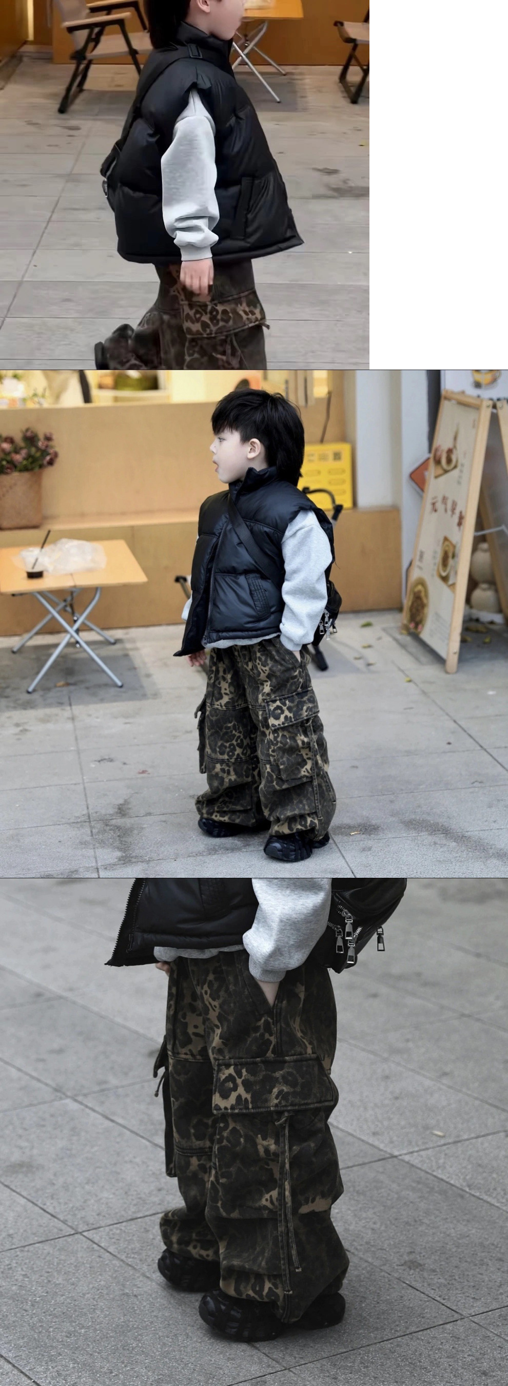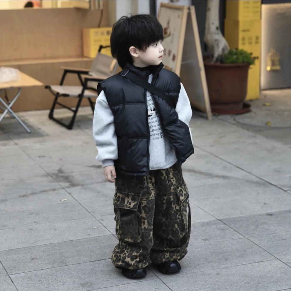 男童保暖手工棉马甲加绒豹纹裤子儿童两件套2024秋冬套装